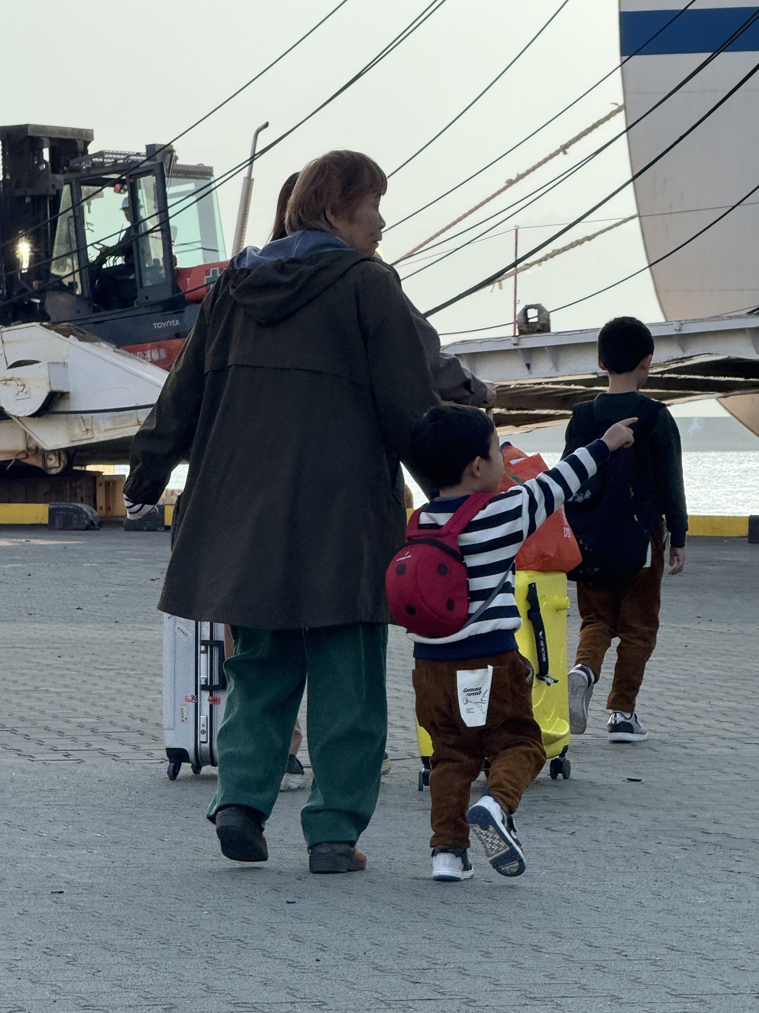 A beautiful morning. The big job is loading the ferry with trucks and containers bringing supplies to the island. Due to the design of this very old ferry, all trucks and vehicles must back on. Interesting to watch this frenetic activity. We think the cars and our trikes are the smallest part of the load. We will be last to load.