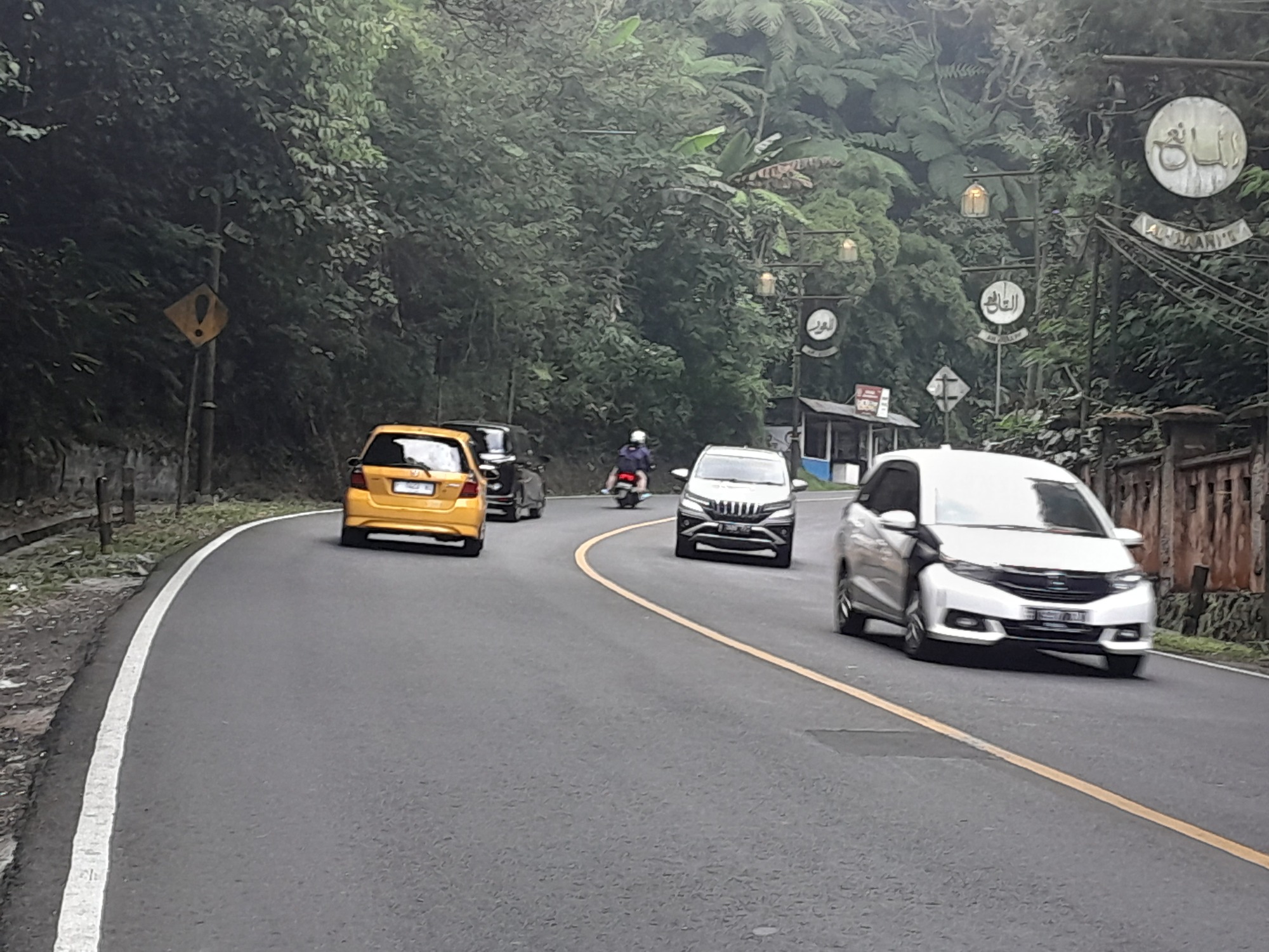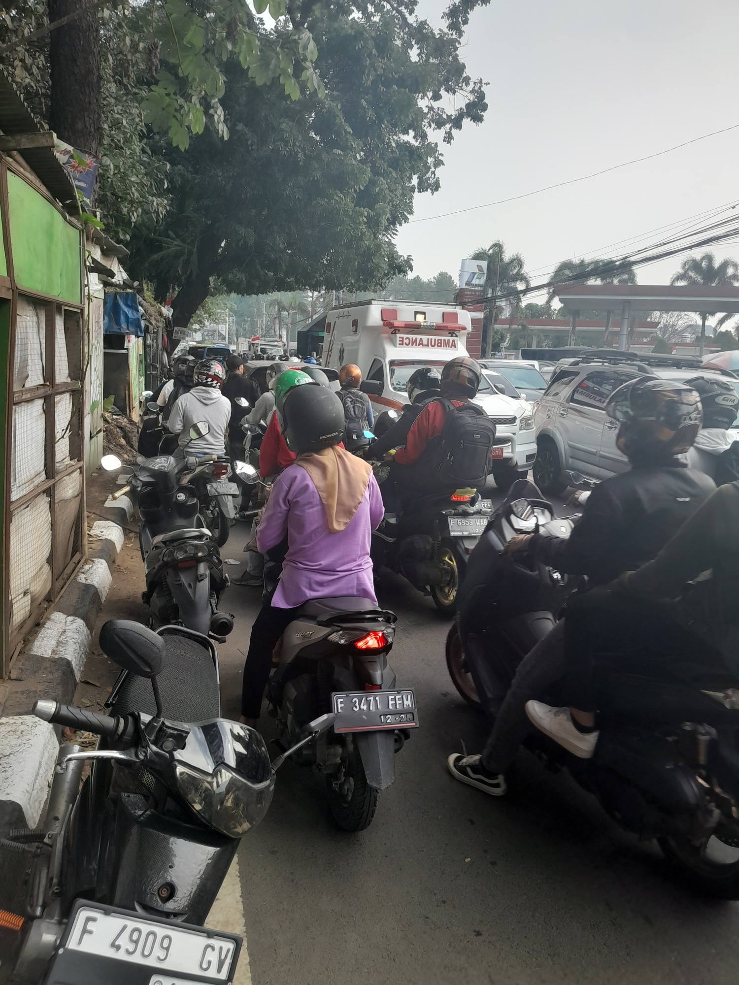 There was a simple cause to this traffic jam. It wasn't anything like a crash. It was simply a weekend thing - thousands of people going up to the pass from greater Jakarta. The cause of the traffic jam was them returning. I was going in the right direction; 90% of vehicles were heading west. This created a great example of the "tragedy of the commons". Those traveling west simply take over the road. It's easy when it's mainly motorcycles coming towards your car! It was tragic in another way: I saw a pile up of motorcycles forced from the road. There were no injuries, but there was a lot of damage.