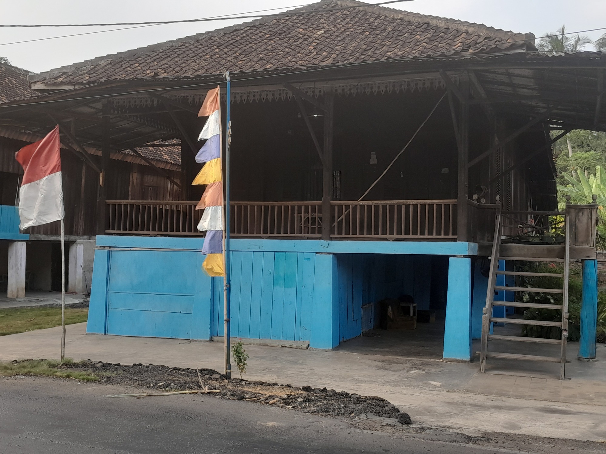 An amusing thing about Indonesia is that if, as a single person, you pay for a room that's for two, they give you two breakfast tickets. That's terrific for the touring cyclist. The breakfast here is nasi goreng with a couple of eggs, outside on a terrace overlooking the city. Each serving has two stone-cold fried eggs. Why cold, I don't know! Three eggs was enough for me; I gave the other to a heavily pregnant cat. That will surprise people who know me!