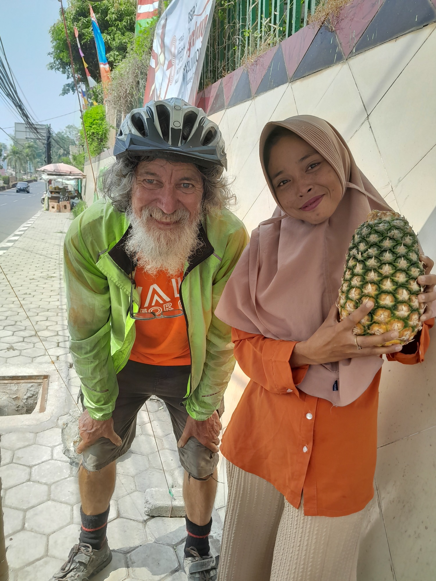 After an hour, I was hot and had 10 km to show for it. You stay much cooler in the tropics by keeping a good speed. Vendors were selling pineapples and I couldn't resist. I chose the right vendor - not only did she want to be photographed but she also directed the proceedings. I might add that the pineapples are brilliant.