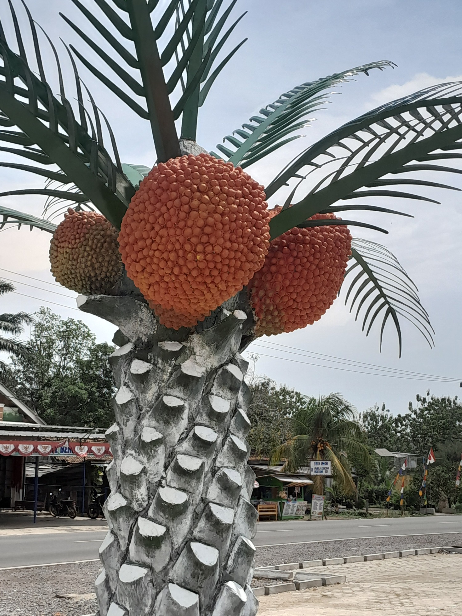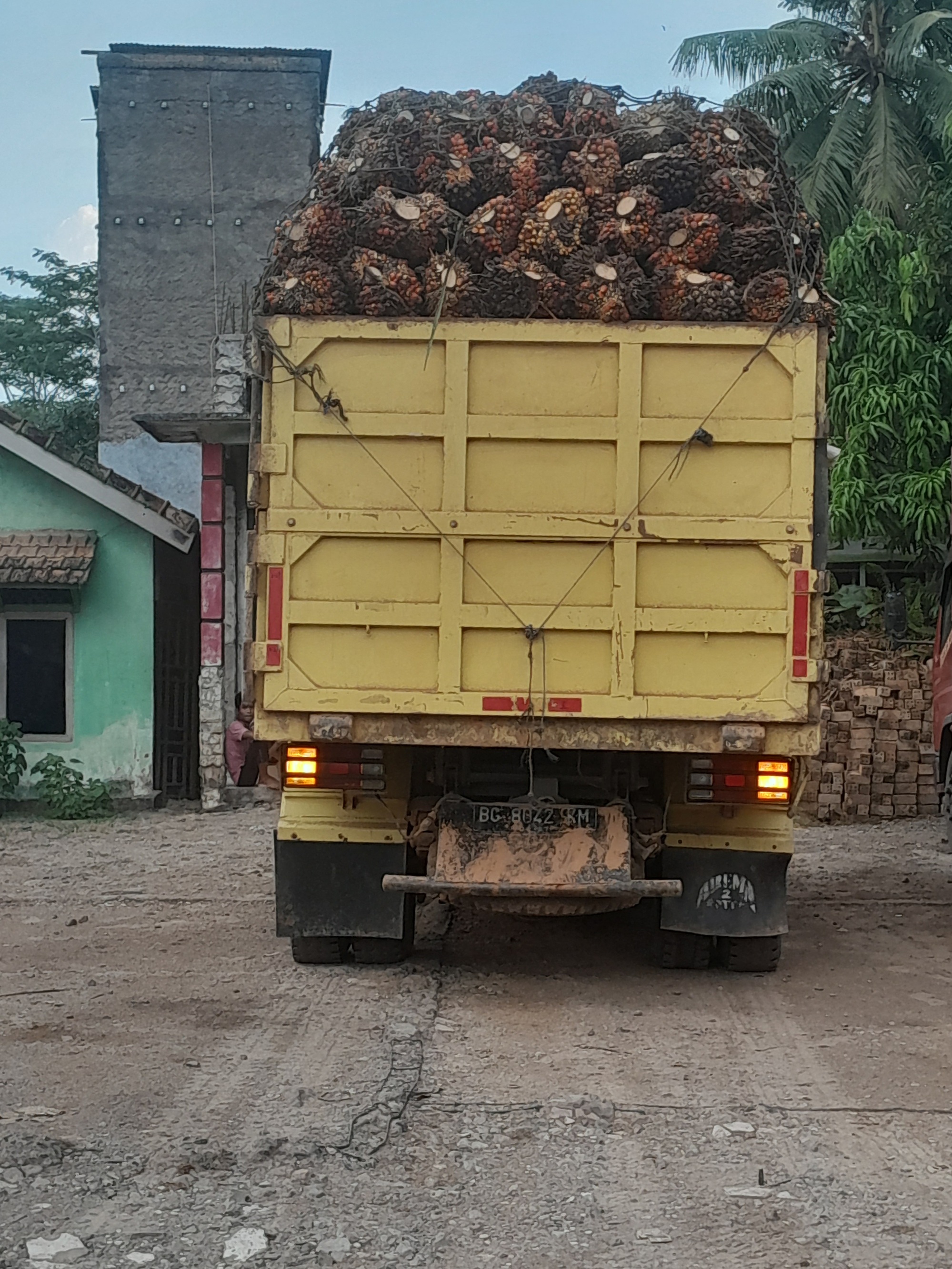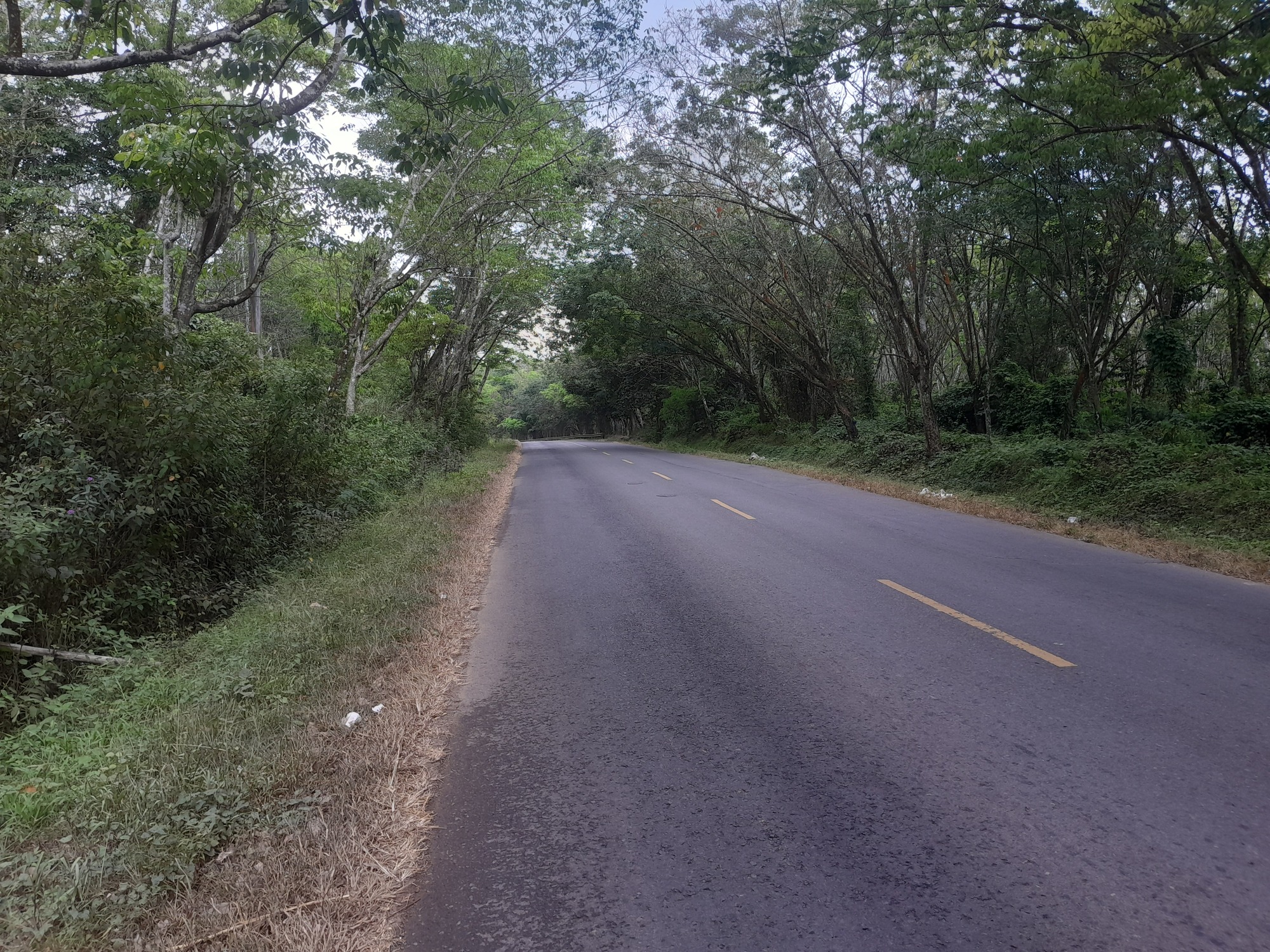 After 40 km, the road changed completely; it became quiet for about 50 km and the surface improved. The reason was obvious, if you looked: beyond the facade of roadside vegetation, lay vast plantations of rubber and coffee. Occasionally, a road led to a processing plant. Villages were few. Every so often, I saw a motorcycle loaded with palm fruits but usually it was trucks.