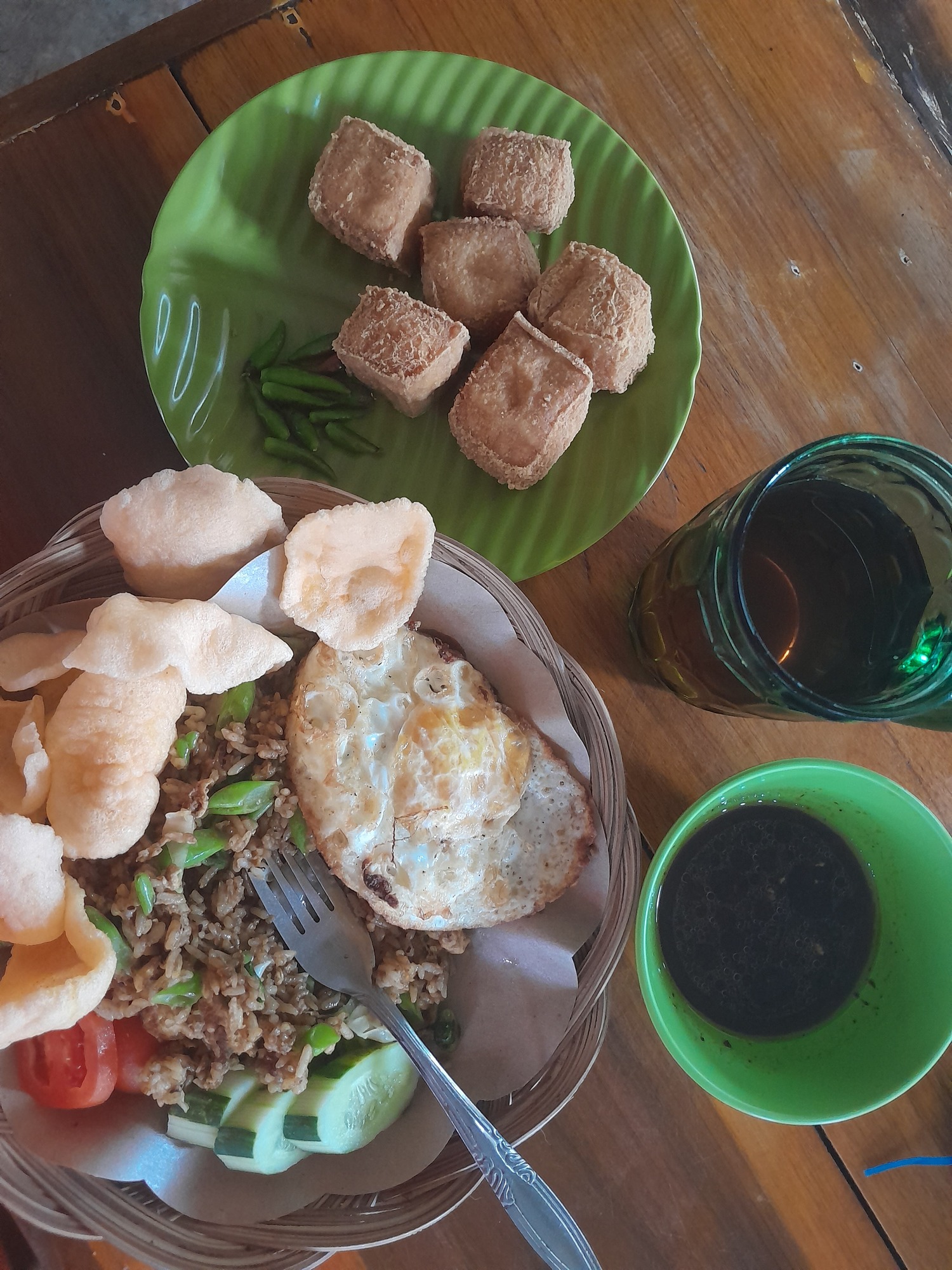 This time I was prepared: I ordered nasi goreng and gave them a handful of beans to toss in. I had forgotten about the tofu but a plate arrived anyway, with a steaming hot nasi.