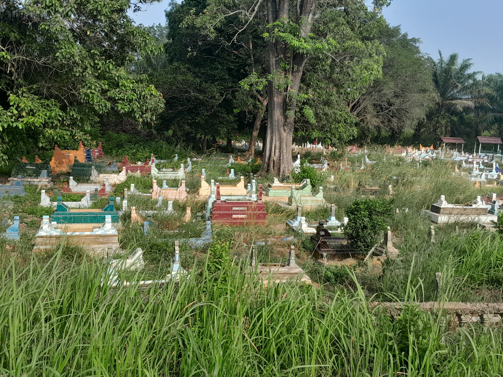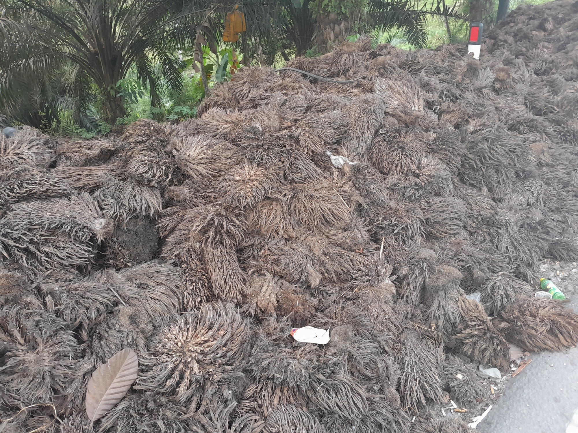 I ducked into a rubber plantation to escape the heat while having a drink and a couple of banana cold dogs. It was 9.30 and the day had heated quickly and was glaringly bright. This caught me out when I stopped to examine some palm fruits. I couldn't see the so I guessed!