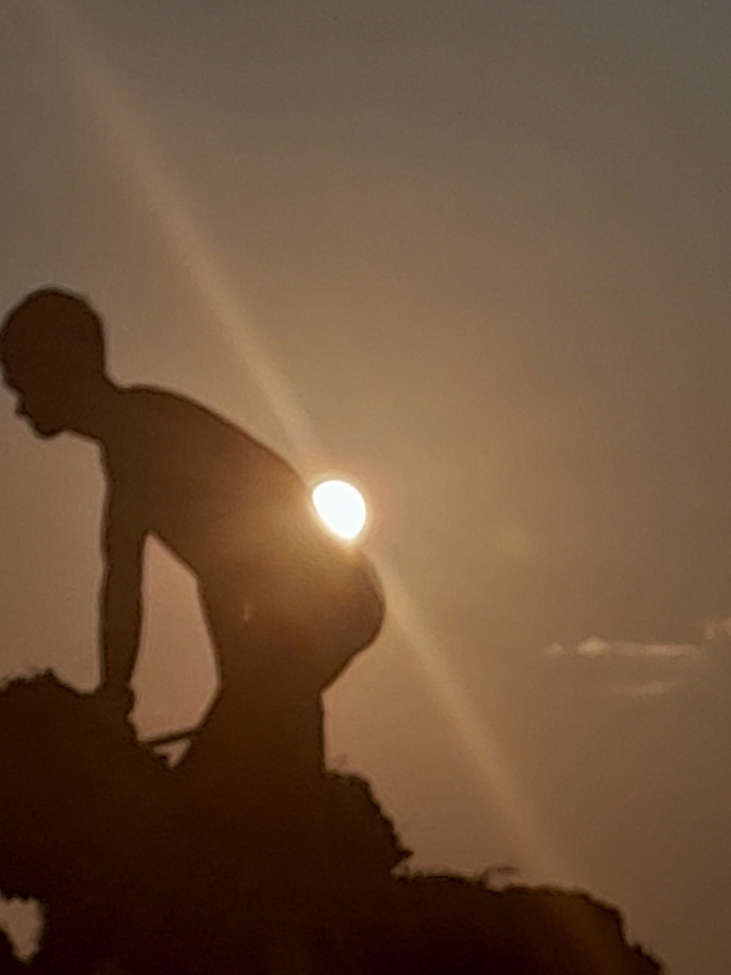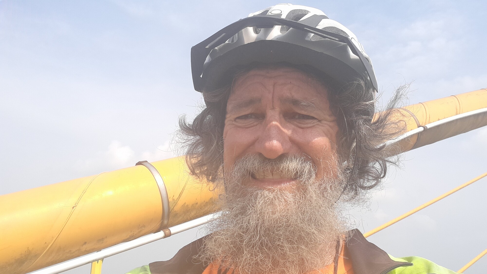I stopped after 25 km to regroup, which I did in the shade of palms amidst a pile of garbage. This prompted me to ask Cora to try to get me an air ticket. She cheered me up with a photo of you know who.