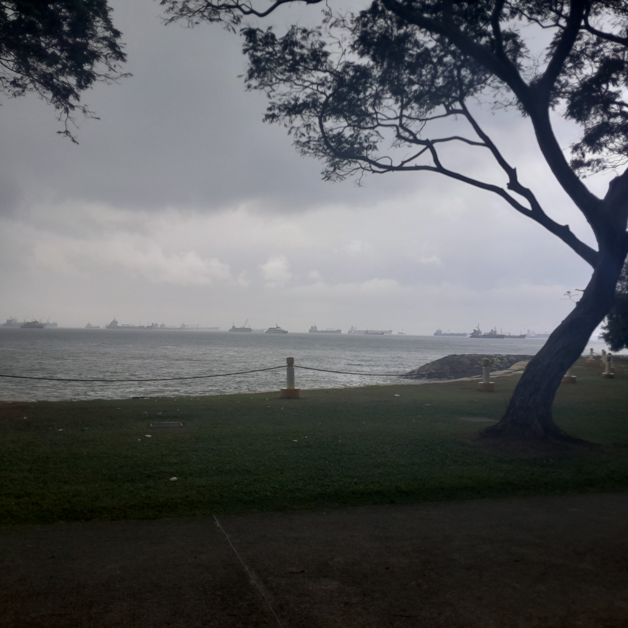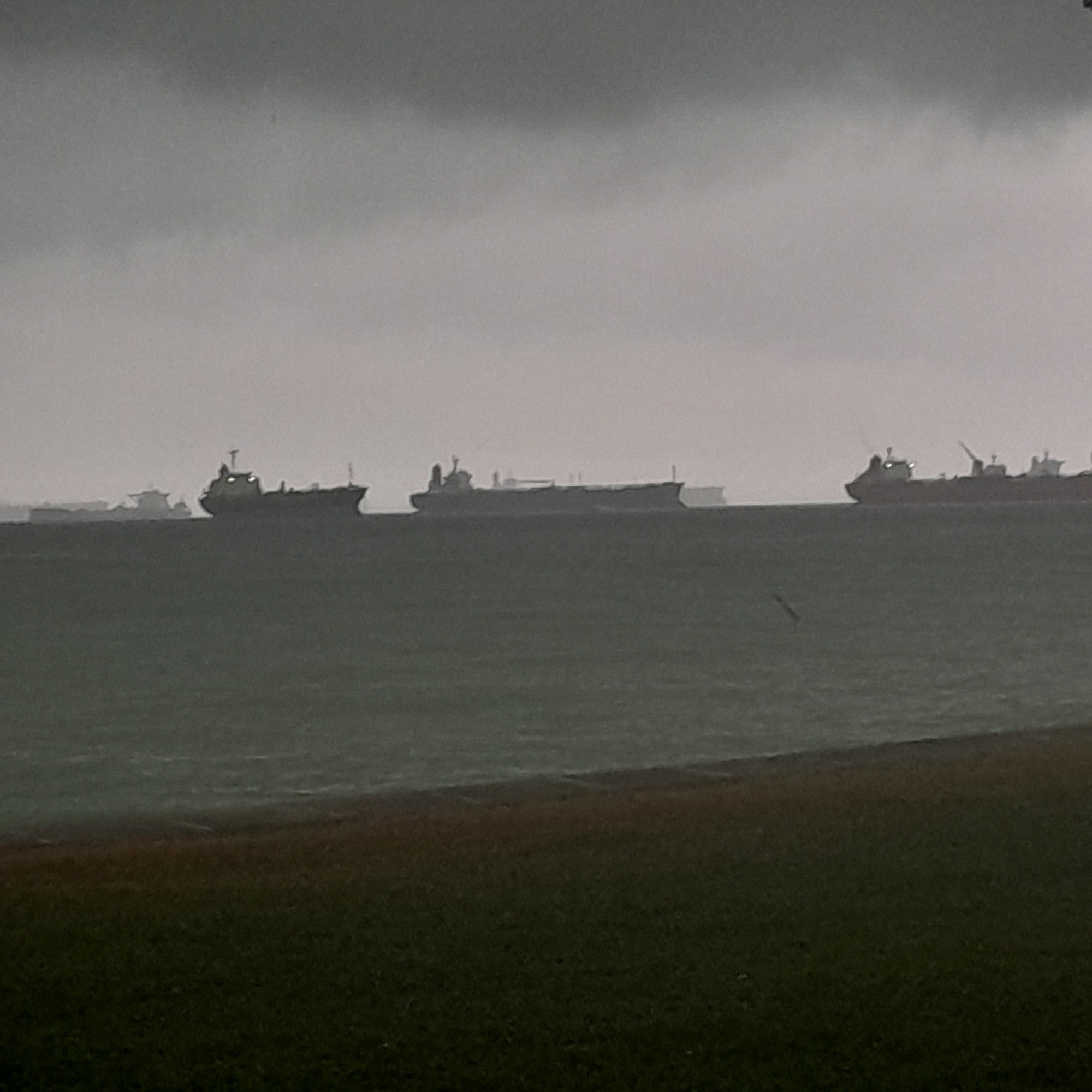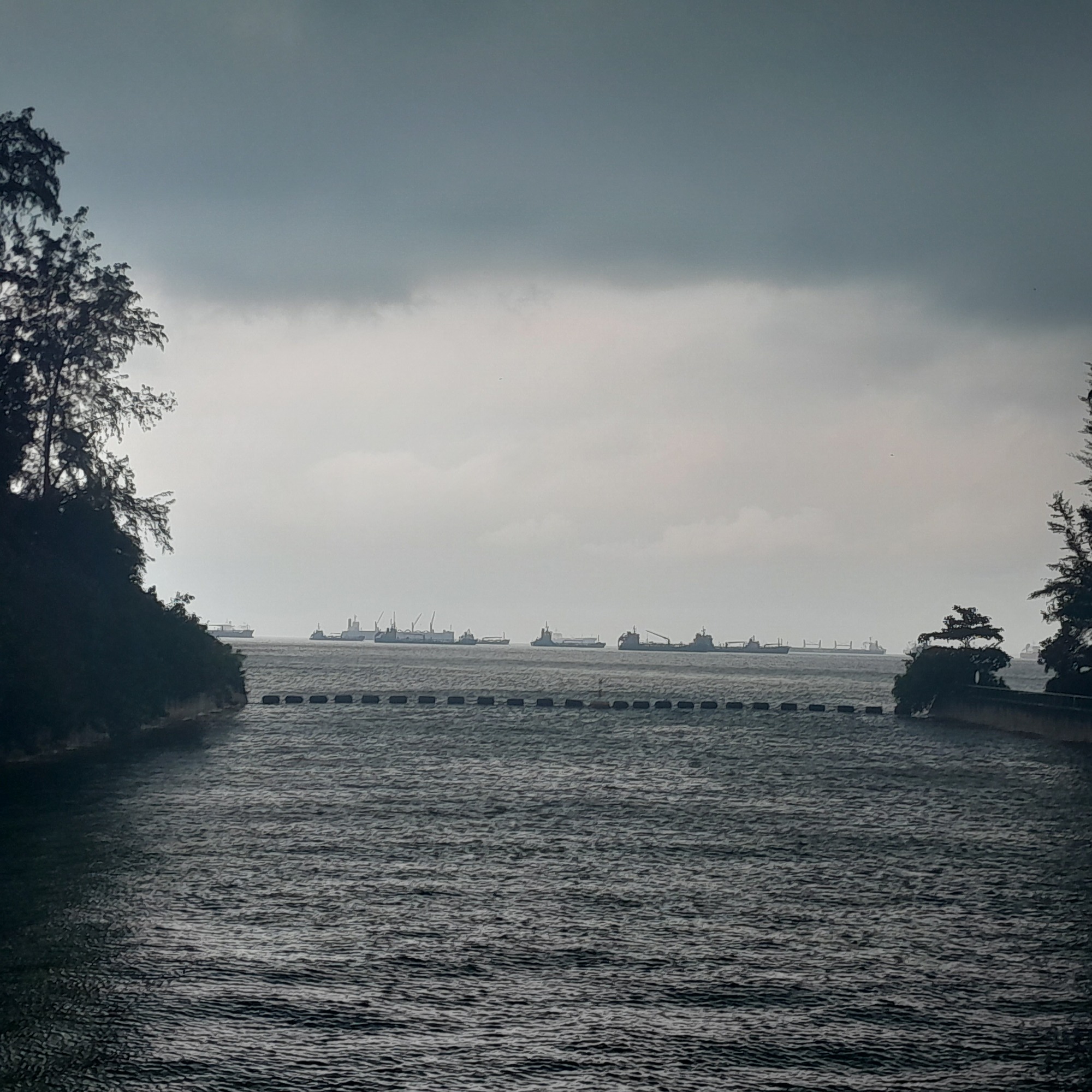Singapore's a dark line on that turbid ocean under the same grey sky. A better indication that you're close is the sheer volume of ships. There are millions of tons sitting offshore.