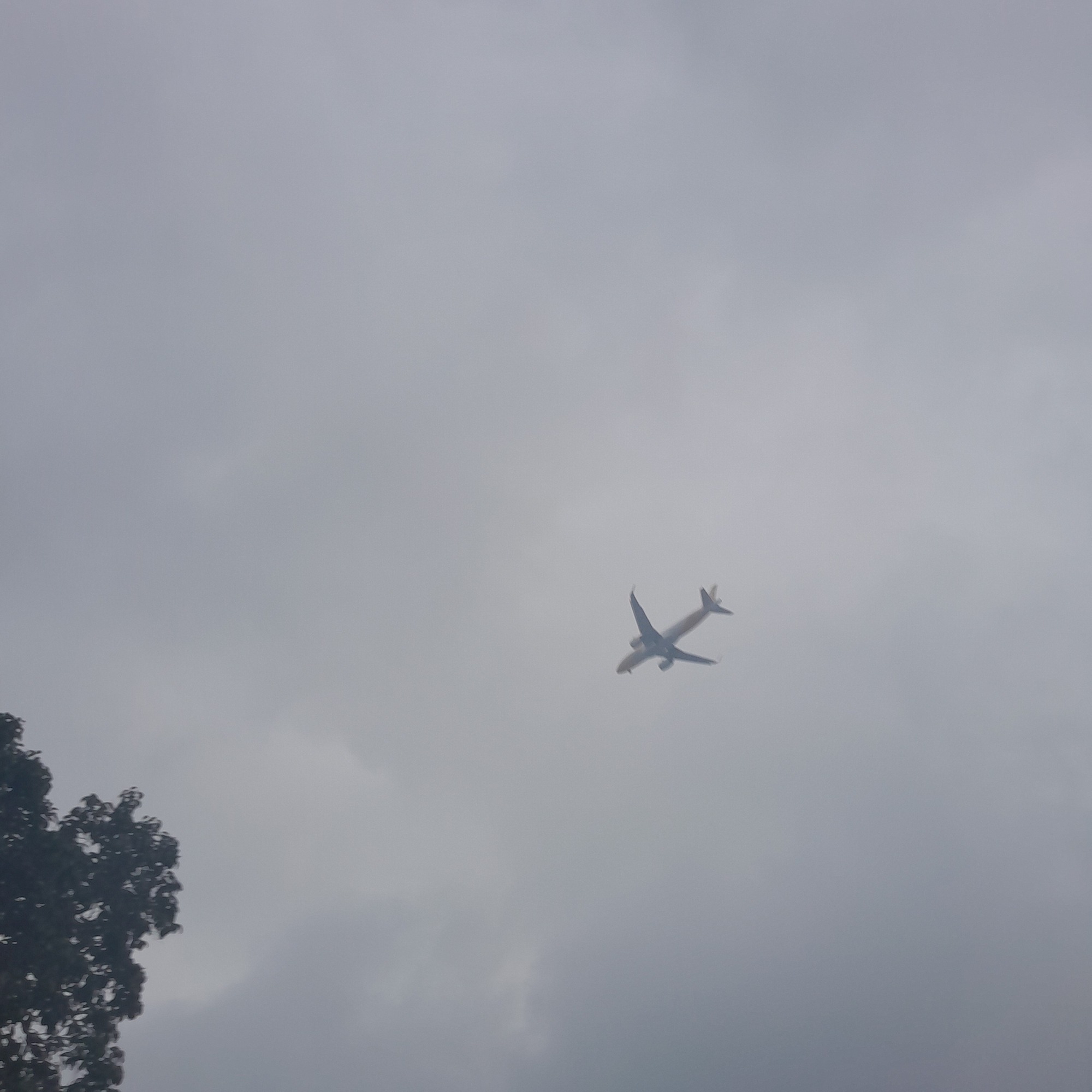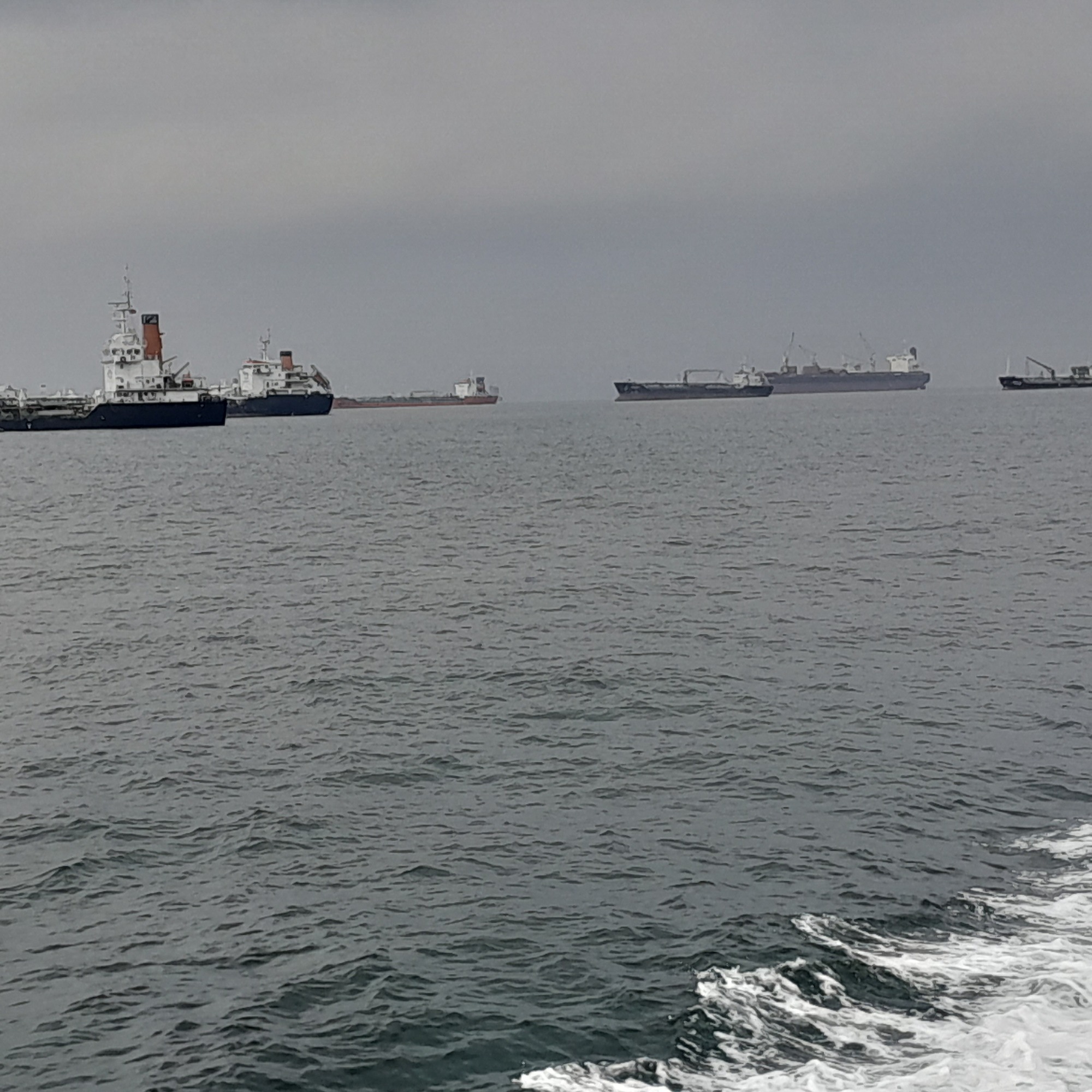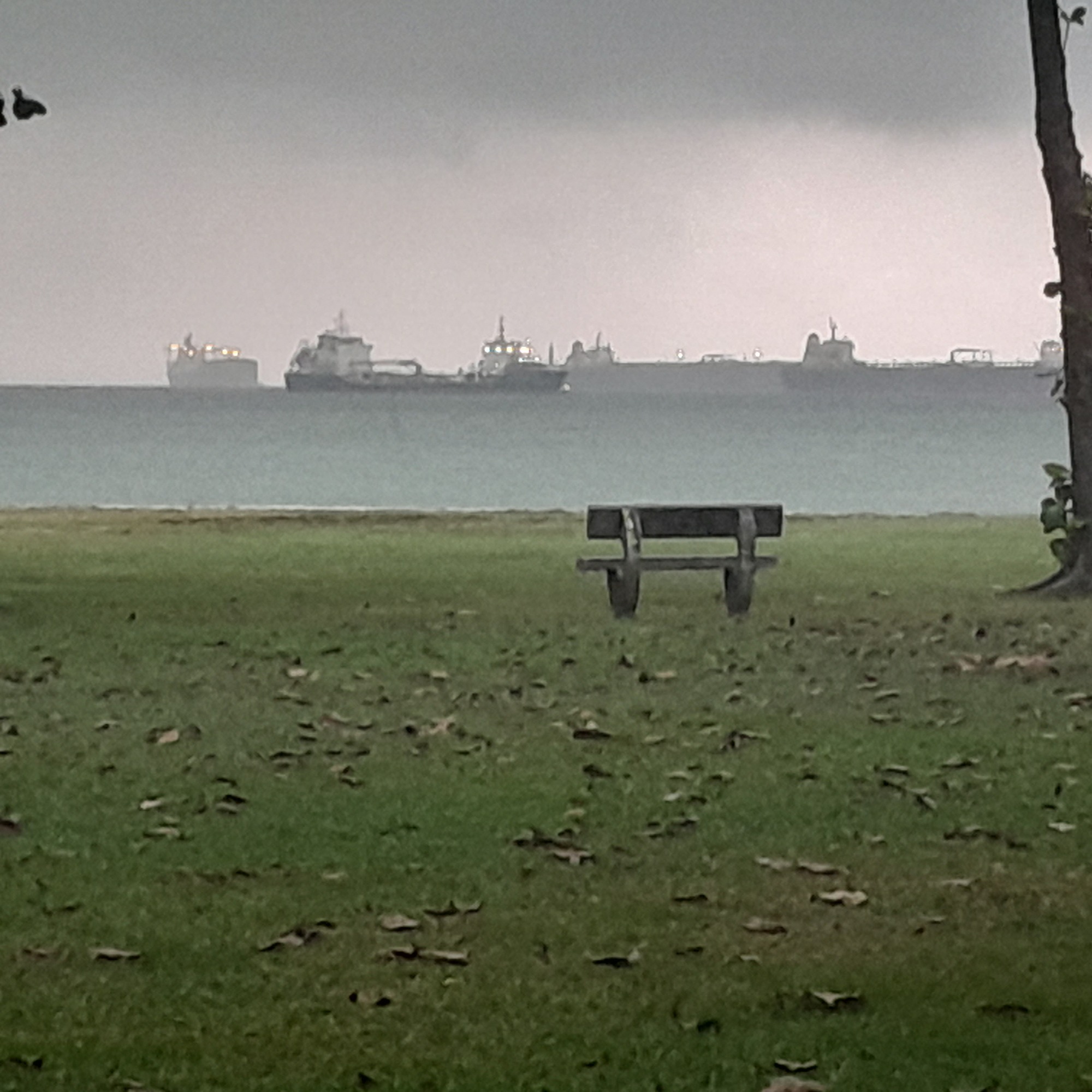 Singapore's a dark line on that turbid ocean under the same grey sky. A better indication that you're close is the sheer volume of ships. There are millions of tons sitting offshore.