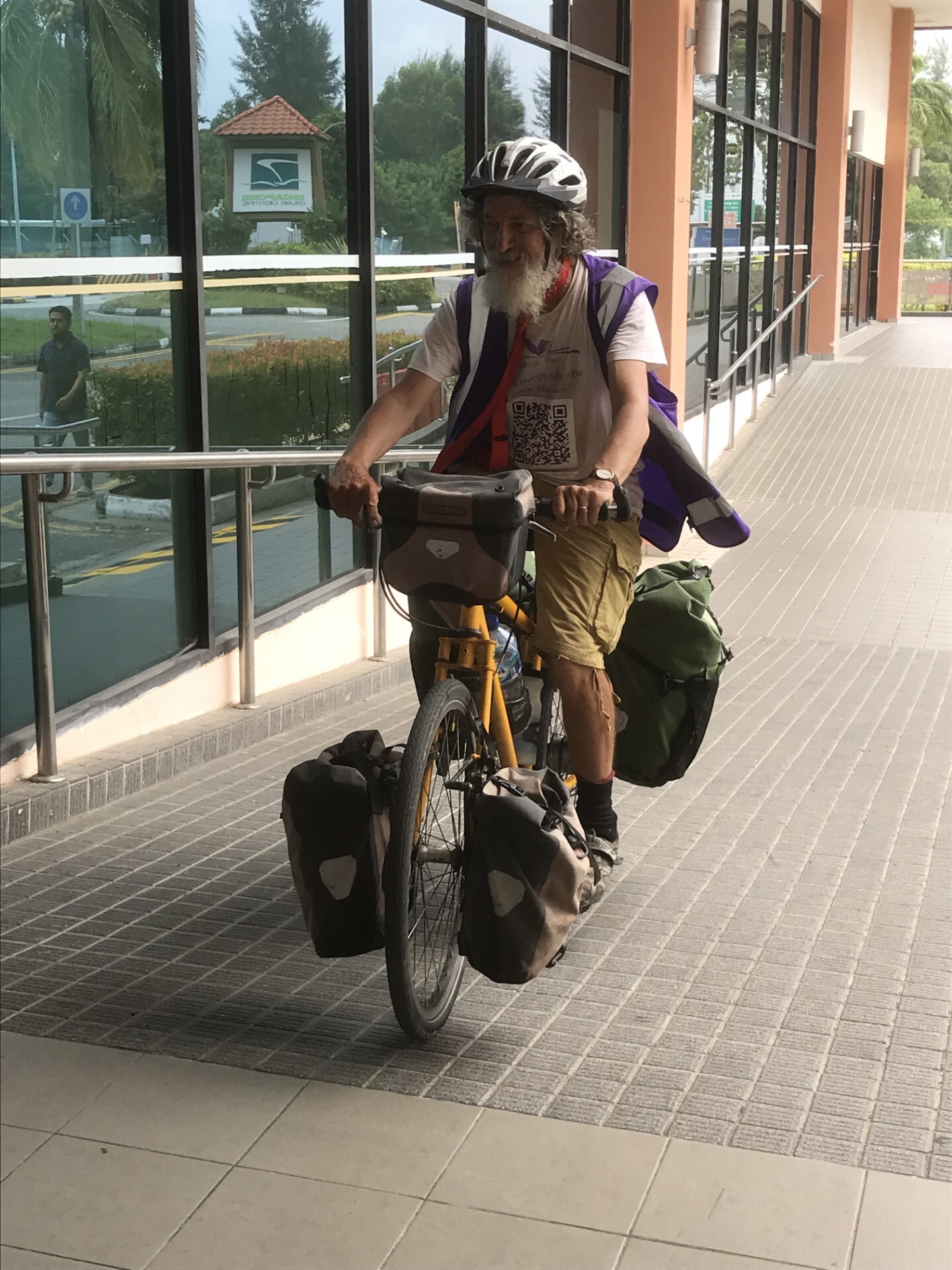 I removed my bags from my bike and put them through x-ray. I didn't have to open anything; people were pleasant and helpful. I then wheeled my bike into a sparsely populated arrivals hall and that was it. I had cycled from home in Canberra to Singapore.