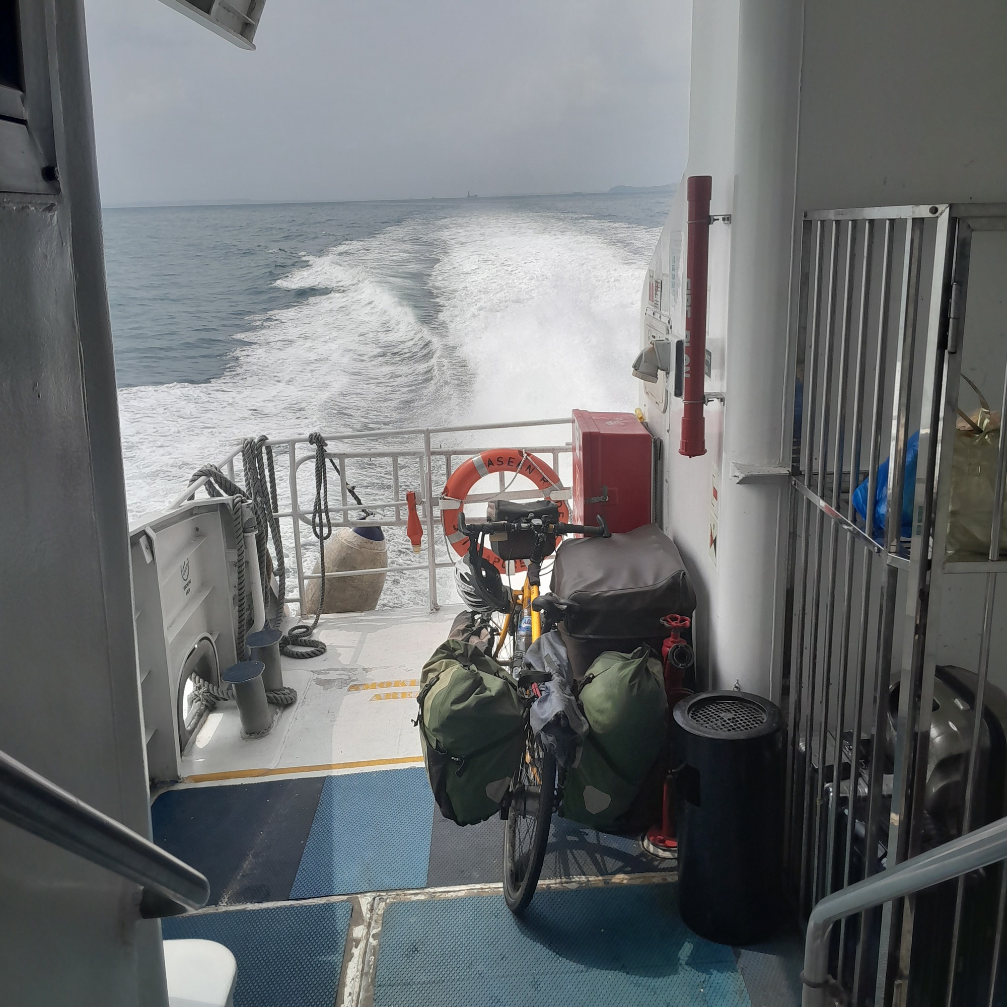 At the port, I went through all of the usual rigmarole of leaving a country. It's just that bit stranger when you're jumping on a boat that skims across a waterway in 45 minutes. Having a bicycle makes it that much harder dealing with passports, boarding passes and phones. I'm surprised that I still have any of them.