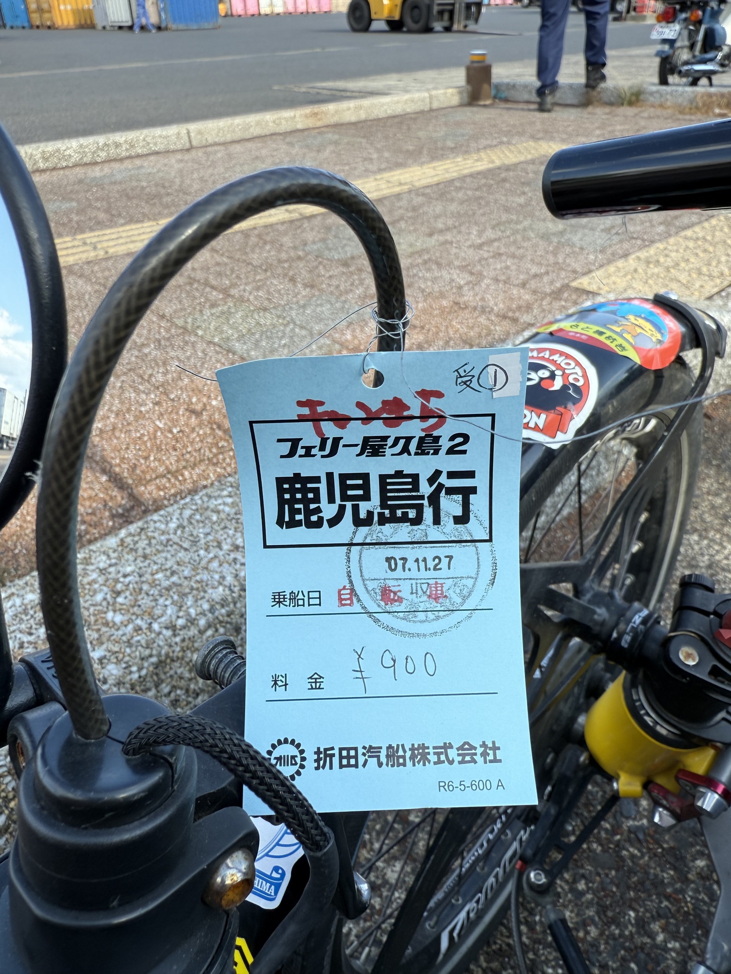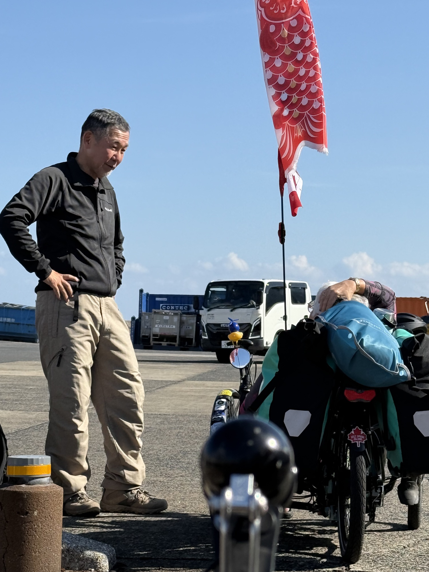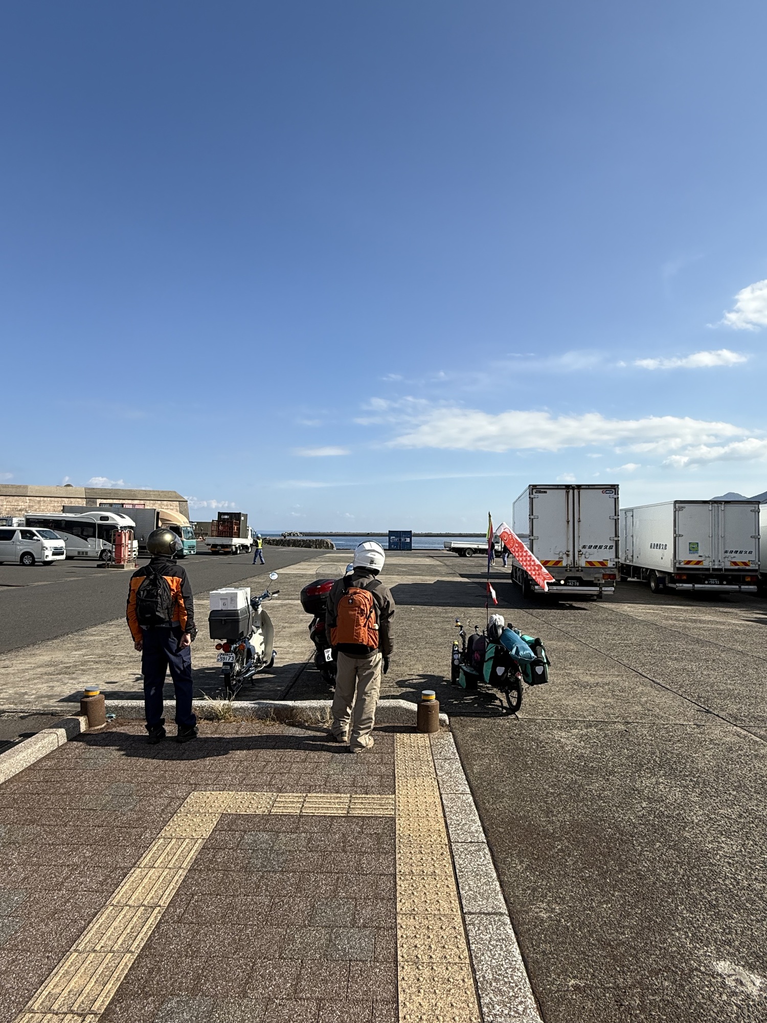 Waiting at the ferry with fingers crossed. We are hopeful that we will get on as there are no other bikes and only 2 motorcycles. This fellow has been touring Yakushima on his motorcycle.