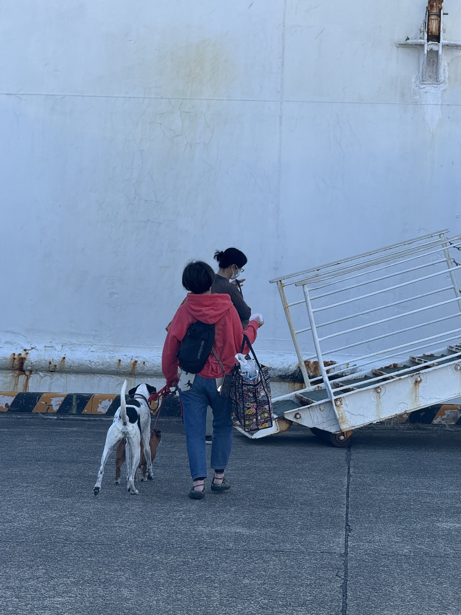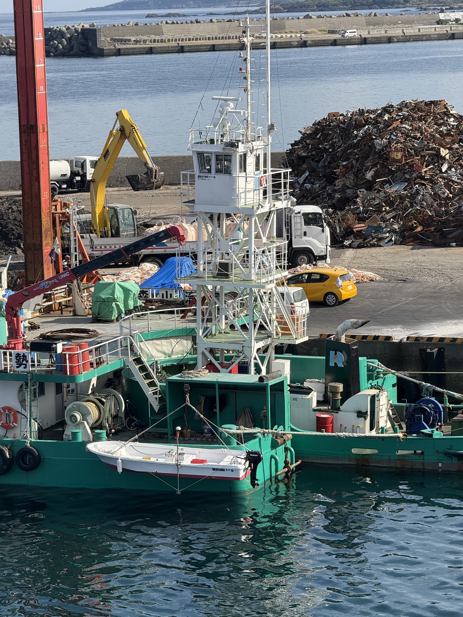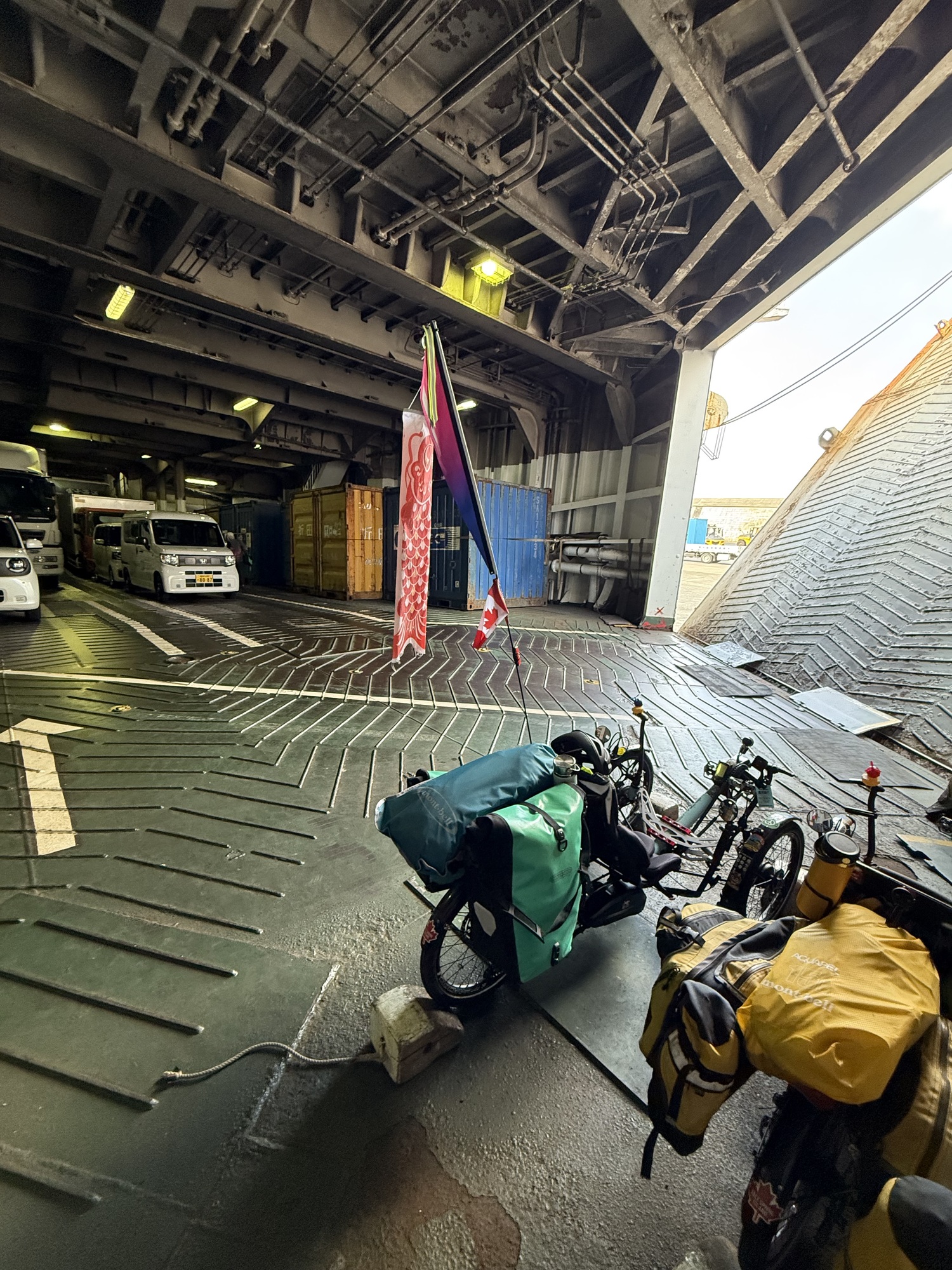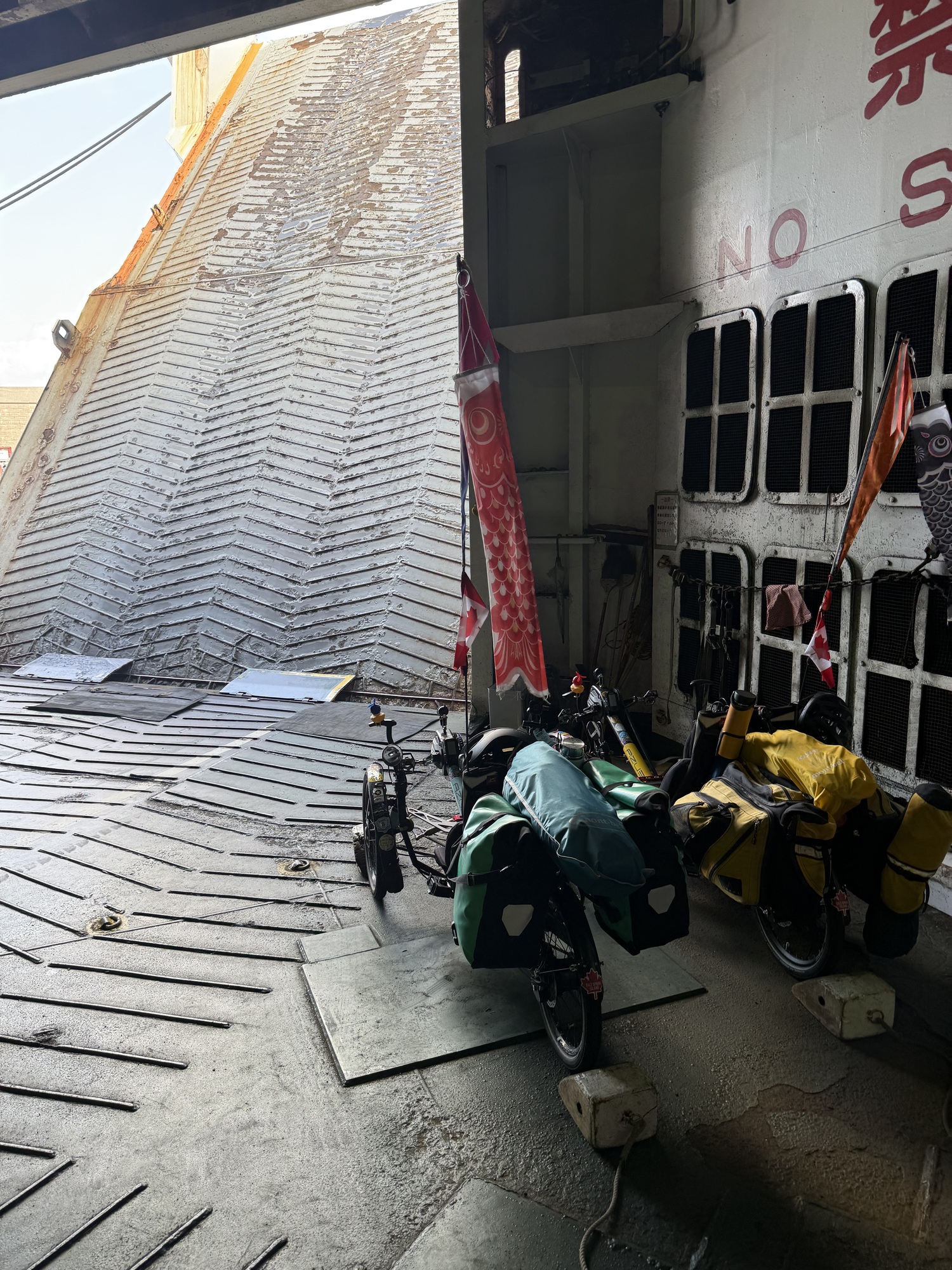 Waiting at the ferry with fingers crossed. We are hopeful that we will get on as there are no other bikes and only 2 motorcycles. This fellow has been touring Yakushima on his motorcycle.
