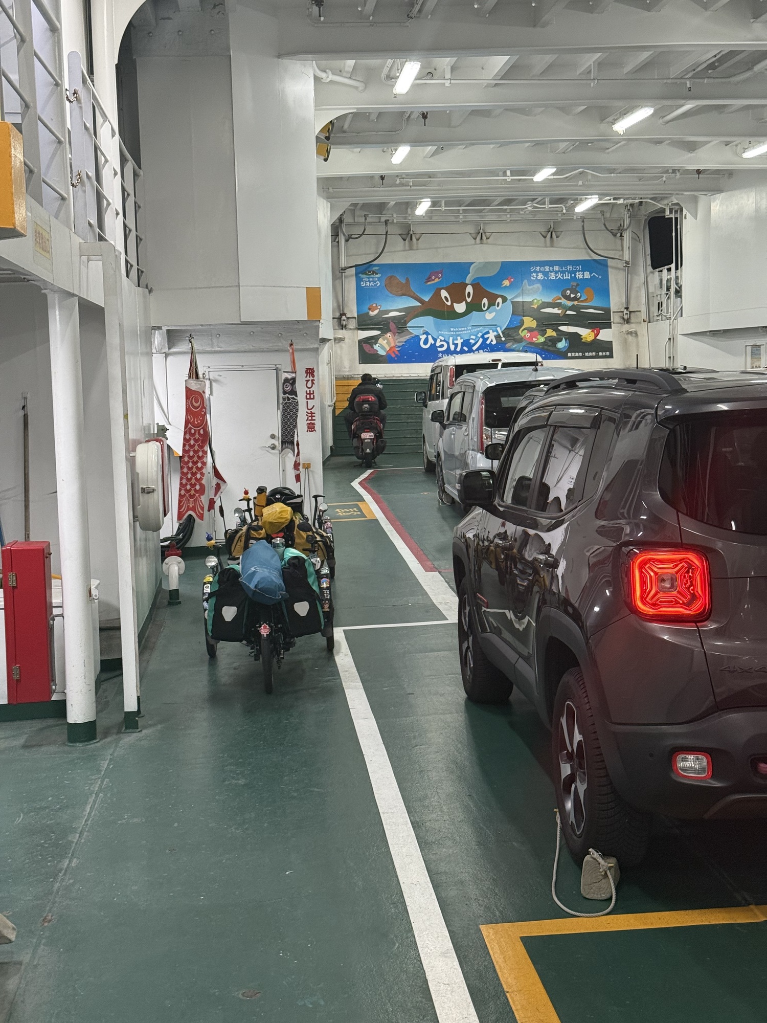 However, we couldn’t figure out why the trip was so short. It stopped at its destination in 10 minutes, and there was no cost. That can’t be right…we went down to the car deck and we tried to ask the crew where we were. It took some patience, but at the same time we all came to the realization that we were on the wrong ferry and everybody had a good laugh. They told us to go back up to the passenger deck and ride back to Kagoshima…still no cost to us.