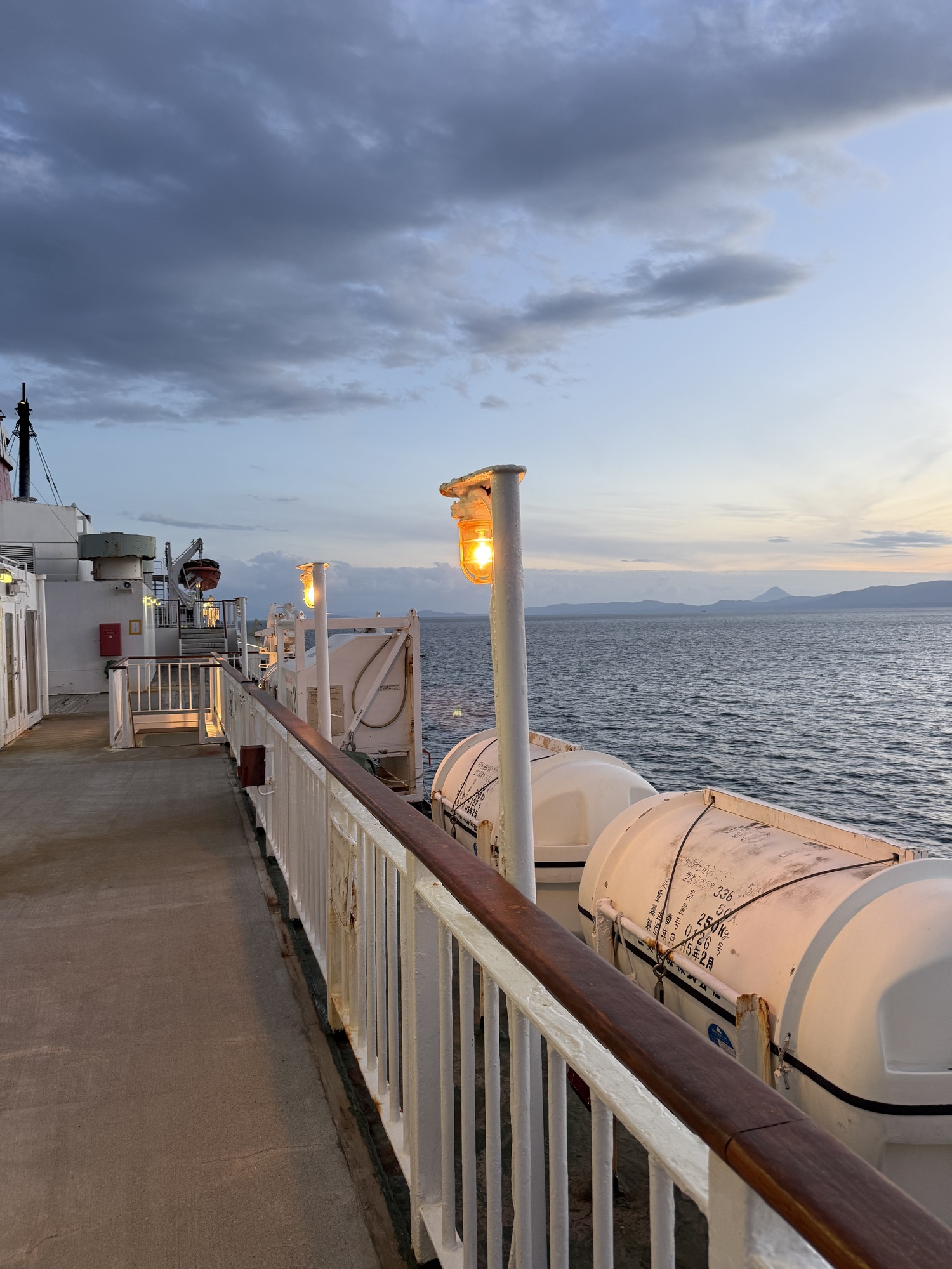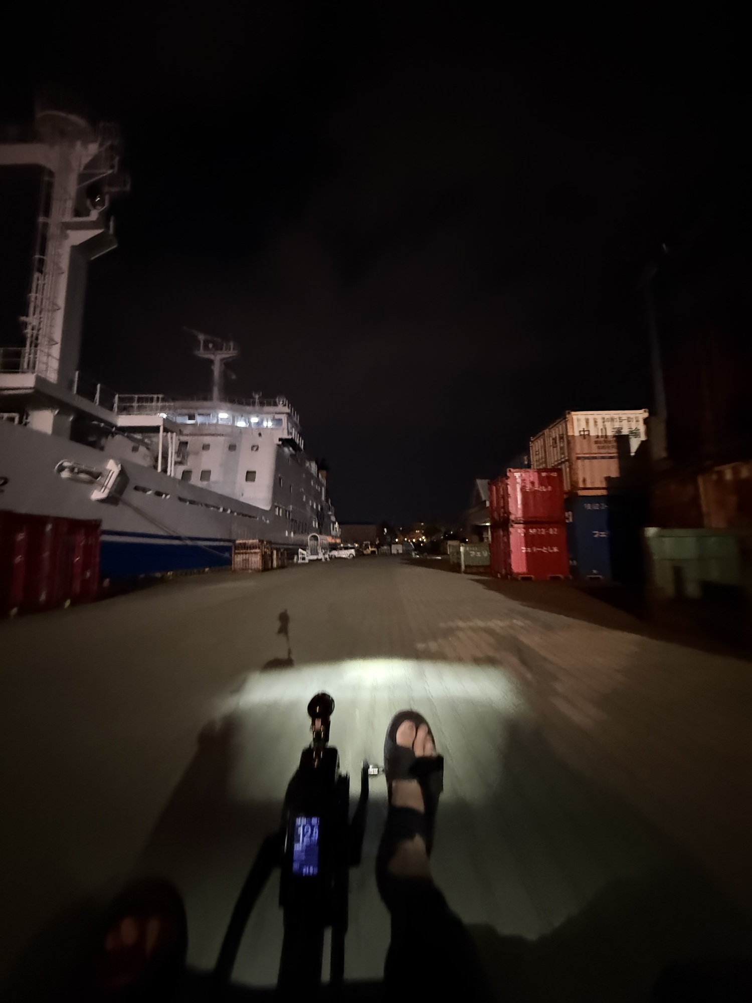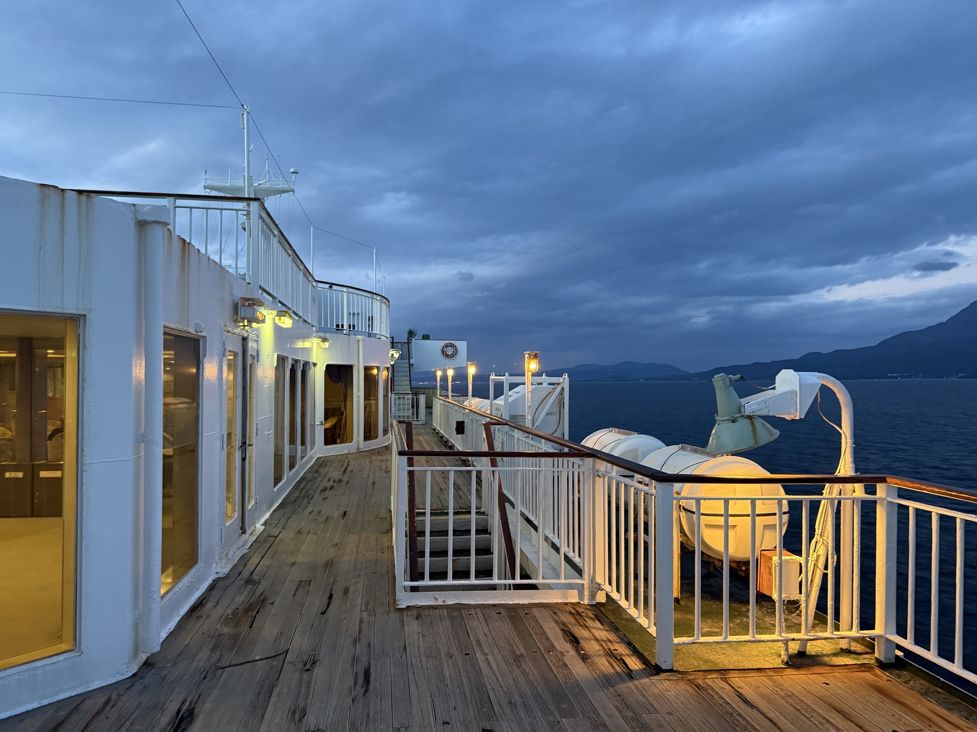 Once we were off the “wrong” ferry, we raced in the dark down the road several km trying to reach the ferry we should have taken. As fate would have it, we just missed it. Oh well, 45 minutes isn’t too bad a wait.