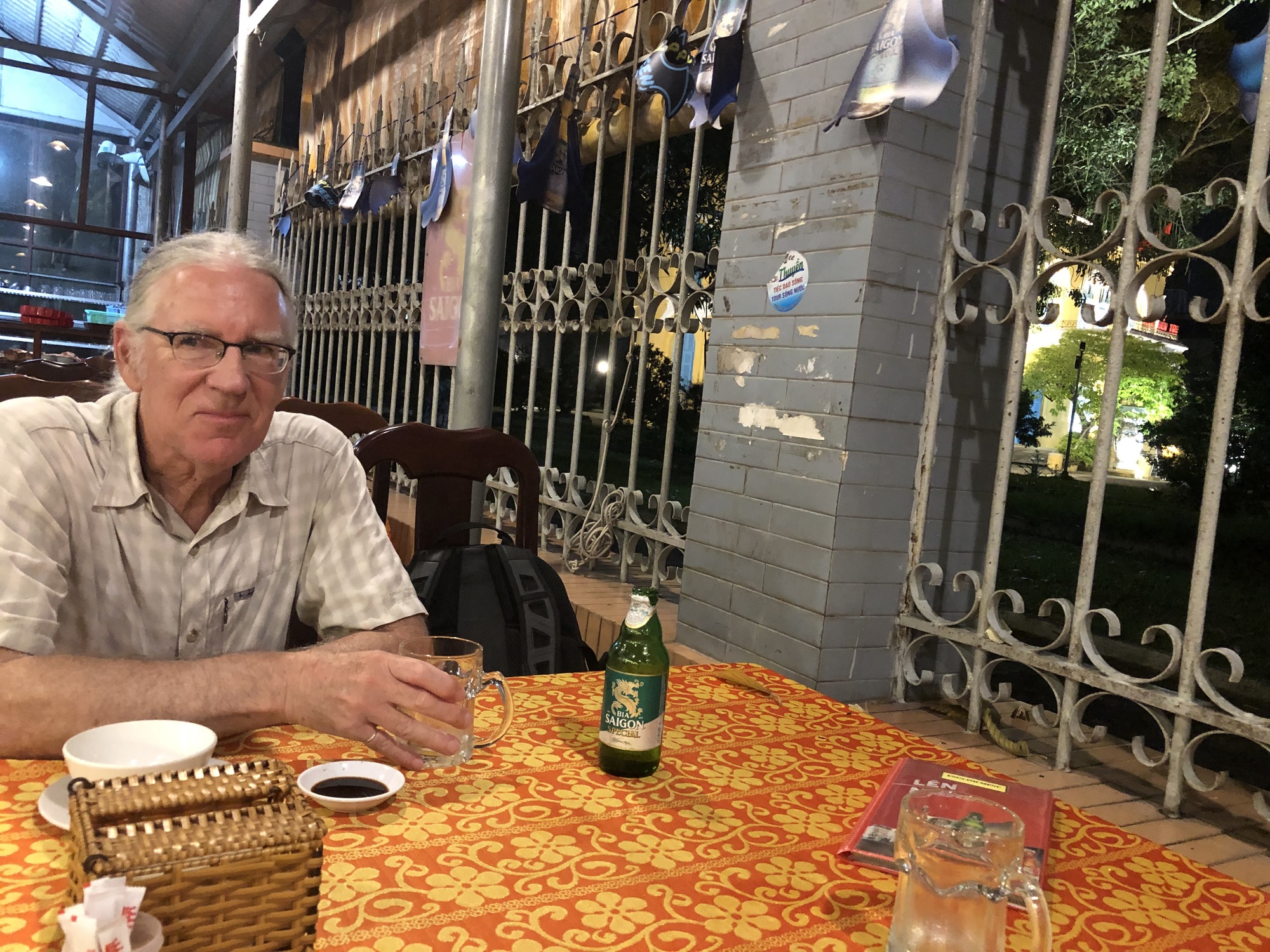 We’re here for a couple or three days. The goal is to get Bruce’s rack repaired and to assess where we would like to go from here. A coolish breeze blows from the busy river that swaps directions every few hours with the tide. People come out after dark and gather noisily with refreshing beverages. The lottery ticket seller has a bright light and some pretty Vietnamese tunes to lure people to her forlorn little kiosk. There are people tuning up for karaoke in a room below ours, and I say tuning up with some falsity because that wasn’t their plan in any way.