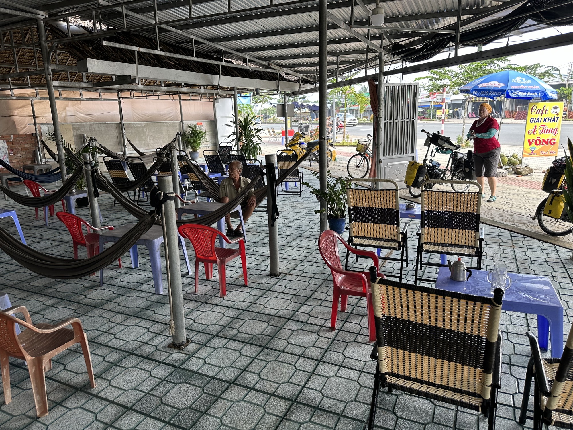 But up up up we went. Mind you, we haven’t climbed anything higher than adorable canal bridges up to that point so climbing a huge bridge felt like the Himalayas. Huff and puff it was, friends. Traffic was terrible. The terrifying joints that looked like they would swallow our tires were terrible. It was all terrible. We got off of there as soon as we could, then coasted into a deserted coffee shop to restart our hearts. The owner was very sweet, brought us tea, made sure we knew where the toilet was. Trucks and buses and motorbikes roared by like monstrous elephants. Sweet Guy lounged in his chair and watched it all go by with bemused interest. All day, every day, that sound in his life at every moment. I was consumed with despair on his behalf but the coffee was delicious and I was leaving anyway, he was going to have to retain sweetness without any help from me.
