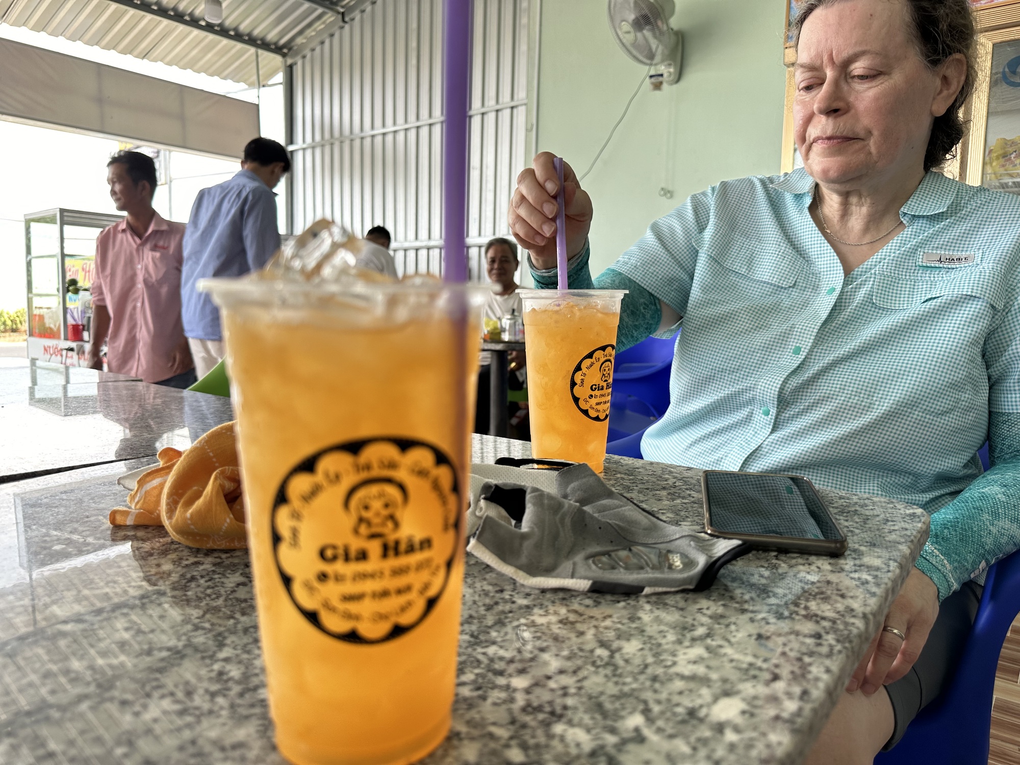 Adrian and Michelle told us that just 300 meters on they got a really nice orange juice and suggested we stop there too. We left them and went straight to the place. The group of what looked like owners and/or relatives of the juice place all chuckled the sort of chuckle that comes from just having served two foreigners on bikes. I mean, it could be something that has never happened even once before so twice in the span of a half an hour, naturally would be amazing to them. It's unfortunate that we all can't communicate these fun little things with each other but in context we knew what their chuckles were all about.