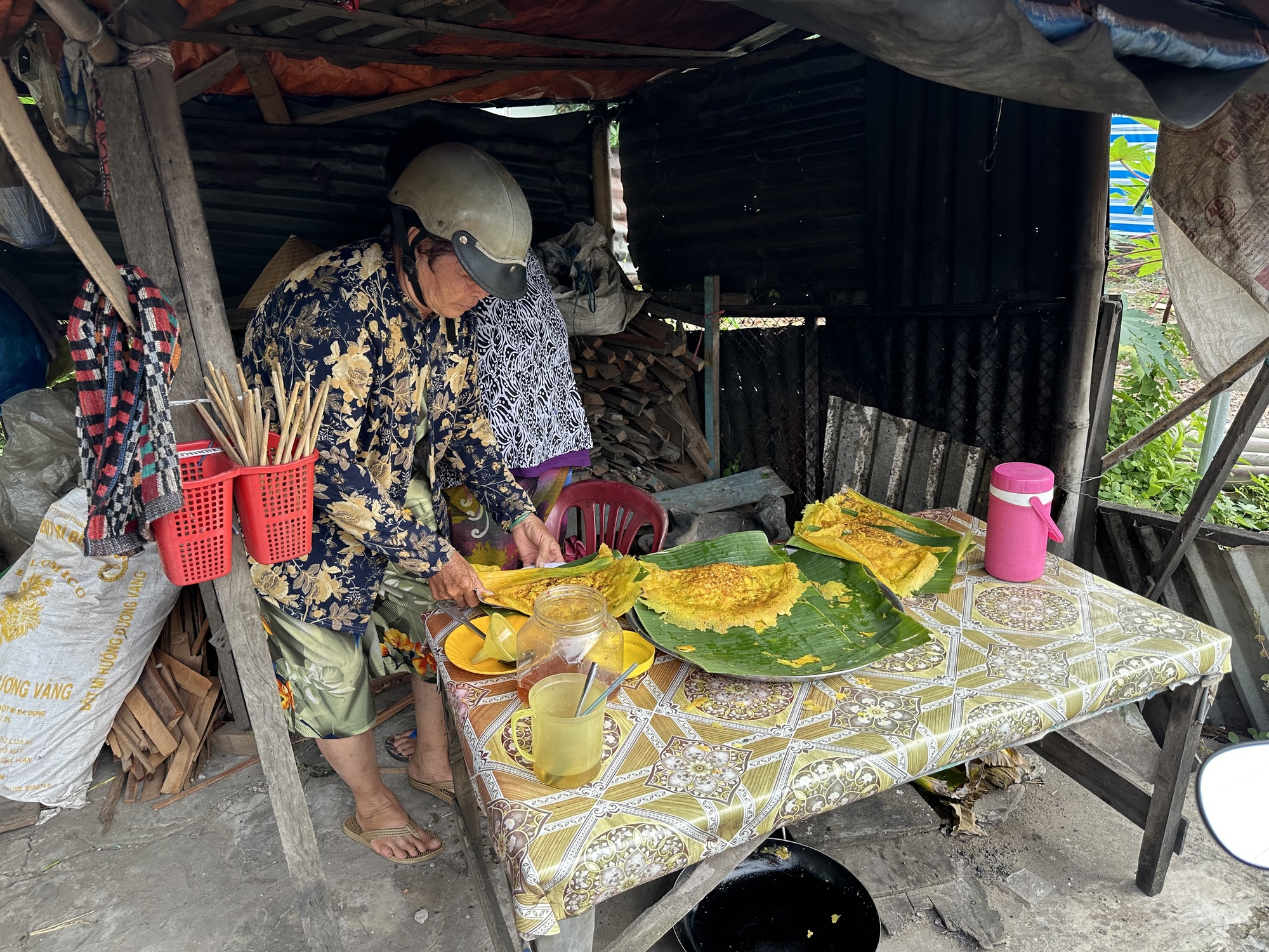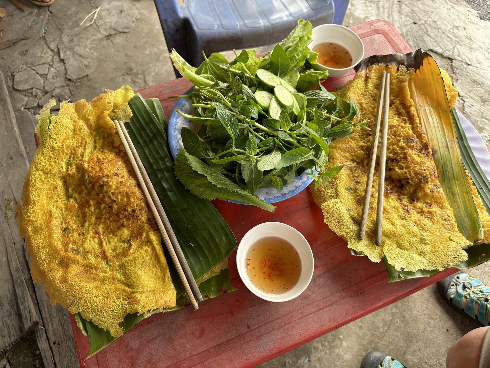 A bit further down the road I spotted some food that looked awfully interesting and good. I had to stop. They were enormous banh xeo that an old woman had made alongside the road. Banh xeo are thin crepes filled with bean sprouts, small pieces of pork and tiny shrimp. There is a dipping sauce and of course a huge tray of greens you can add as well. The banh xeo crepe is made without eggs but is very yellow which means there is turmeric in the batter. They were beautiful and we agreed we had to have banh xeo before leaving Vietnam. They are one of my favorites. We sat on tiny chairs at a low table right next to the road and ate as people literally came from across the street to stand and watch us. When that happens you just eat and smile and act like it's really delicious, which it was.