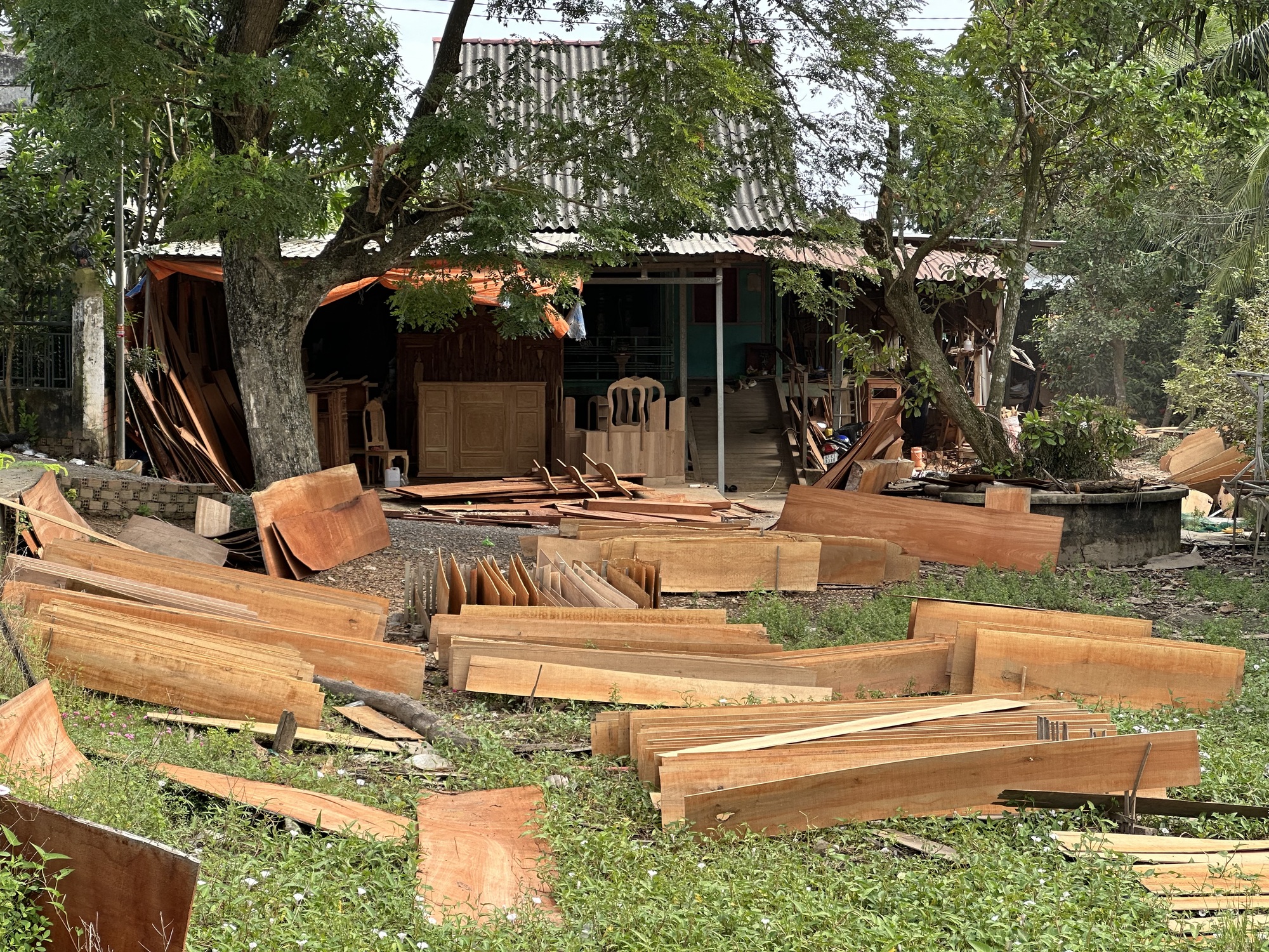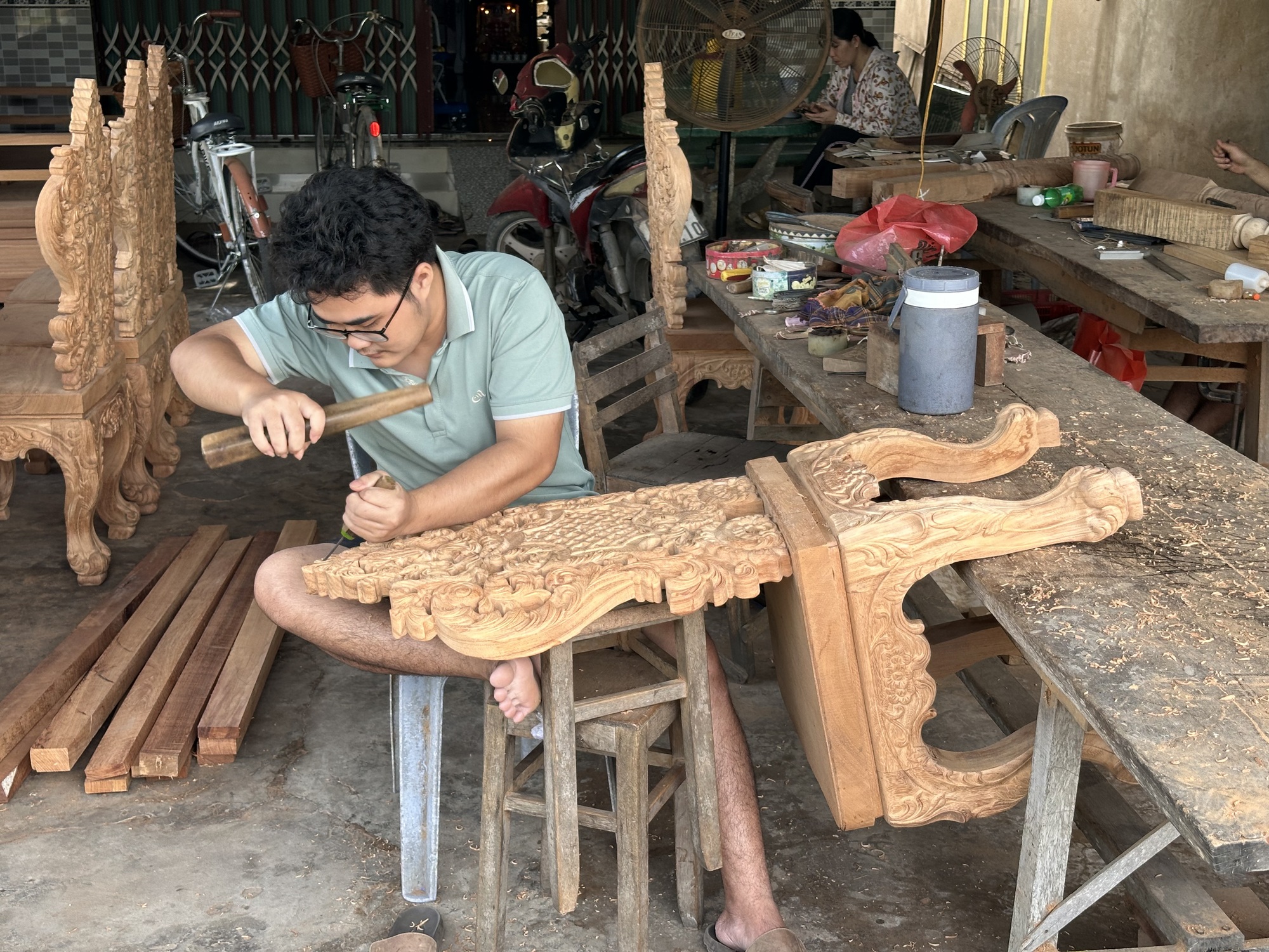 We passed through quite a large area of sawmills and where wooden furniture was being made. We heard the whine of saws and planers from each side of the road. It looked like the banana boy's parents were also involved in selling furniture because you can see some of it in the left side of the photo. The furniture made in all the Asian countries leaves a lot to be desired, in my opinion. I think it's a travesty to do that to trees and wood. Big hulking chairs so heavy you can't move them, so gaudily-carved you can't look at them. But I do love wood and it was fun to ride while seeing all sorts of wide boards drying outside. It's beautiful wood. I also videoed a guy intricately carving a large chair. He was so engrossed in what he was doing that he never knew I was there.