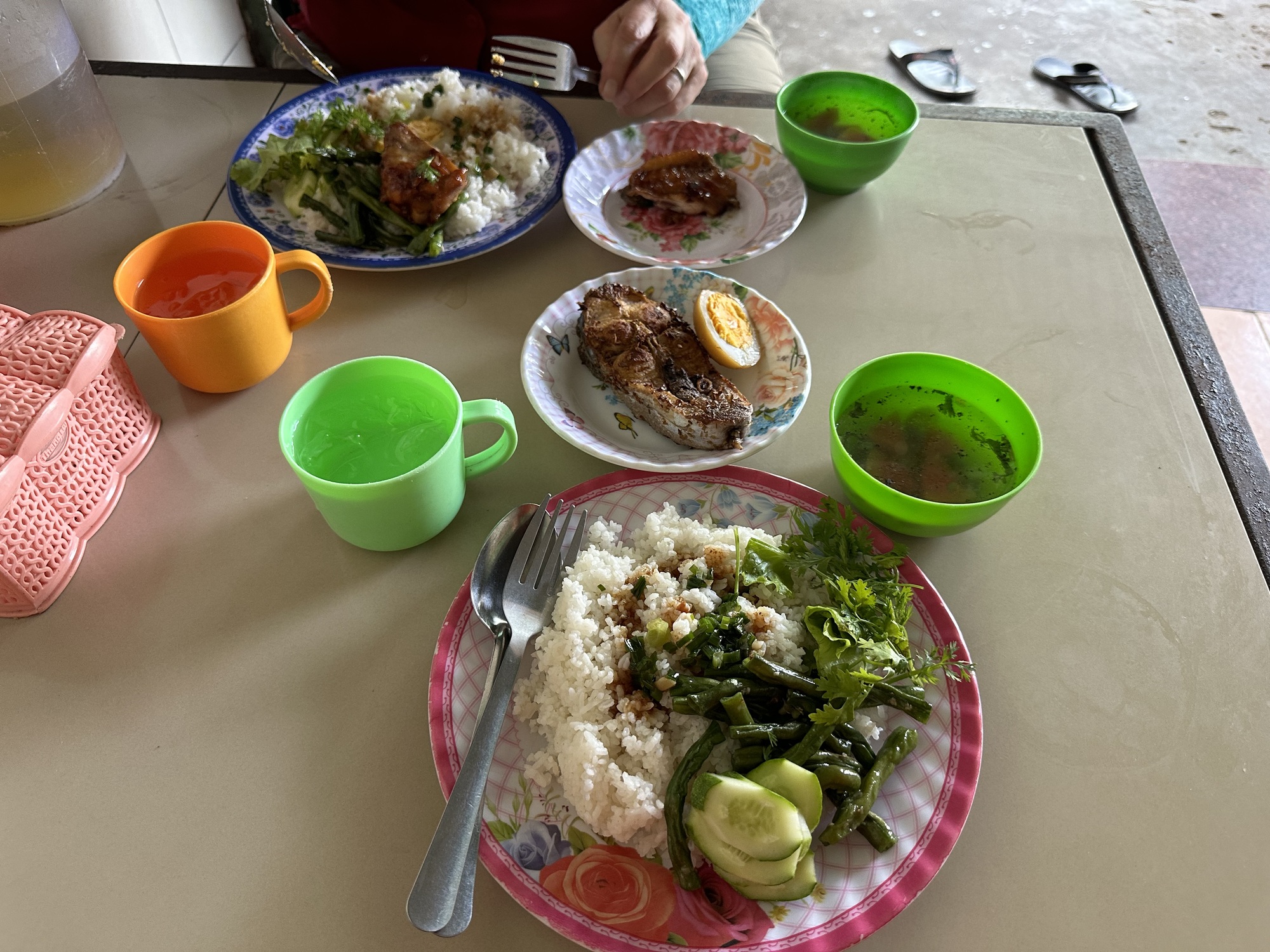 As we rolled into the town where we figured we would stay (Phu Tan) we saw some good looking com tam (meaning; broken rice) which is quite common but we hadn't had any yet. Like com binh dan there is a selection of prepared dishes you can choose from and it is put on top of broken rice. Broken rice is of course of lesser quality and I think traditionally broken rice was eaten more by the poorer people. But there are com tam stands everywhere so that makes me wonder why there is so much broken rice in Vietnam. Maybe nowadays they break it on purpose because of com tam's popularity. This is something I don't know but I do know that our meal was great, one of the best we've had. I chose fish and green beans as my two choices and Andrea chose chicken and green beans. It always comes with a soup broth and today's broth had large saturated carrot pieces in it. Everything was great. I just love that just about anything you order in Vietnam comes with a tray of greens and always there is basil on that tray. The basil in Vietnam is the best I've ever eaten. I've been kind of going crazy piling it on everything.