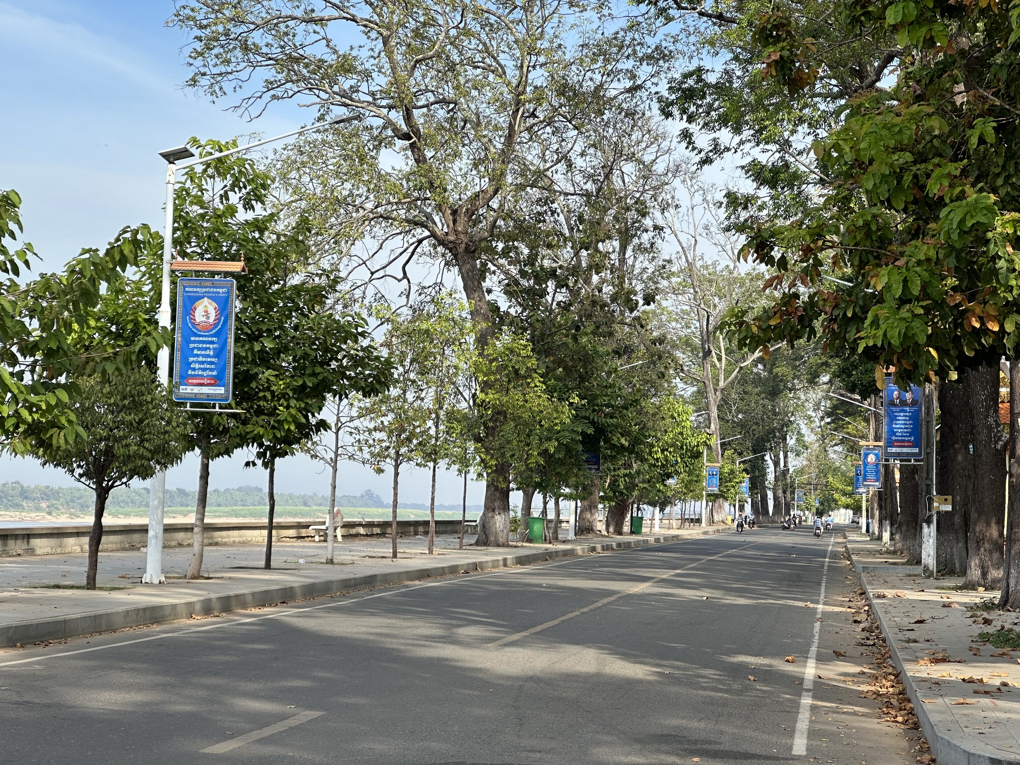 The map showed an actual jungle we'd be skirting. I mean, it said "Kratie Jungle," but there was no jungle. Maybe the road didn't come close enough to it and the jungle does exist in the distance. Unfortunately, I was all set for a jungle experience imagining snakes and monkeys and other nasty jungle animals but then, nothing. One has to be ready for anything on a bike trip including nothing. Adjust oneself at a moment's notice or even no notice. I contented myself with looking on the other side of the road at the Mekong River which always makes me happy; one of the great rivers of the world!