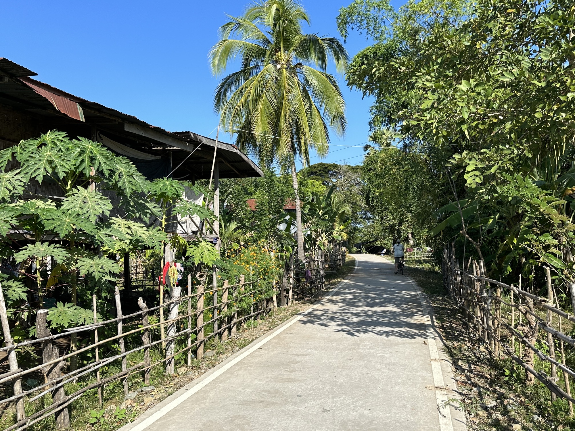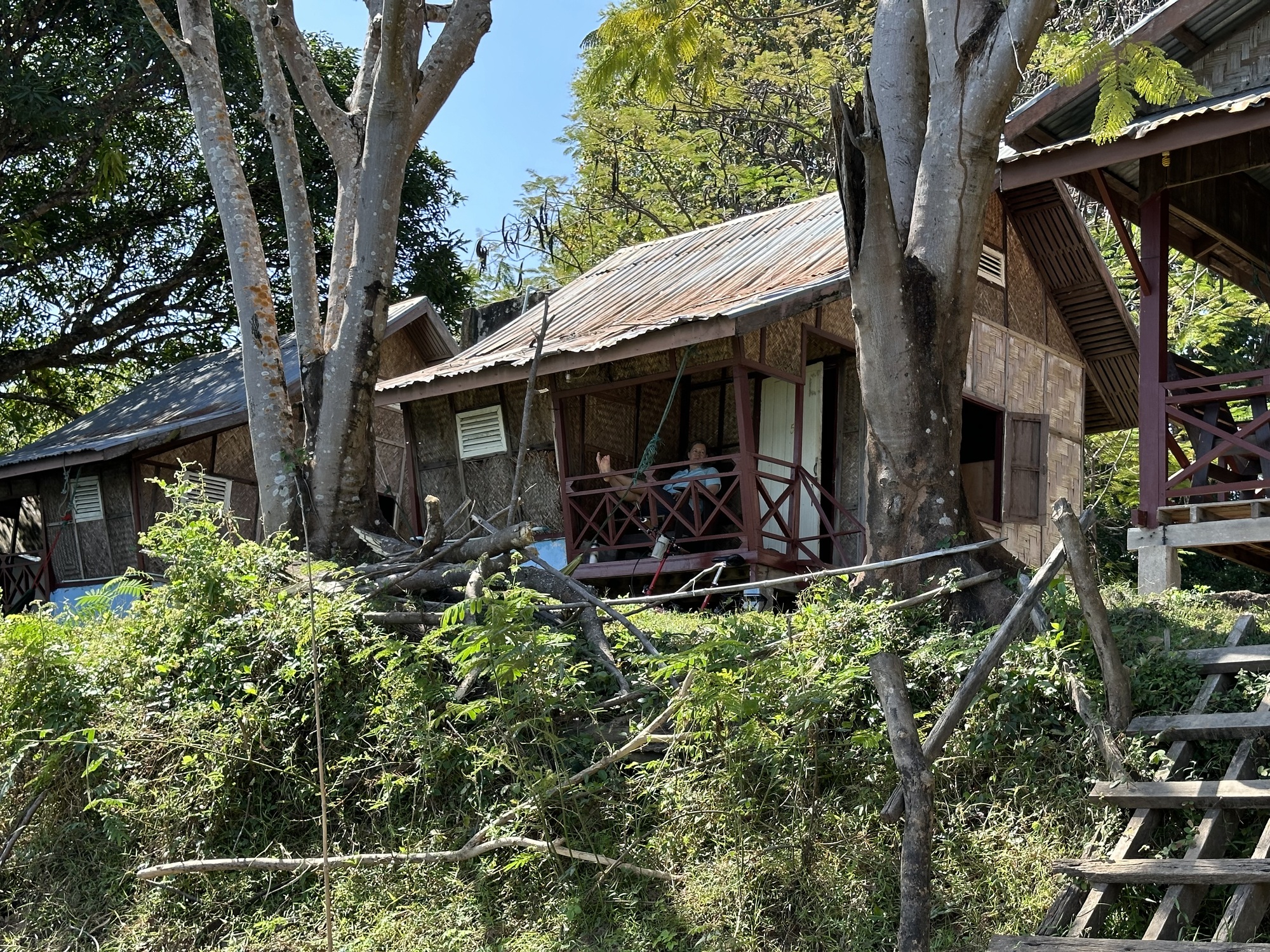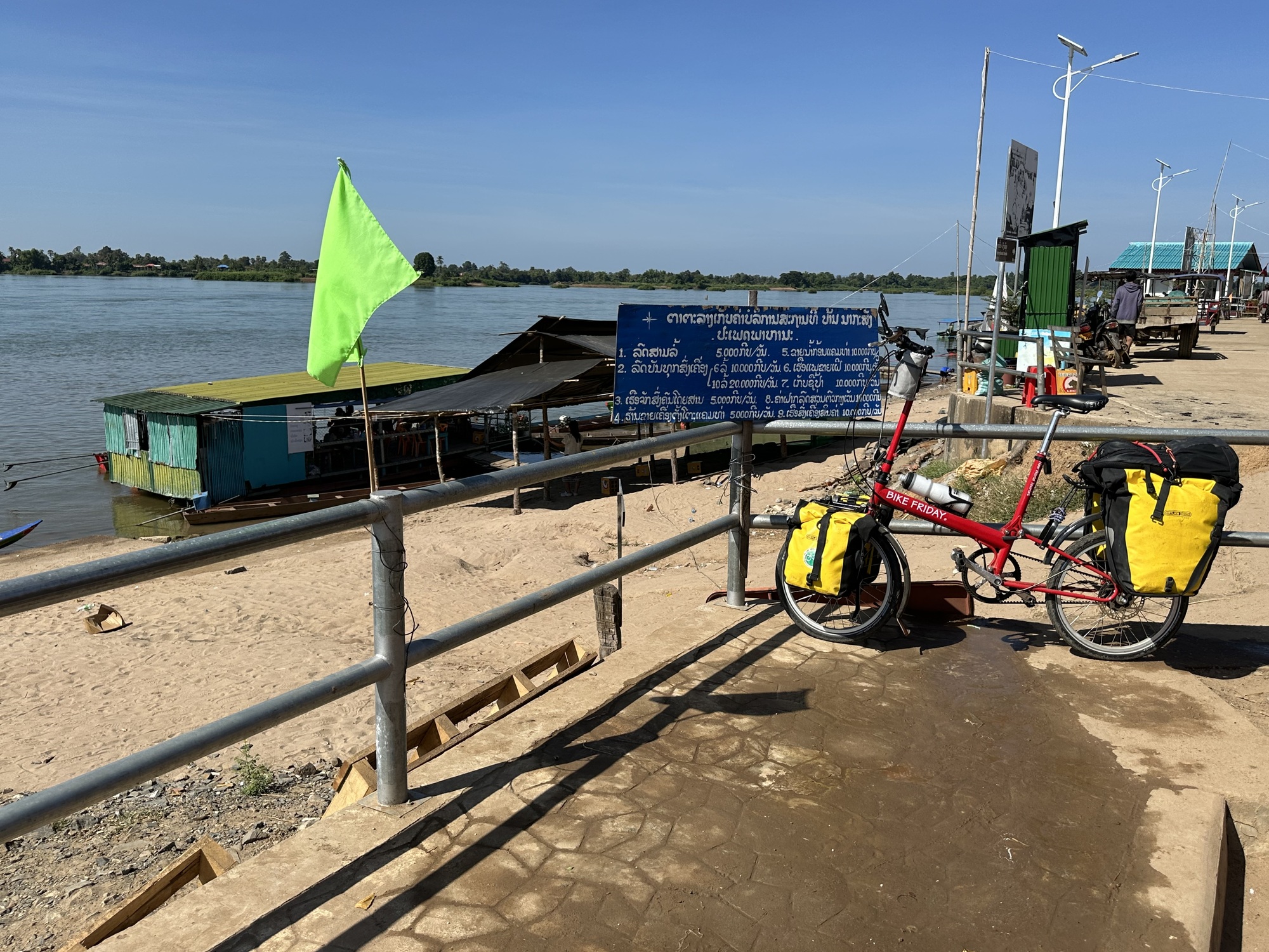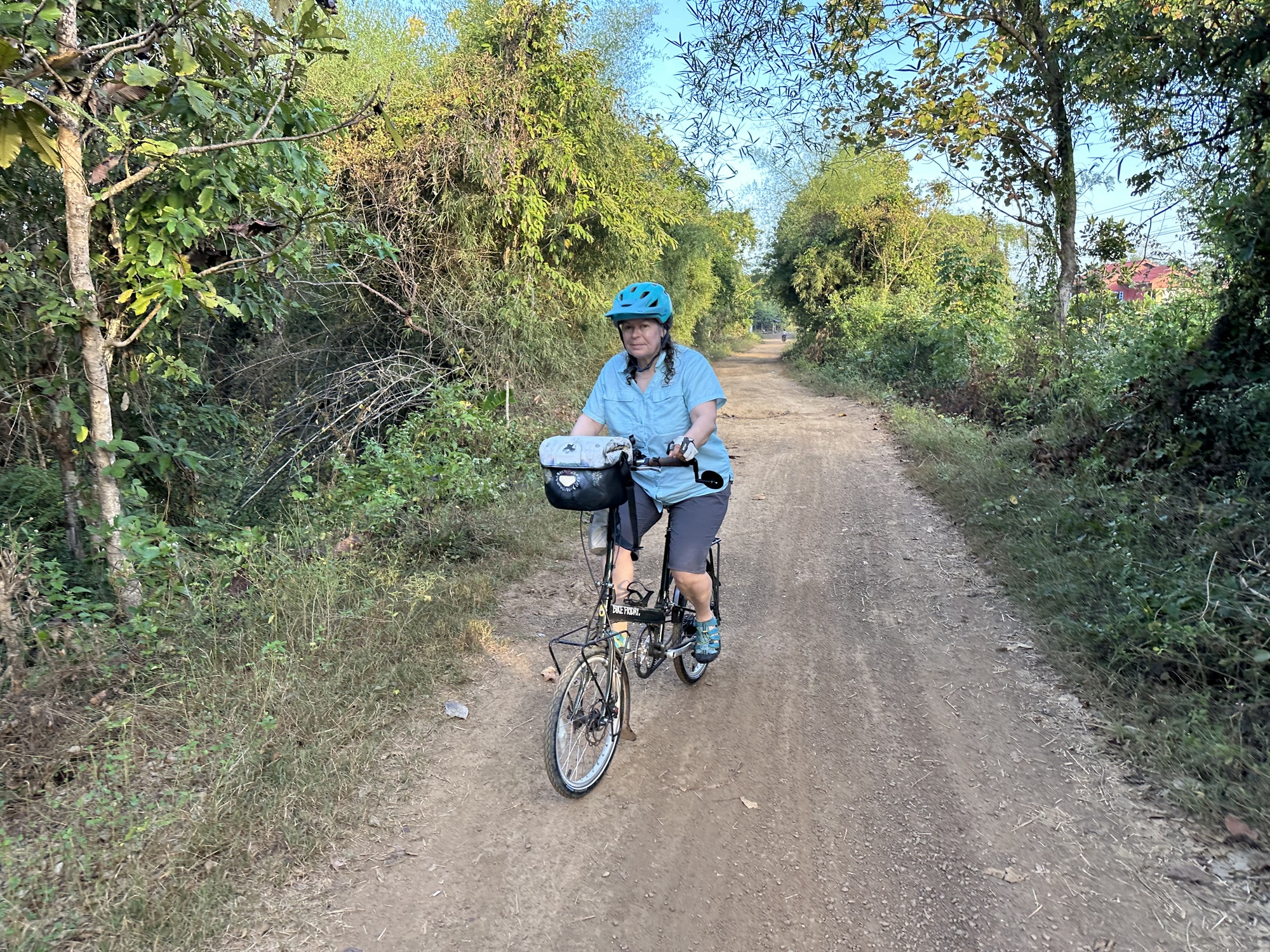 Only one other person was on our boat and coincidentally a cyclist. He was in full lycra garb and had two tiny panniers. I happened to lift his bike on the other side and it weighed nothing. He happened to lift one of our bikes, groaned, and I thought he might have a heart attack. He was older, maybe even older than I, Swiss (the French part), and surprisingly had ridden from Chiang Rai in the north of Thailand. That's a long way over lots of steep hills. He certainly didn't look the part to be entering Don Det where "Happy Shakes" abound. You may say that we don't fit the part either but at least I look the part. He asked if the trail down the island was dirt because he said he doesn't ride in dirt! He was in luck because we had heard that they had just paved the trail on the east side of Don Det with cement. He said he was heading to Stung Treng which I then had to crush his dreams of never taking public transportation, if those were in fact his dreams. He looked like he had those dreams for sure. I told him the road from the border to Stung Treng was one of the worst dirt roads I've seen and that he absolutely had to take a minivan. I was looking at his microscopically narrow tires as I told him the news knowing those tires wouldn't make it on that road.. He didn't know it yet but he would be thanking us for the suggestion.