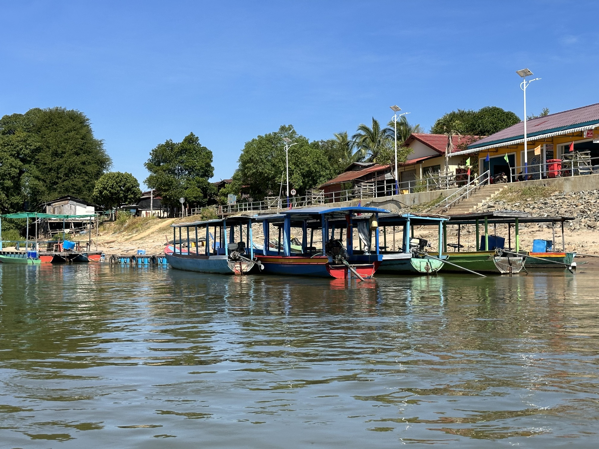 It was still fairly early in the morning and there were loads of backpackers in Nakasong packed into two coffee shops with their large backpacks waiting for transport, (mini vans seem to be the norm nowadays), away to other parts of SE Asia after probably several days of relaxation on Don Det. We rode right past those two groups and quickly found a restaurant backpackers no doubt rarely go to, a noodle soup restaurant full of Lao. After a really great bowl of pho, (they called it pho there), we found the ferry dock/boat to Don Det. The mass exodus had taken place and we were too early to be in the mass new group of travelers arriving to pack boats going to Don Det. Don, by the way, means island in Lao.