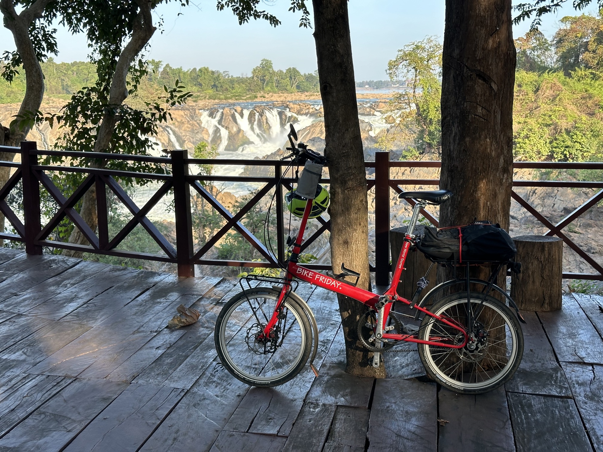 We were the first people of the day on the wooden viewing platform besides the red ants that were climbing the tree I leaned my bike against. Red ants are not to be messed with, even worse than guys in uniforms at the border who still have your passport in their dirty little hands demanding an extra $2 for their Beer Lao fund.
