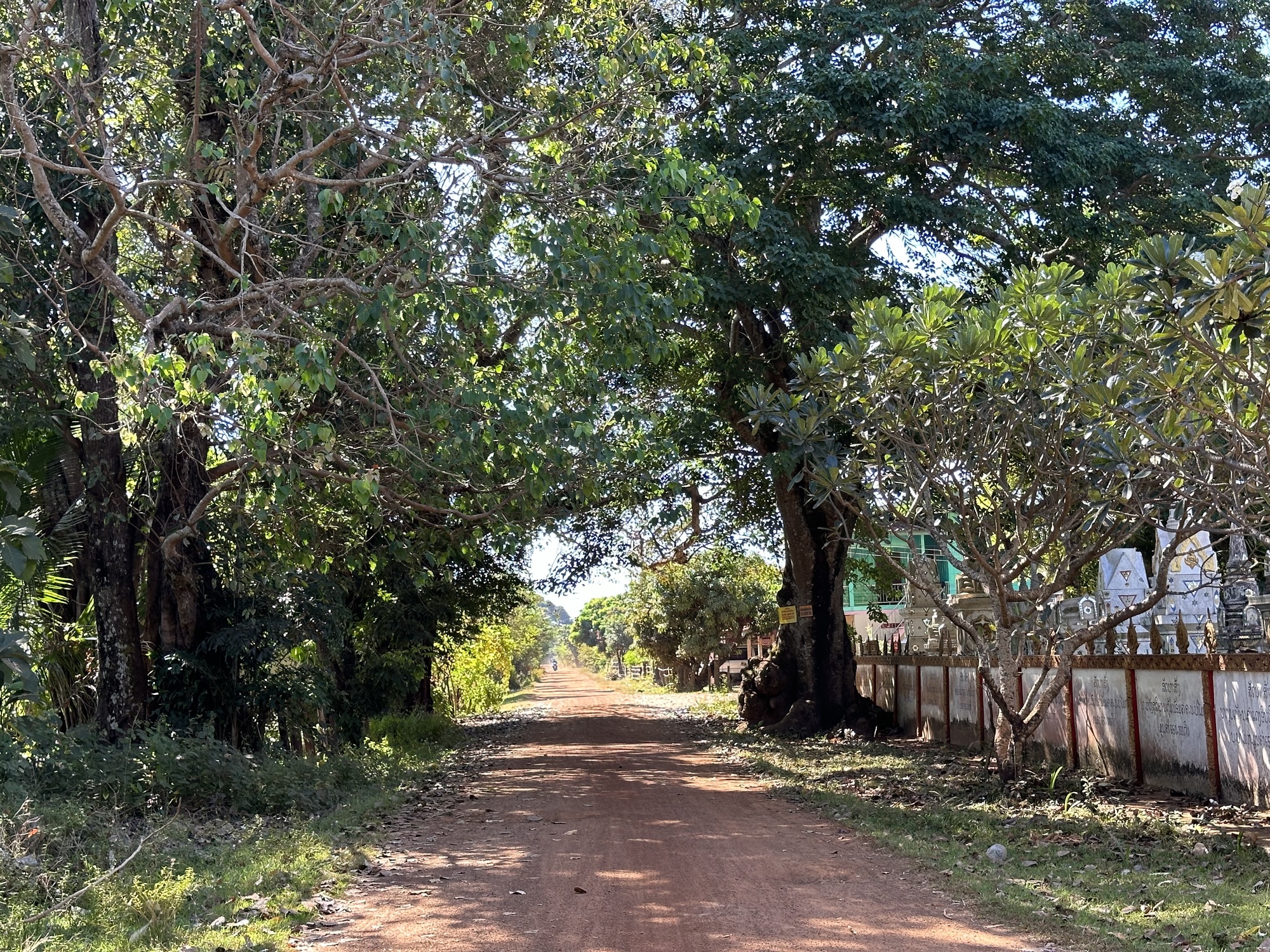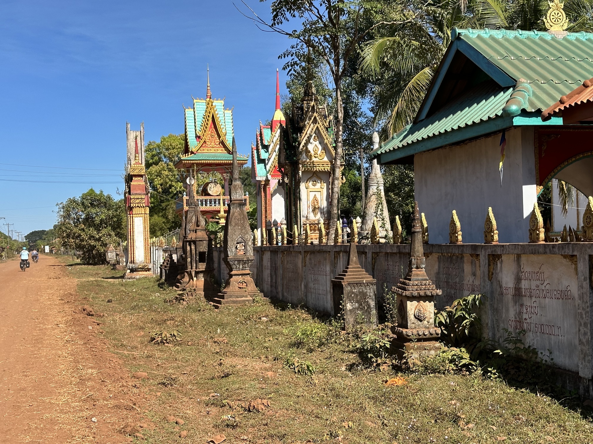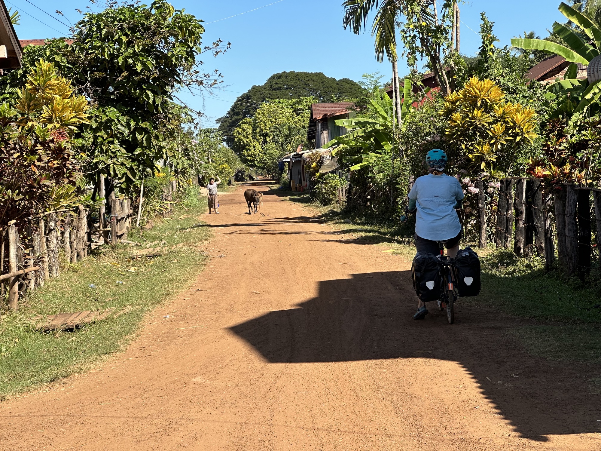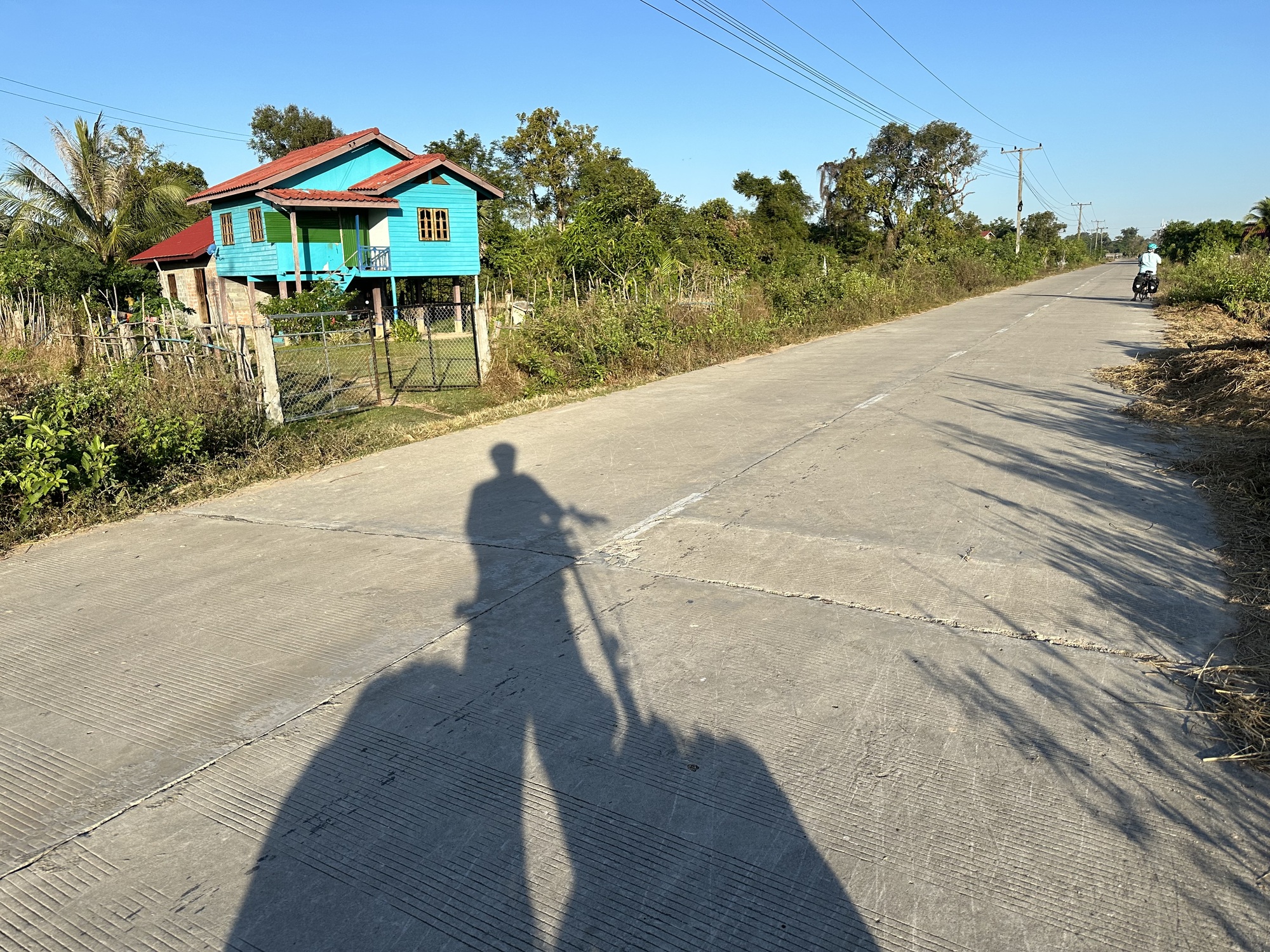 Loading up in the sunrise in front of our guesthouse, we looked across the street at the restaurant. Deadsville. We had eaten muesli sans papaya in our room so off we went. Oh man, that little road was rough, our heart sank. Oh, but wait! There was a new parallel road of nice concrete, whoop! Was this because of the new bridge across the Mekong to Don Khong? One can only speculate.