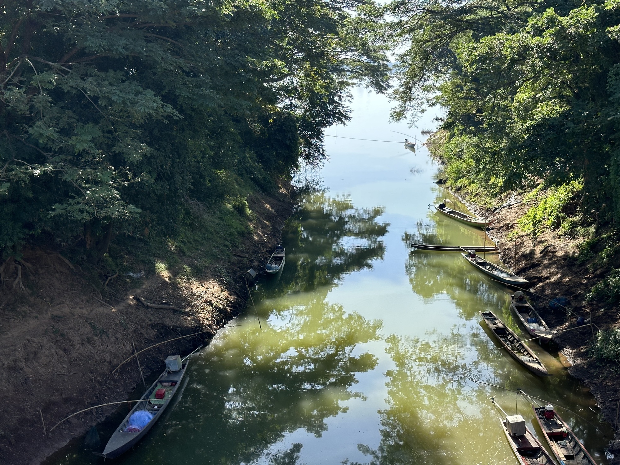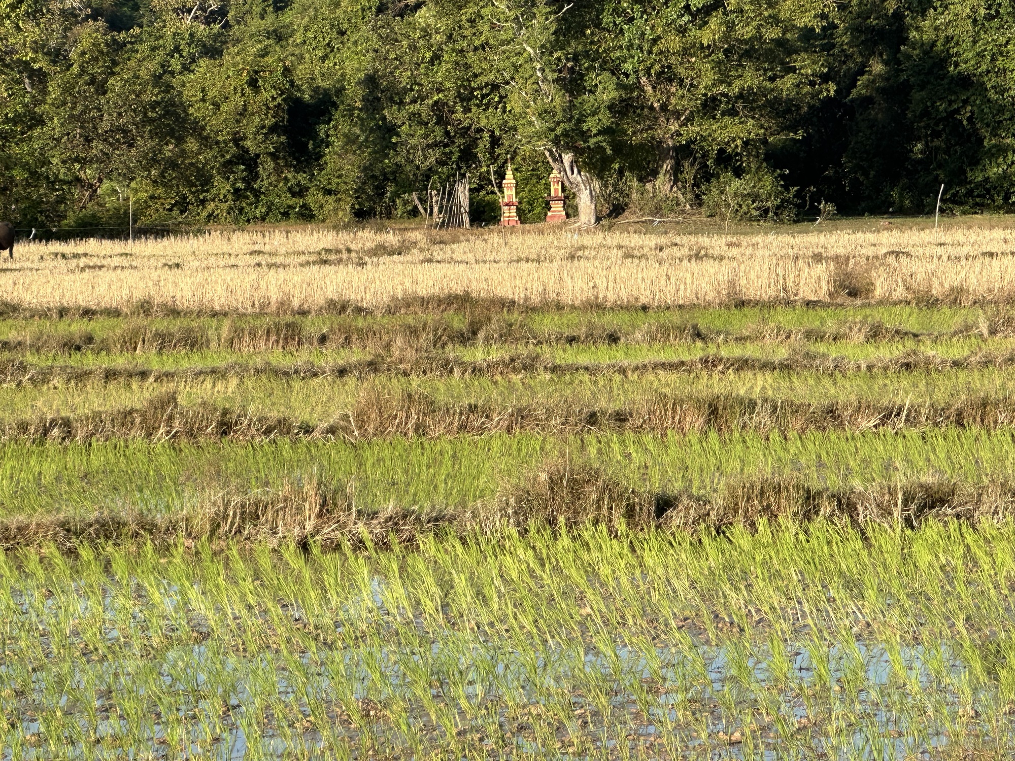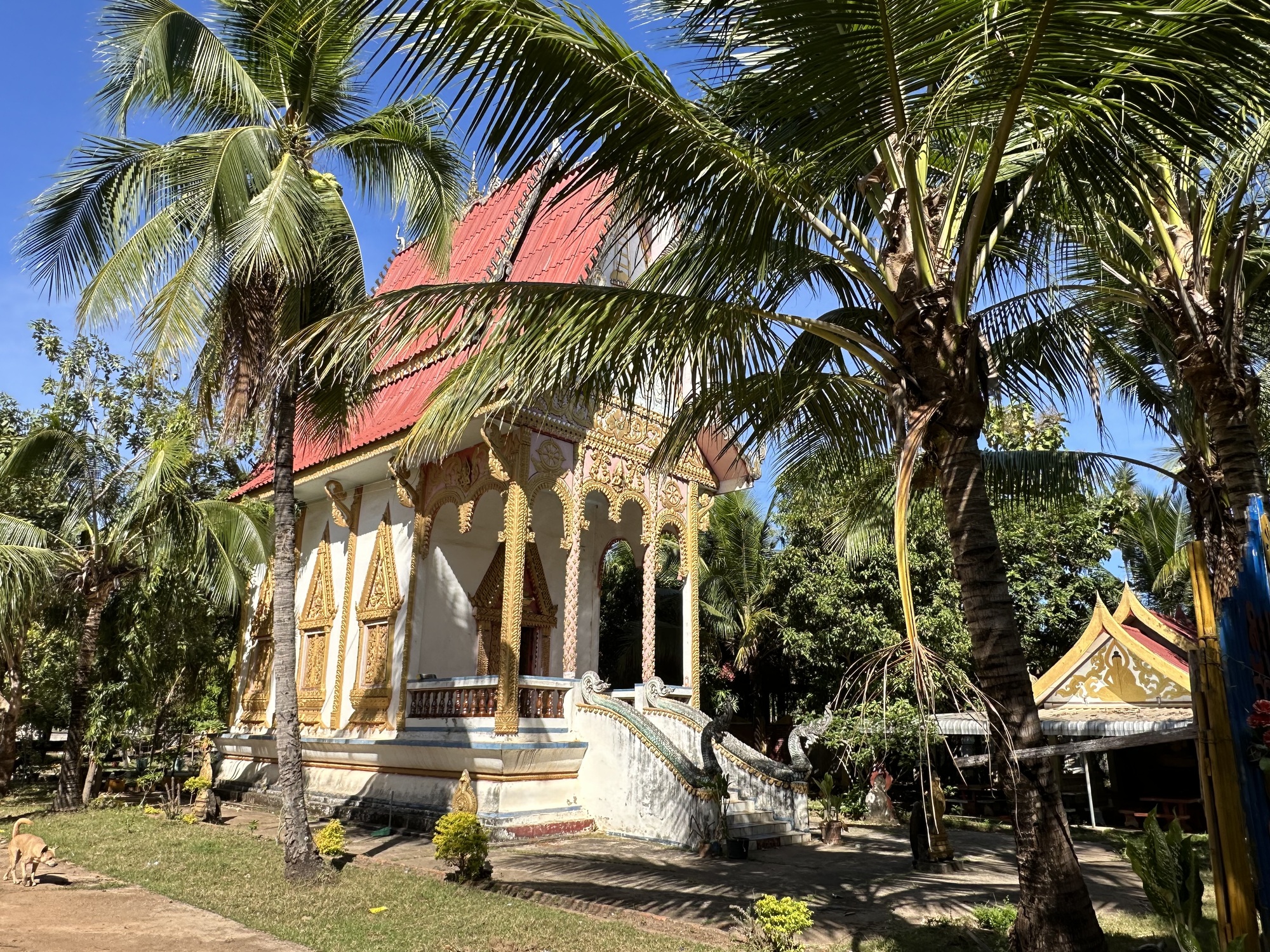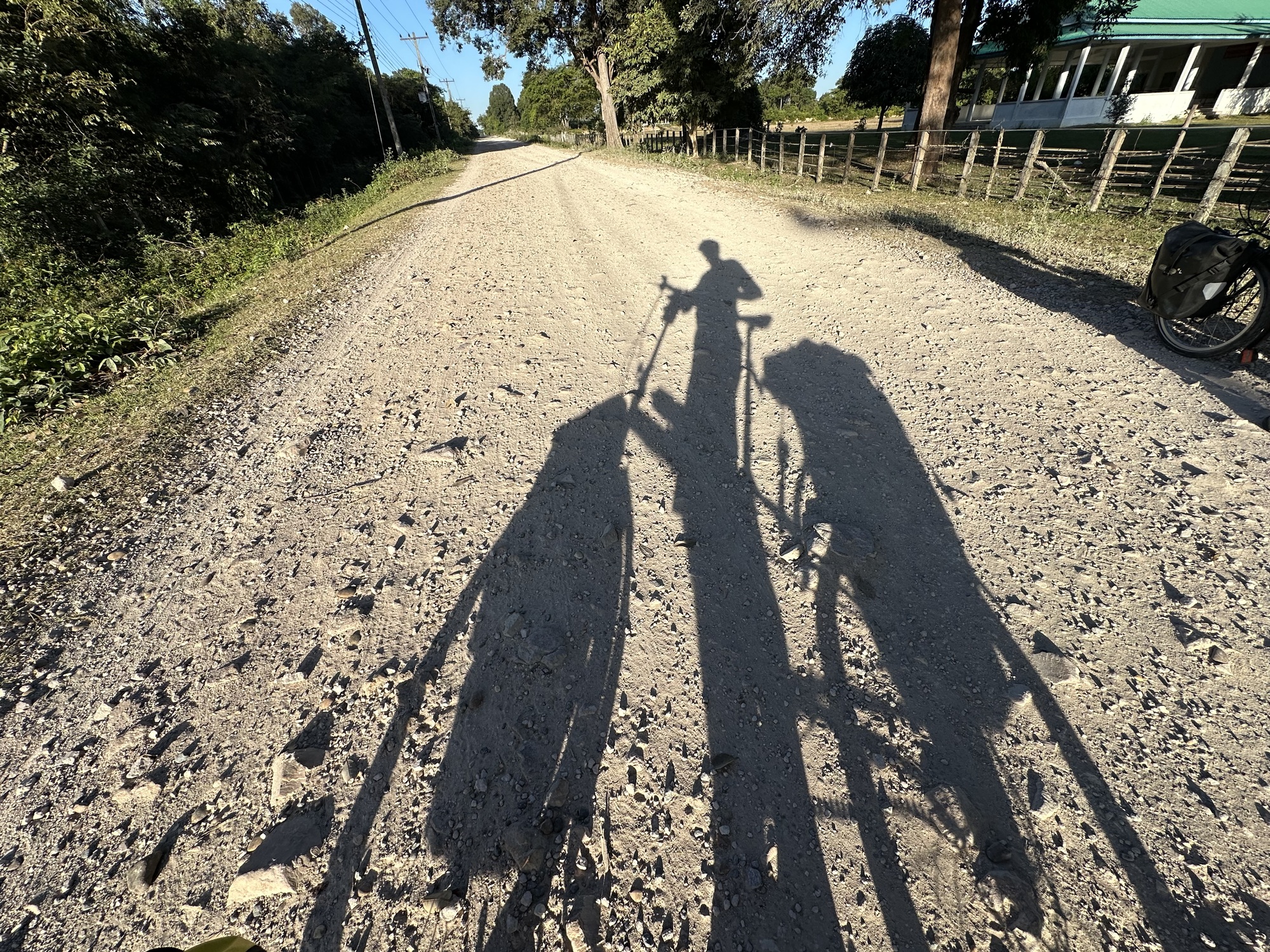 Loading up in the sunrise in front of our guesthouse, we looked across the street at the restaurant. Deadsville. We had eaten muesli sans papaya in our room so off we went. Oh man, that little road was rough, our heart sank. Oh, but wait! There was a new parallel road of nice concrete, whoop! Was this because of the new bridge across the Mekong to Don Khong? One can only speculate.