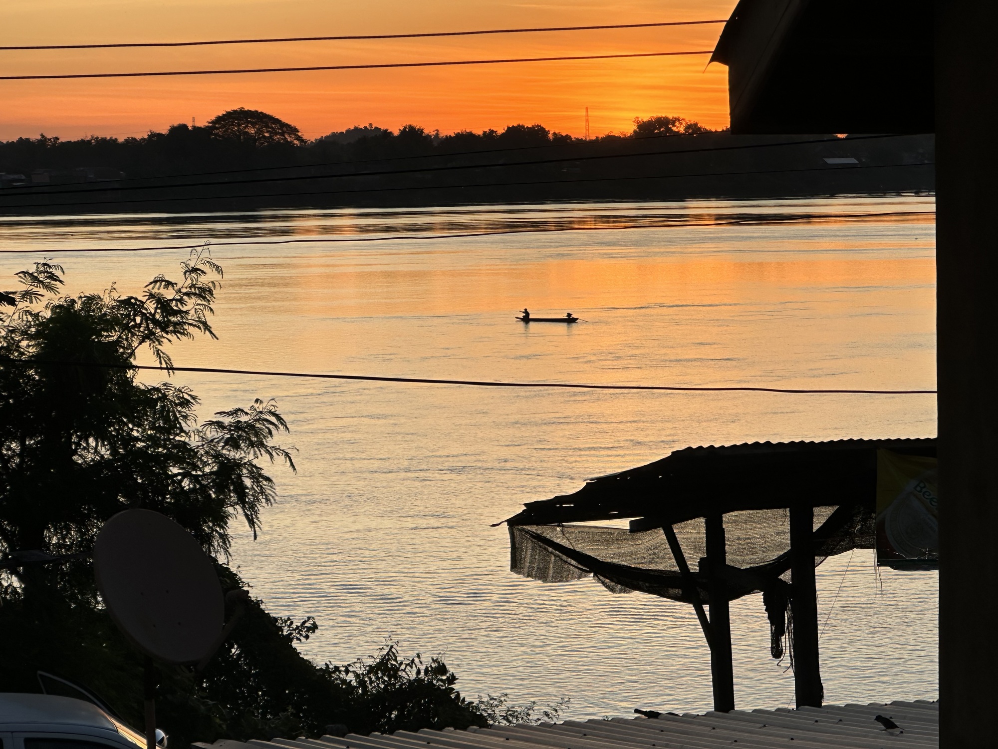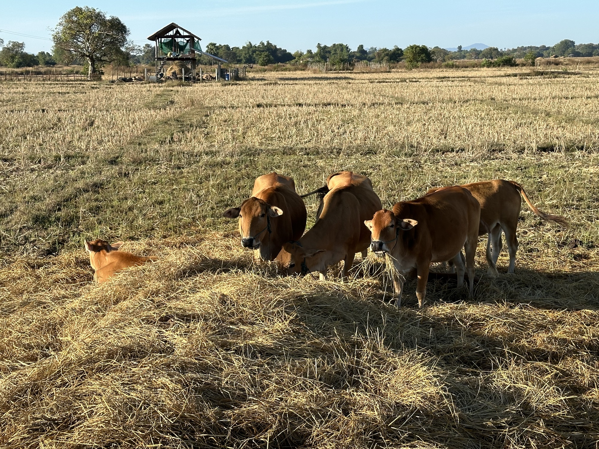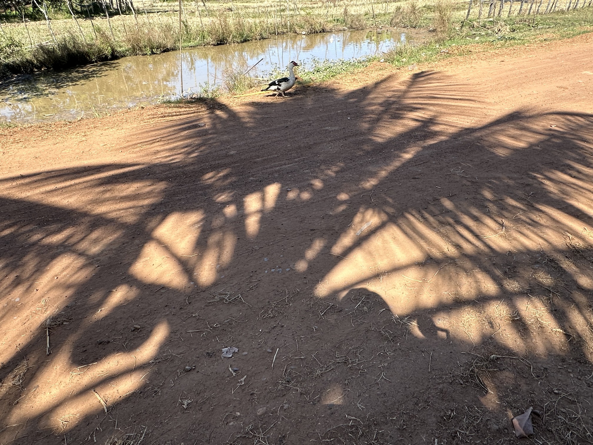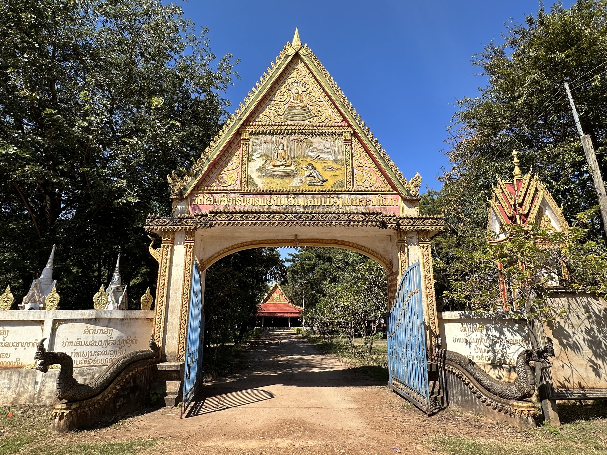 Loading up in the sunrise in front of our guesthouse, we looked across the street at the restaurant. Deadsville. We had eaten muesli sans papaya in our room so off we went. Oh man, that little road was rough, our heart sank. Oh, but wait! There was a new parallel road of nice concrete, whoop! Was this because of the new bridge across the Mekong to Don Khong? One can only speculate.
