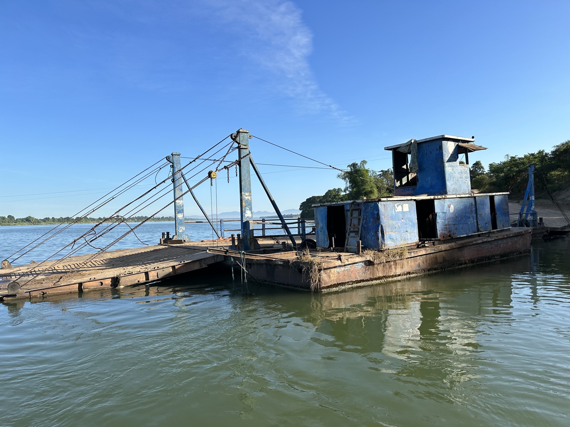 We were aiming for a car ferry up at the north end of the island, but when we turned toward that the road turned to crap, vast potholes, rocks, the usual. After skimming up most of the island we were now limping to the west hoping there still WAS a ferry. Finally we reached the ferry landing, which was big and imposing and looking like maybe all was good. But the car ferry? Well, I wouldn’t put my car on that ferry, and there was nobody manning it either. Fortunately for us there was a small ferry with a guy smoking in it, he called to somebody, who called to somebody and a teenaged boy came down and took us across the river.