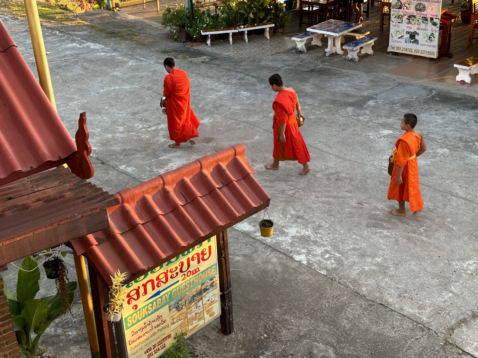 Both of us double checked our Google maps. Remember, we were flying blind, no Lao SIM card because everybody in the country was registering their phones for who knows what reason. This coffee place was very funky, not your cute Vietnam or Thailand WiFi coffee place. I may or may not have gotten a mouse turd in my ice, I’m trying not to think about that. Anyway, no signal, my map had gone blank, Bruce’s had gone blank, the guesthouse I had marked wasn’t showing up. So we threw the coffee ice into our water bottles and kept going.