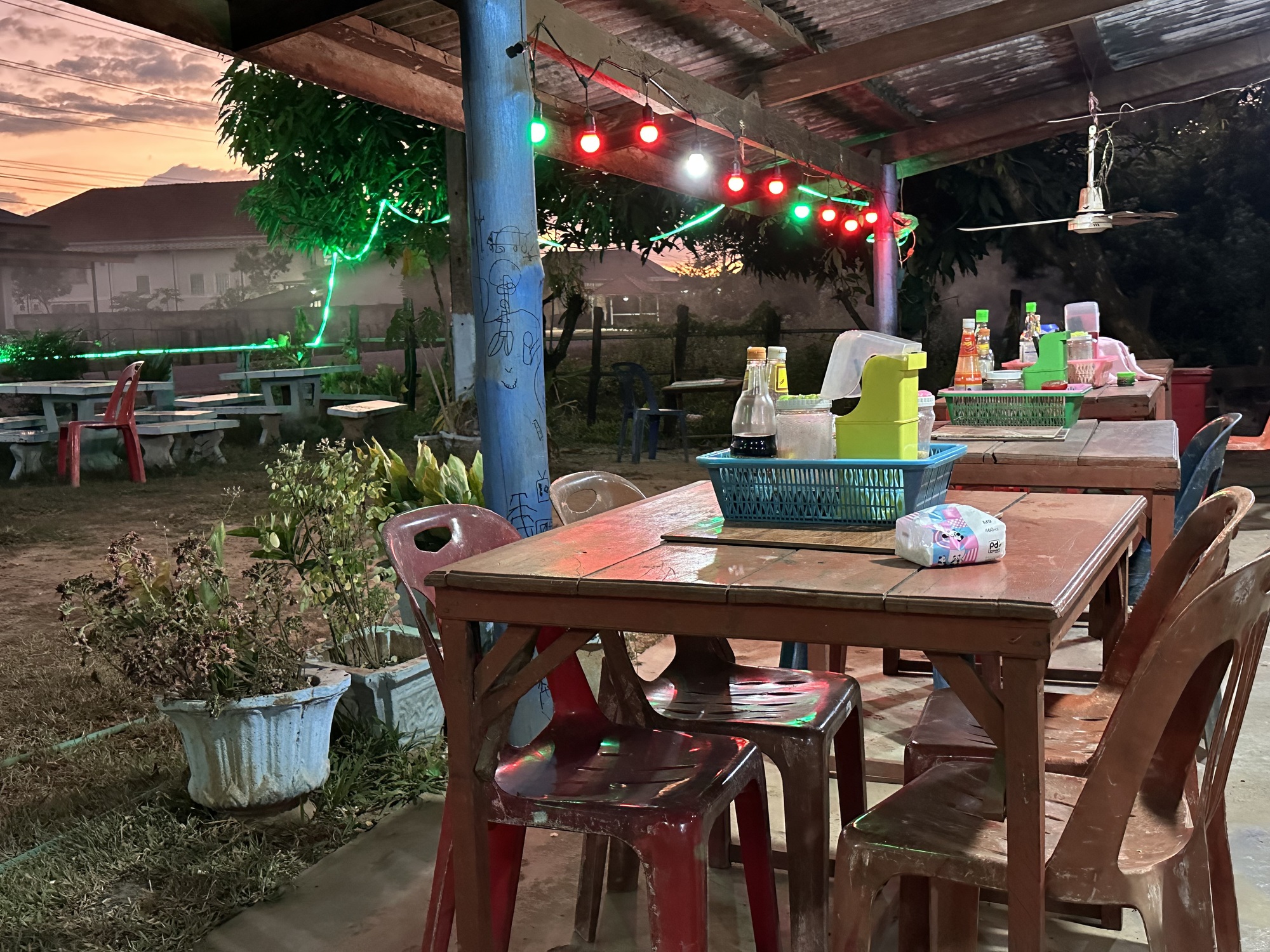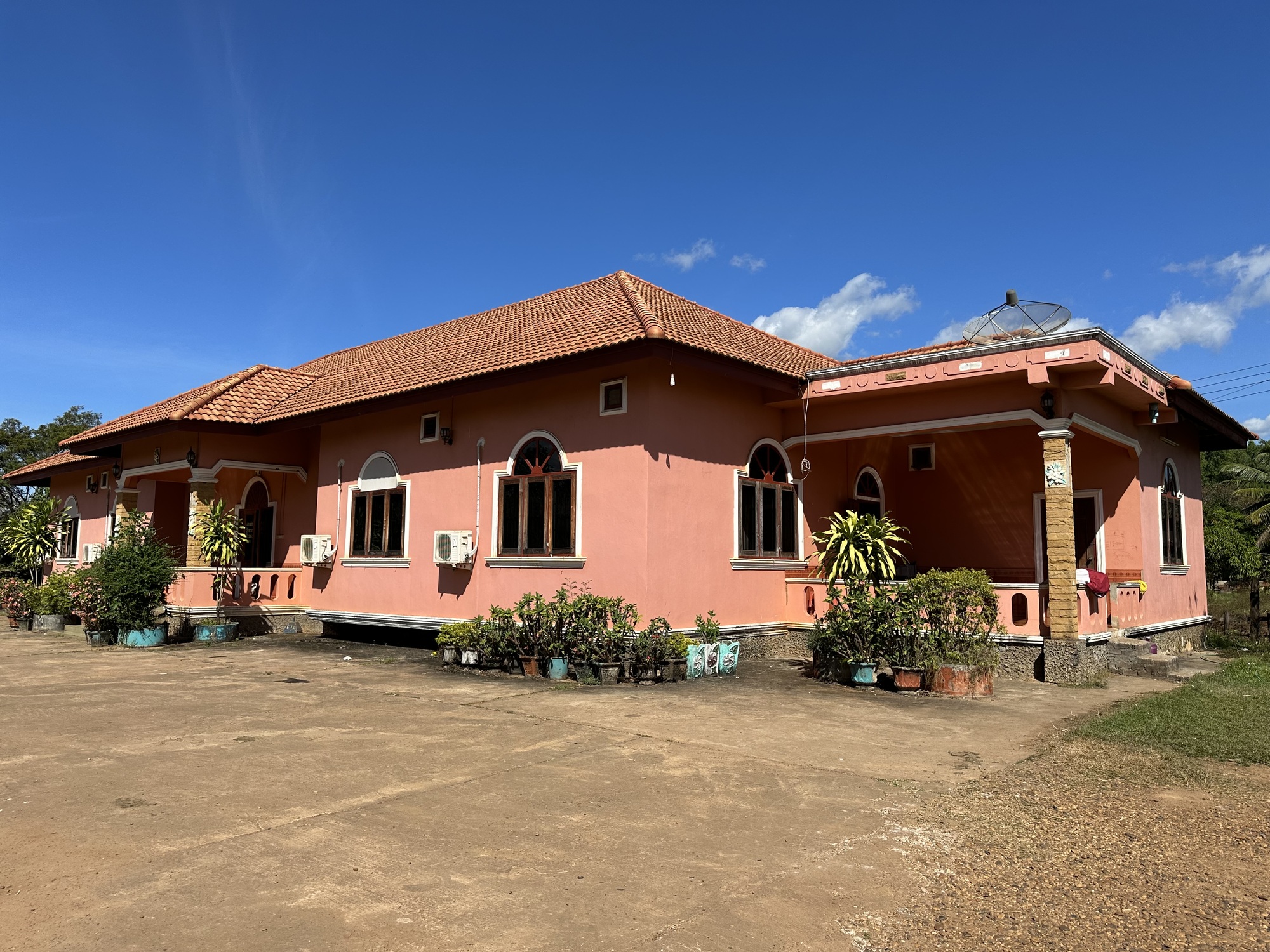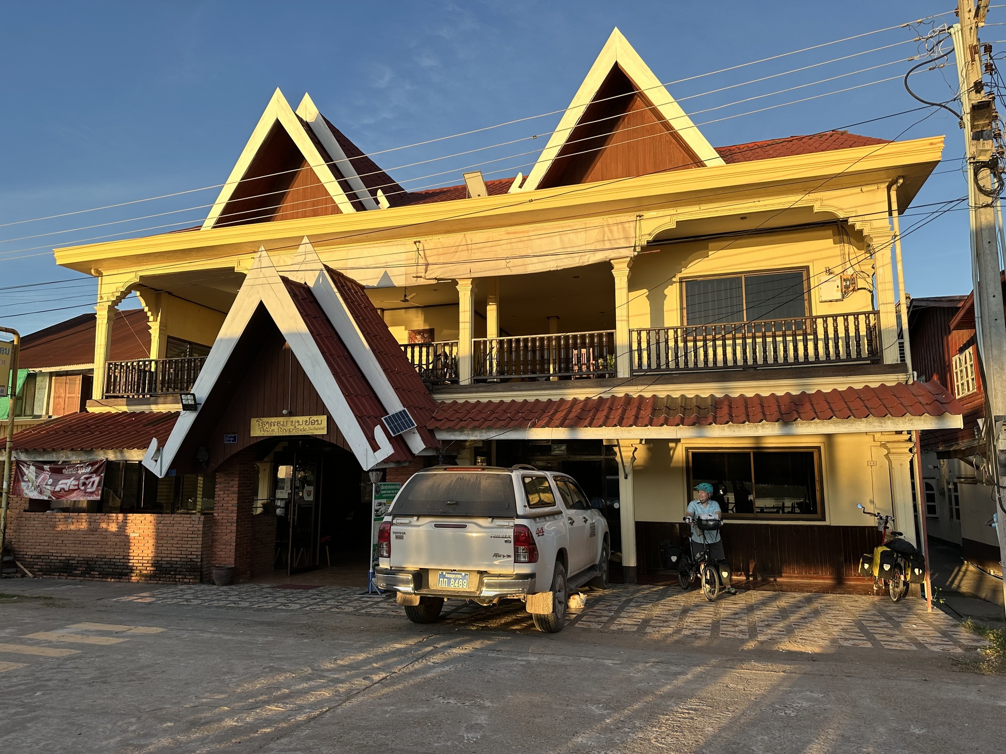 We were already tired from some really rough riding, so we decided to turn around. Oh man do I hate turning around. Who doesn’t hate backtracking? The Lao folks saw us go by again, which was cause for remark although there’s a lot to be said for not understanding what people are saying about you. We got back to the crossroads, turned west, and a mile later wheeled into a nice-ish looking guesthouse with no English on their sign. There were some funky things about this place but it’s Laos, we don’t have high expectations ever. The hot water heater was hooked up to power but not to water, fortunately we were hot and the warmish solar-heated water was fine. They had pretty good soap for once.