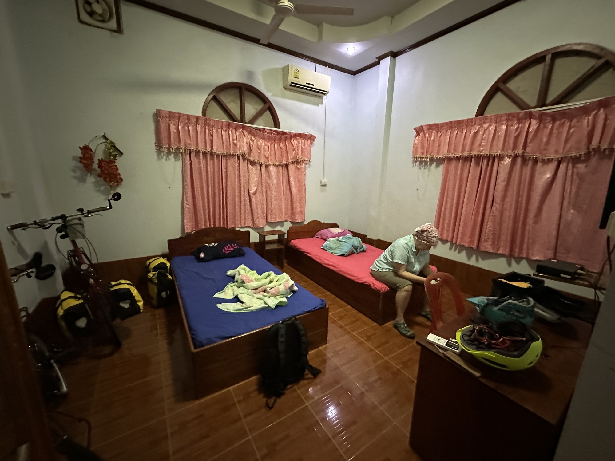 Air conditioning, a locking door, a restaurant where they made us some good fried rice, it was kind of an “any port in a storm” situation that could have been a lot worse. But we had put 8 extra miles on an already tough day and the next day was going to be much farther. We lay down on our sort of comfortable twin beds and set the alarm for 5 am.
