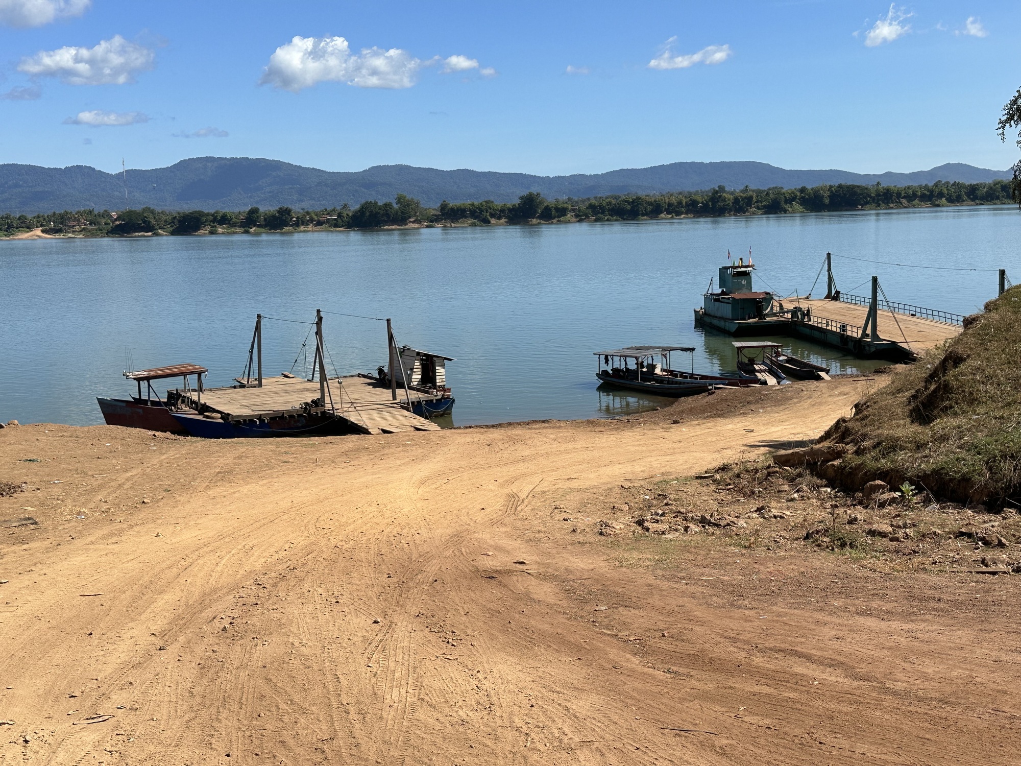 Mind you, the Mekong is pretty wide here even though we weren’t even crossing the entire river. The boat was small, the boy was young, and halfway across he lowered the throttle on the engine so it was going pretty slowly. A little nerve-wracking, but eventually we were beach landing on a pile of sand and the guys helped us push our bikes up the slope. Whew, back on the mainland.