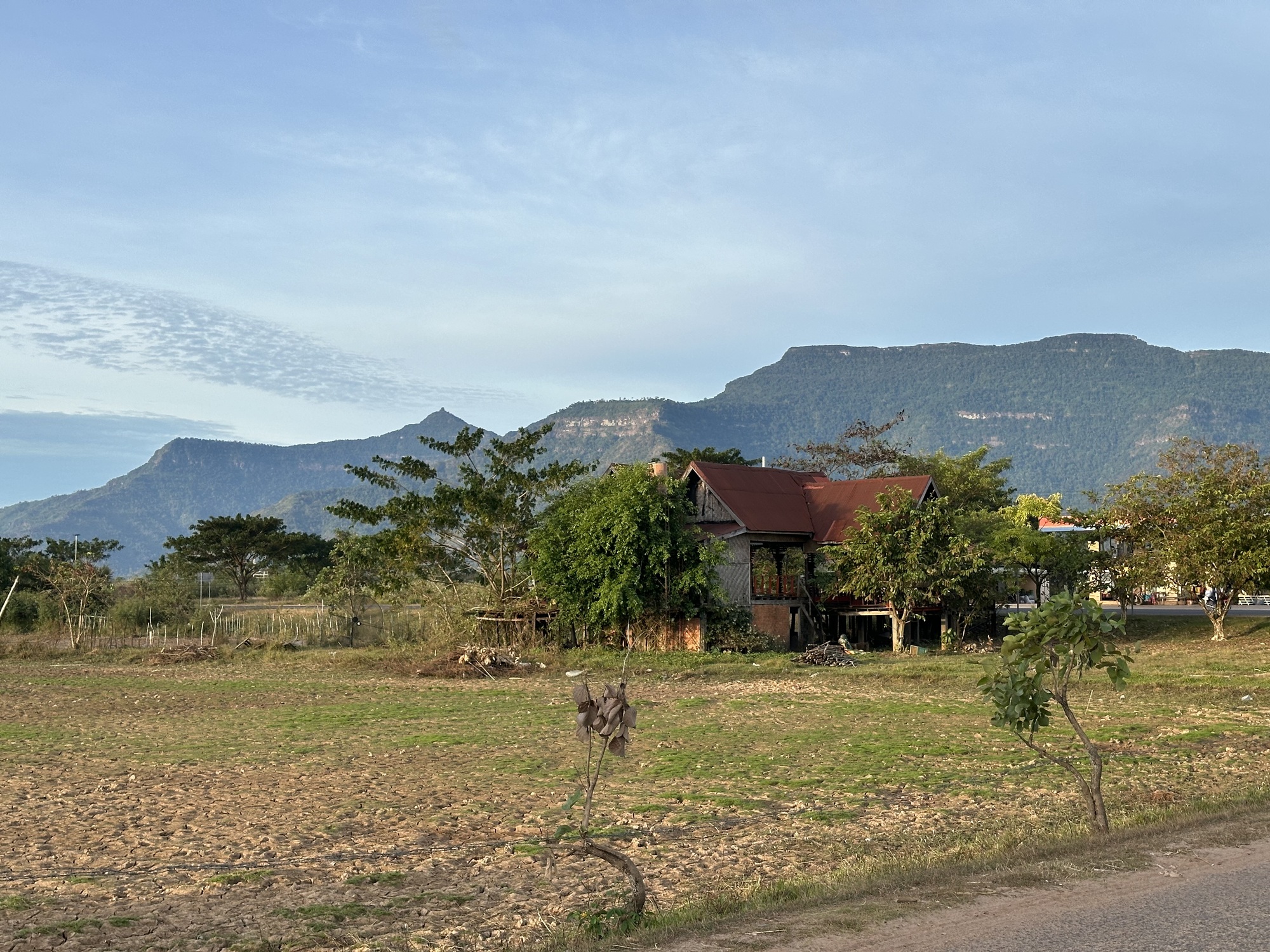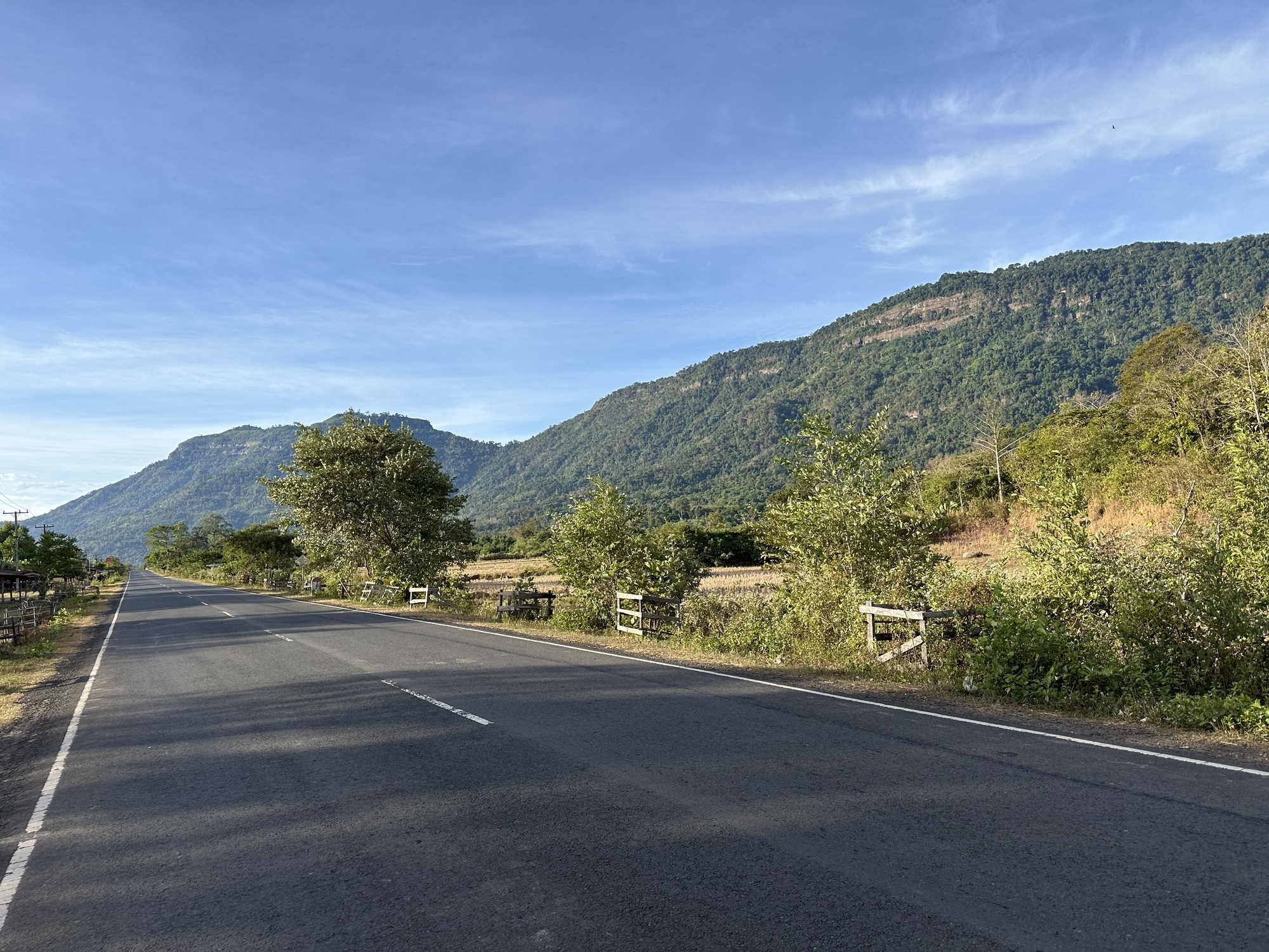 The valley north of Champasak is really beautiful, with a striated ridge of jungle mountains to the west. On our flight leg from Bangkok to Tokyo in January we flew a bit north of here and had an entire view of the mountains and valley and the Mekong. We had some real concerns about the cold wind coming from the north but it was calm for at least the first few miles, the highway was in good shape, we rolled merrily along.