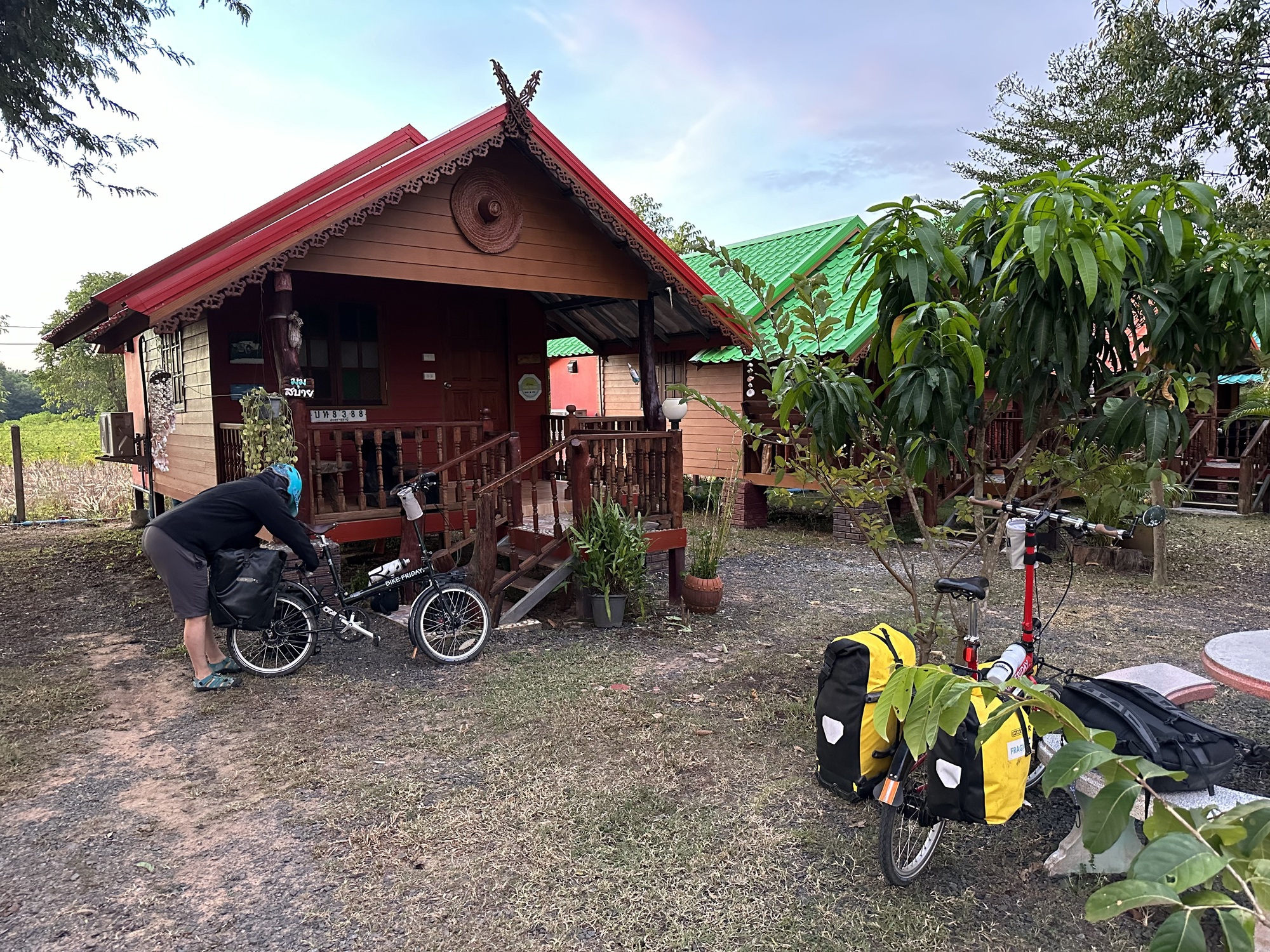 It’s tiring and stressful to cross borders. It’s tiring and stressful to ride 40 miles in a strong wind. It was Christmas Eve and we hadn’t seen a place to buy a SIM card at the border, or change money. We had leftover baht for the guesthouse but their restaurant menu was insanely overpriced with fancy food we didn’t want. Our little bungalow was cute, the kind we like, but… no WiFi.