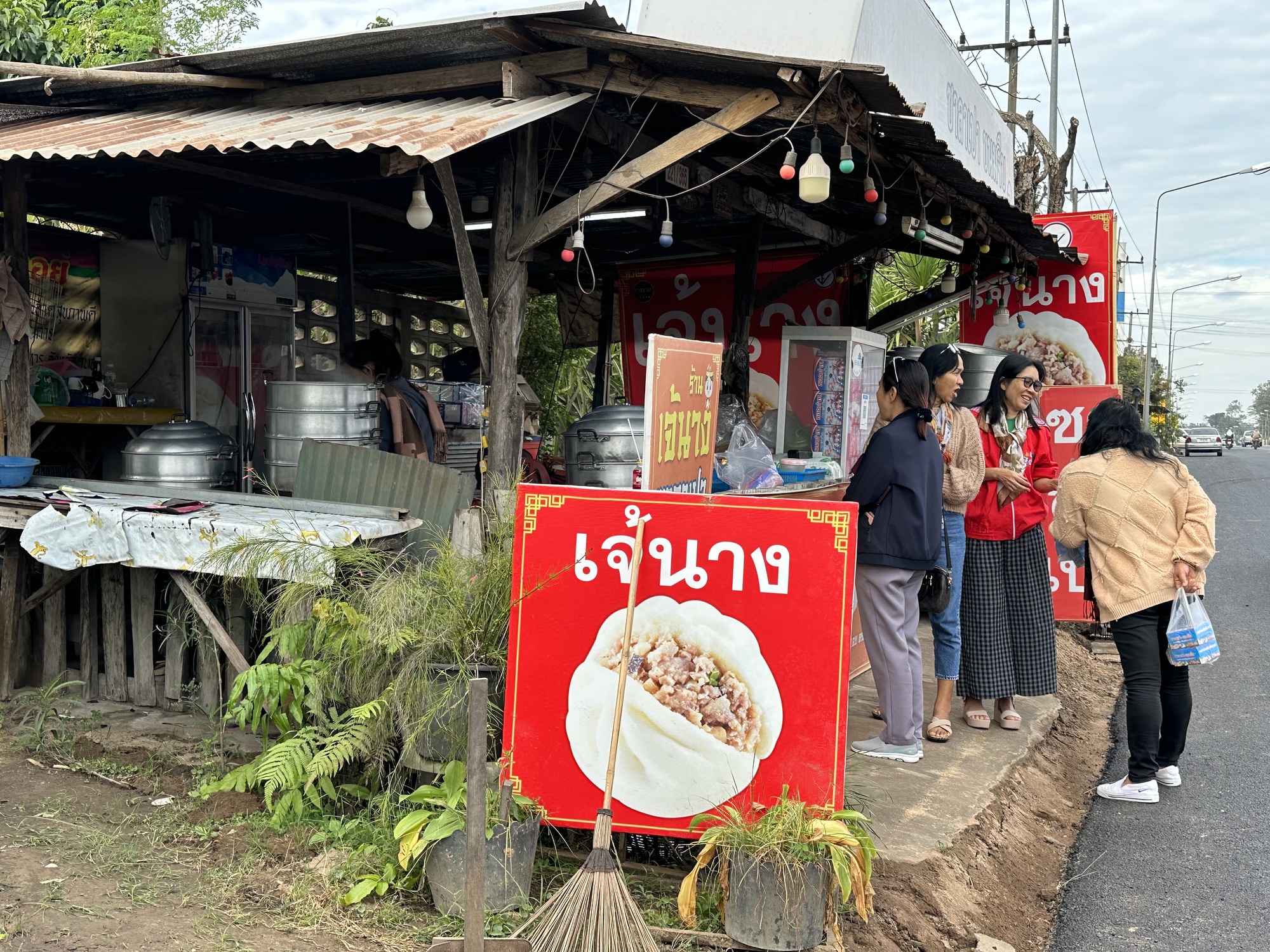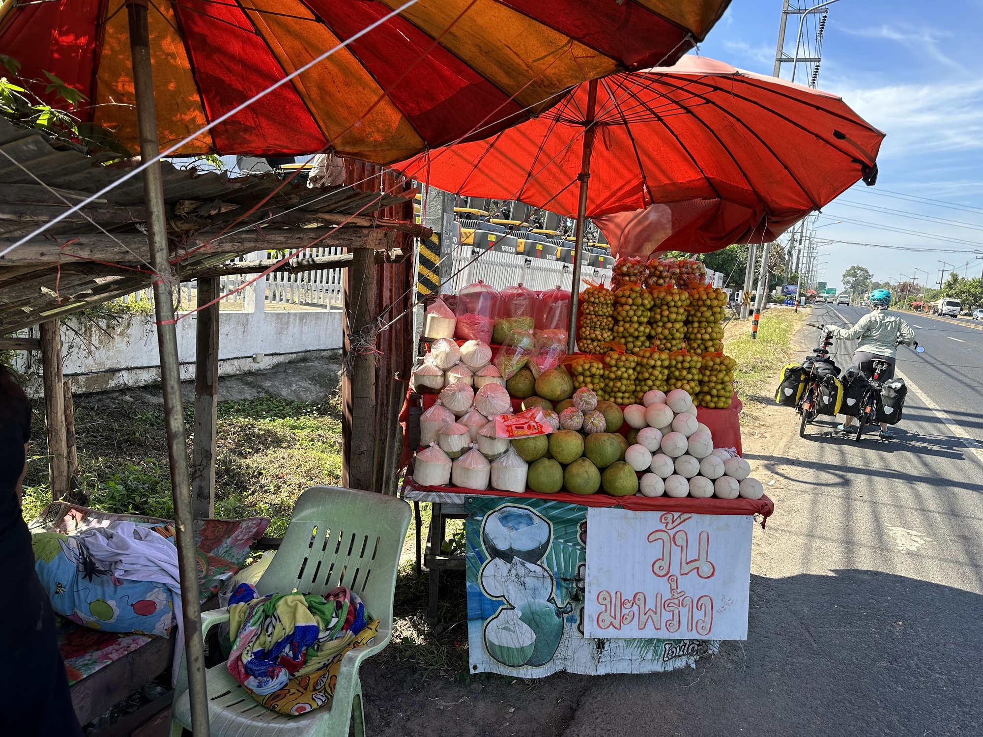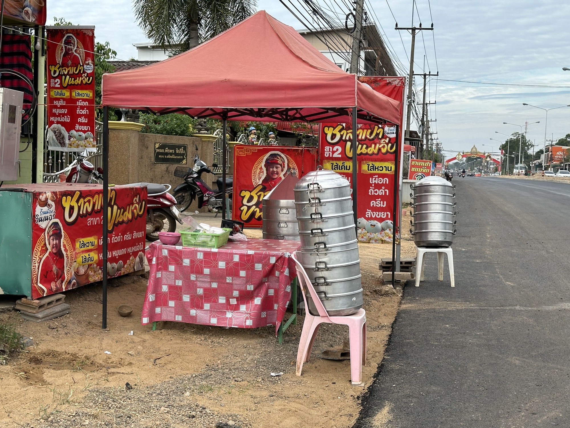 We had decided to ride to Ubon, which is on a road straight west with plenty of traffic but a wide shoulder. The wind would be mostly behind us. First we had to negotiate some construction and dirt, then we went through the bao OTOP area. To refresh your memory, OTOP in Thailand is a program for areas to promote their regional products, it stands for “One Tambon (district? Town?) One Product”. You see it everywhere, stand after stand, one after another, selling the exact same thing whether it be oranges, peanut brittle, rice cakes, or in this case, bao, the steamed Chinese buns. We kind of wanted one but ended up passing them all by. Baw ao bao, one of my favorite Thai phrases (“I don’t want a bao”).