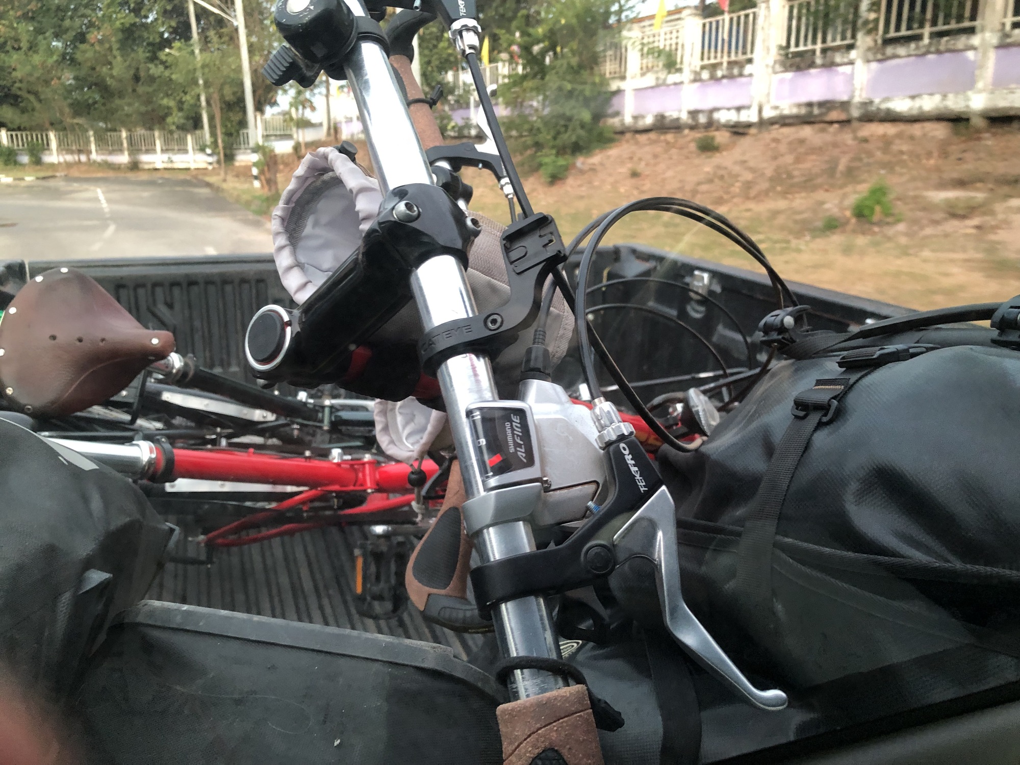 The panniers were loaded into the back of the pickup, then the bikes, then we were loaded into the cab, then off we went to Phibun. The driver dropped us off at the bus station near the market, right at school rush hour, it was nuts. He’d been shy and silent the entire drive except for taking a few phone calls, but at the end he wanted a photo of us with the bikes, and gave us a big smile.