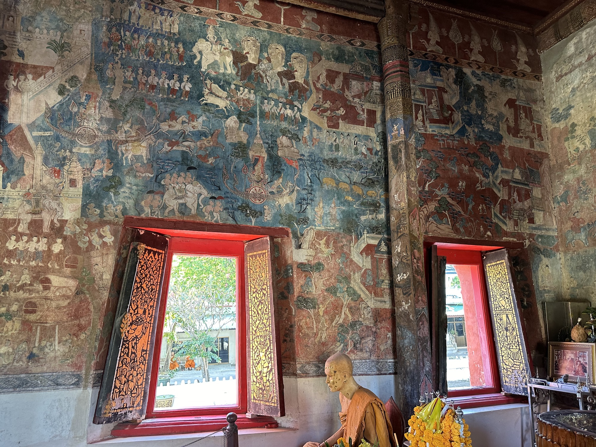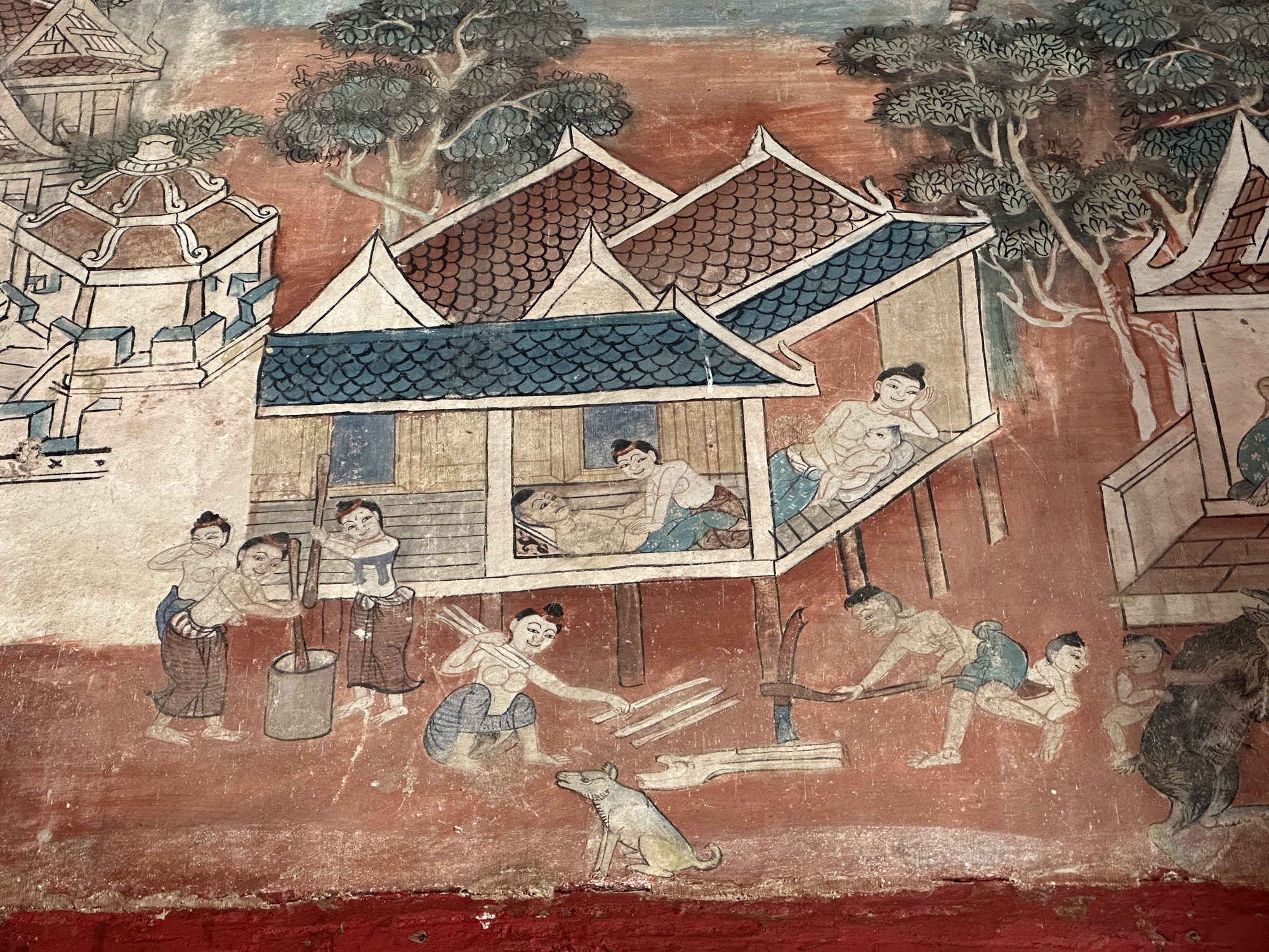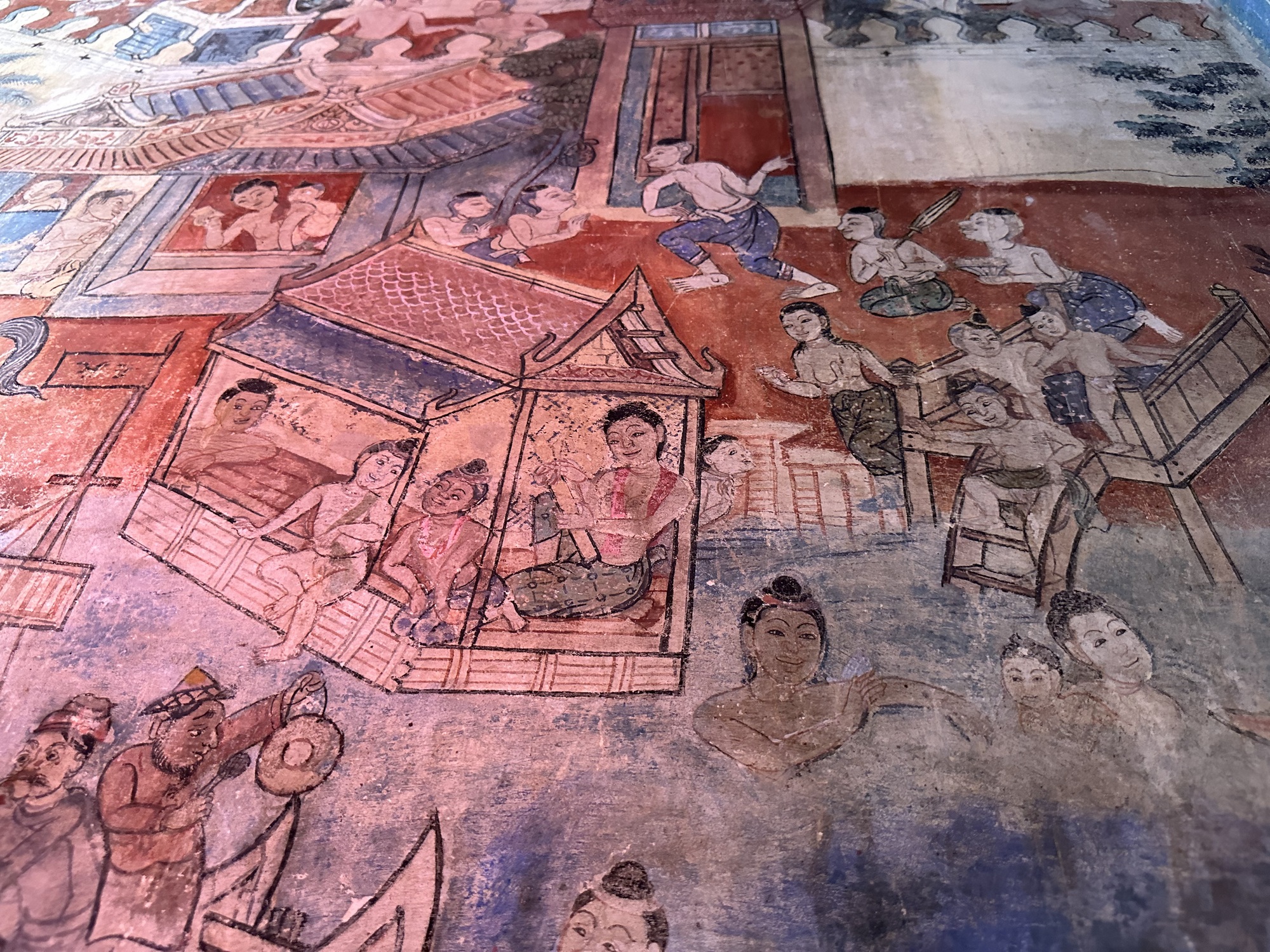 While we were there I noticed the temple building itself looked quite old. Inside, to my surprise, the walls were completely covered in paintings depicting village life from a couple of hundred years ago. I love these sorts of detailed paintings so I was thrilled to discover them. Everything I had previously seen written about the temple had focused on the wooden library in the middle of the pond but the temple was even more interesting to me.