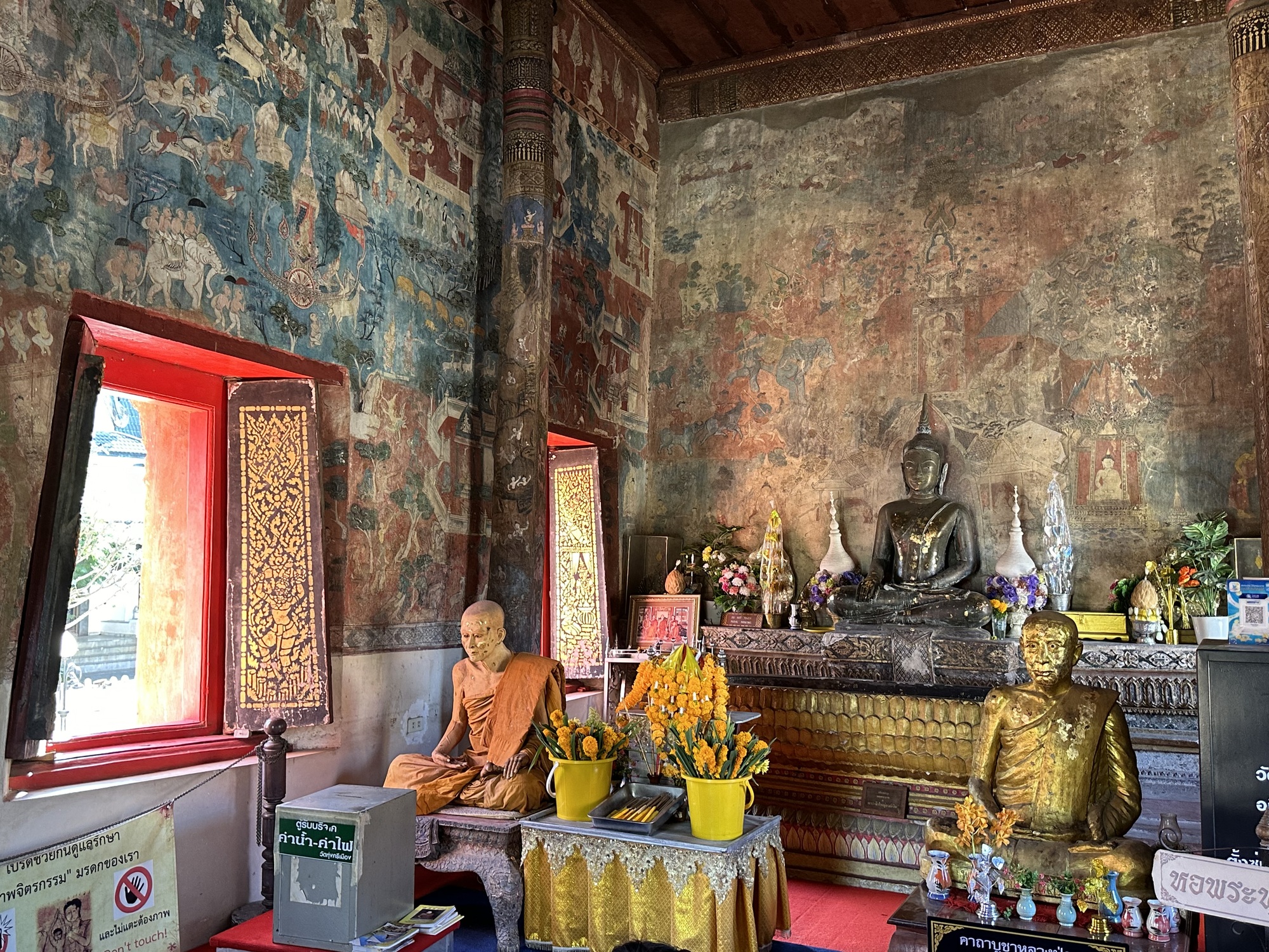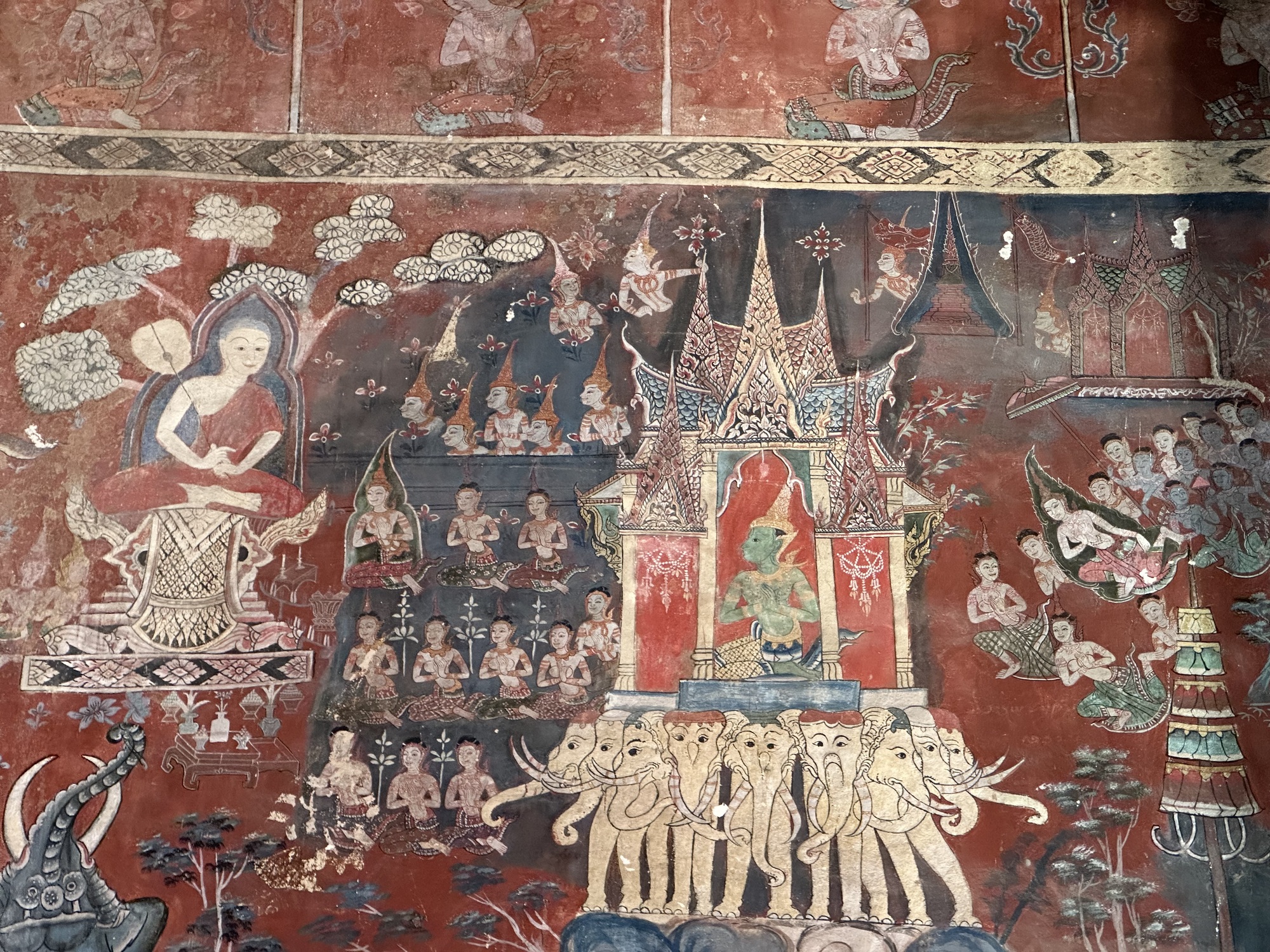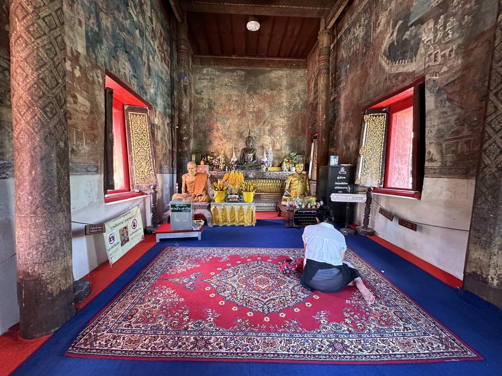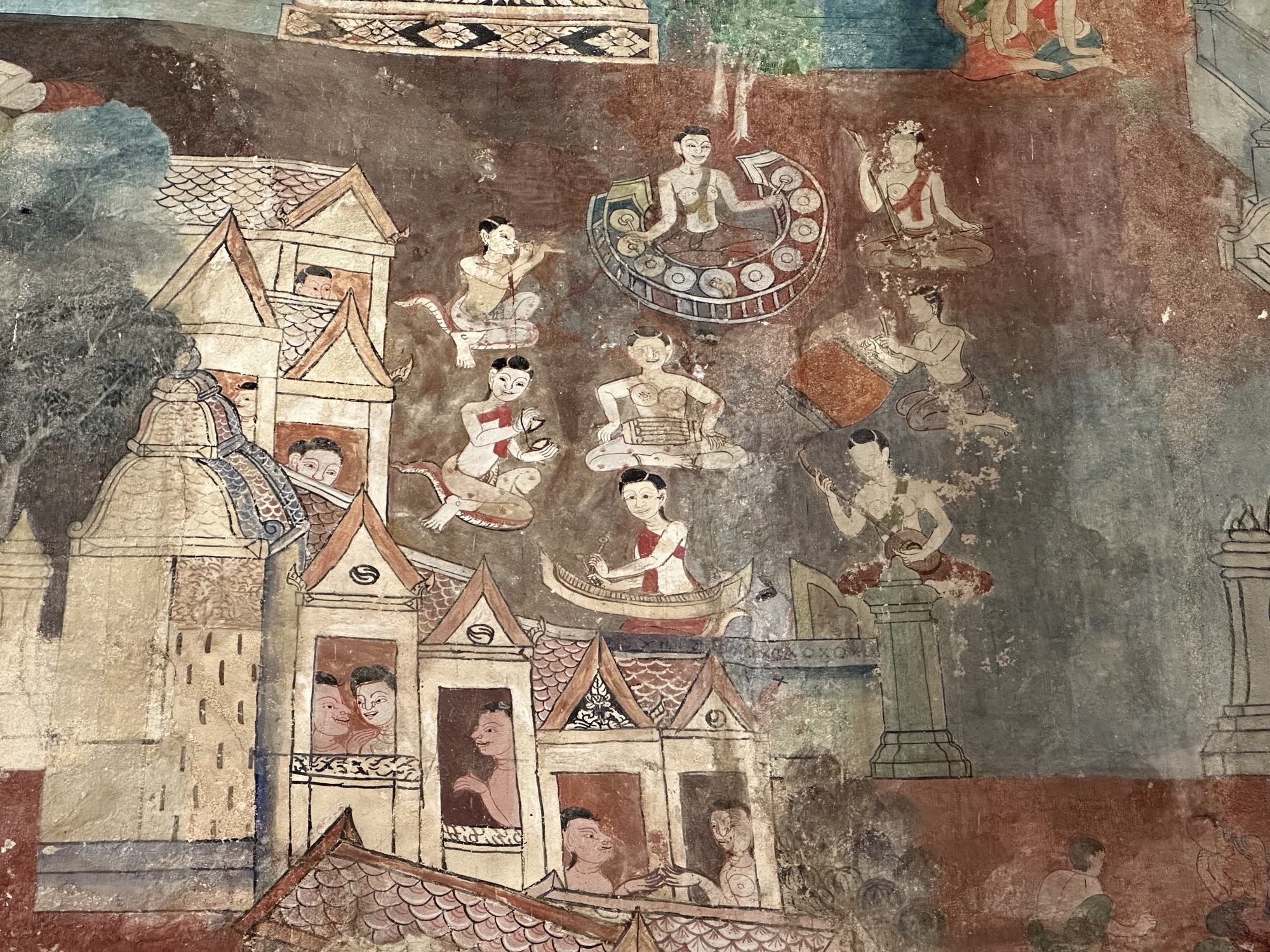 While we were there I noticed the temple building itself looked quite old. Inside, to my surprise, the walls were completely covered in paintings depicting village life from a couple of hundred years ago. I love these sorts of detailed paintings so I was thrilled to discover them. Everything I had previously seen written about the temple had focused on the wooden library in the middle of the pond but the temple was even more interesting to me.