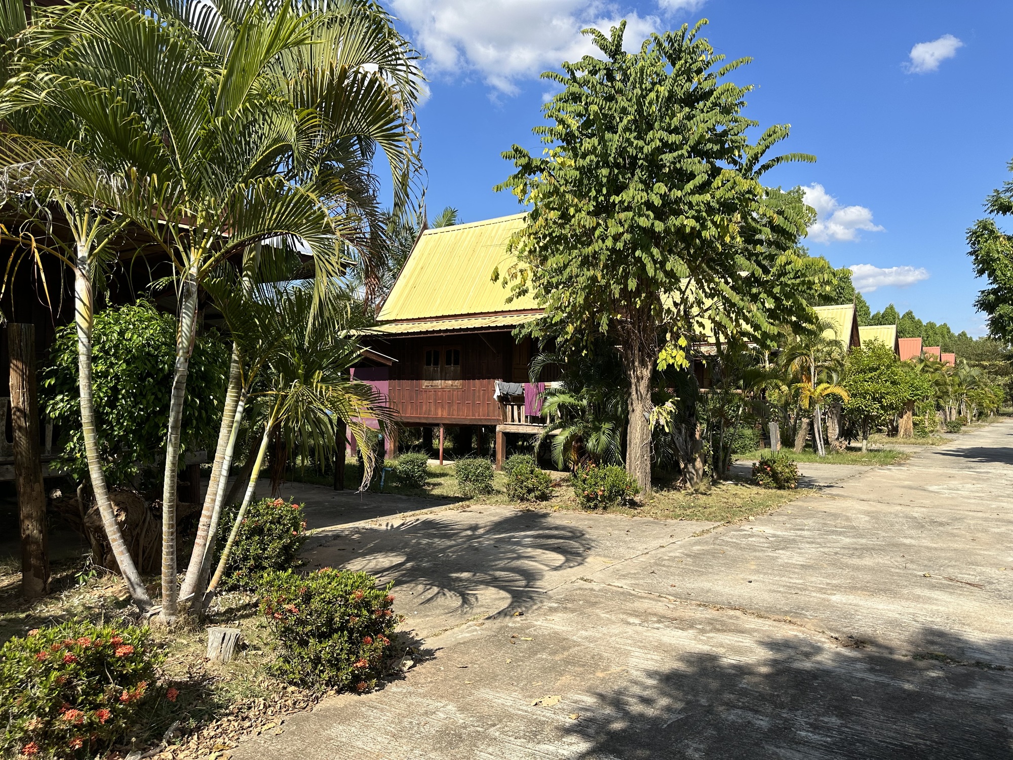 Oh yes, the ride today.....It was another nice ride on more small roads along more just-planted tapioca fields with lots of lone trees dotting the landscape. We also had some time on a bigger road with still more people driving home from their New Year's holiday. Driving too fast usually because Thai cops don't do anything about speeders, nothing. That's why we always make an effort to find the small roads or even roads in poor condition because they will be avoided by most people. It was a similar day to yesterday on country roads, always looking for the cutest coffee shop or restaurant but most things were closed or didn't exist in the first place. It seemed that we were so far out there that we had found a food desert; no restaurants. We did find a papaya on a table in front of an old woman's house but that is for breakfast. We did find some iced coffee just before the guesthouse we had marked but a restaurant eluded us.