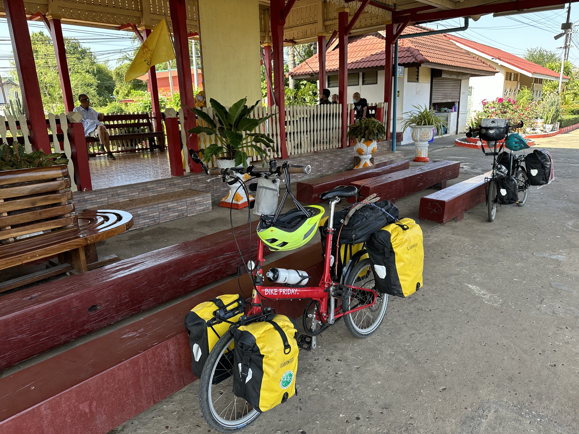 Pulling into Hualamphong station was completely bizarre. No more bustle of numerous trains and crowds of people, ours was the only train, there was a sleepy looking security guy at a table, the main station was closed. We de-trained our bikes and panniers, got everything loaded, and then walked the very short walk to the hotel we like to stay at, right across the klong from the train station.