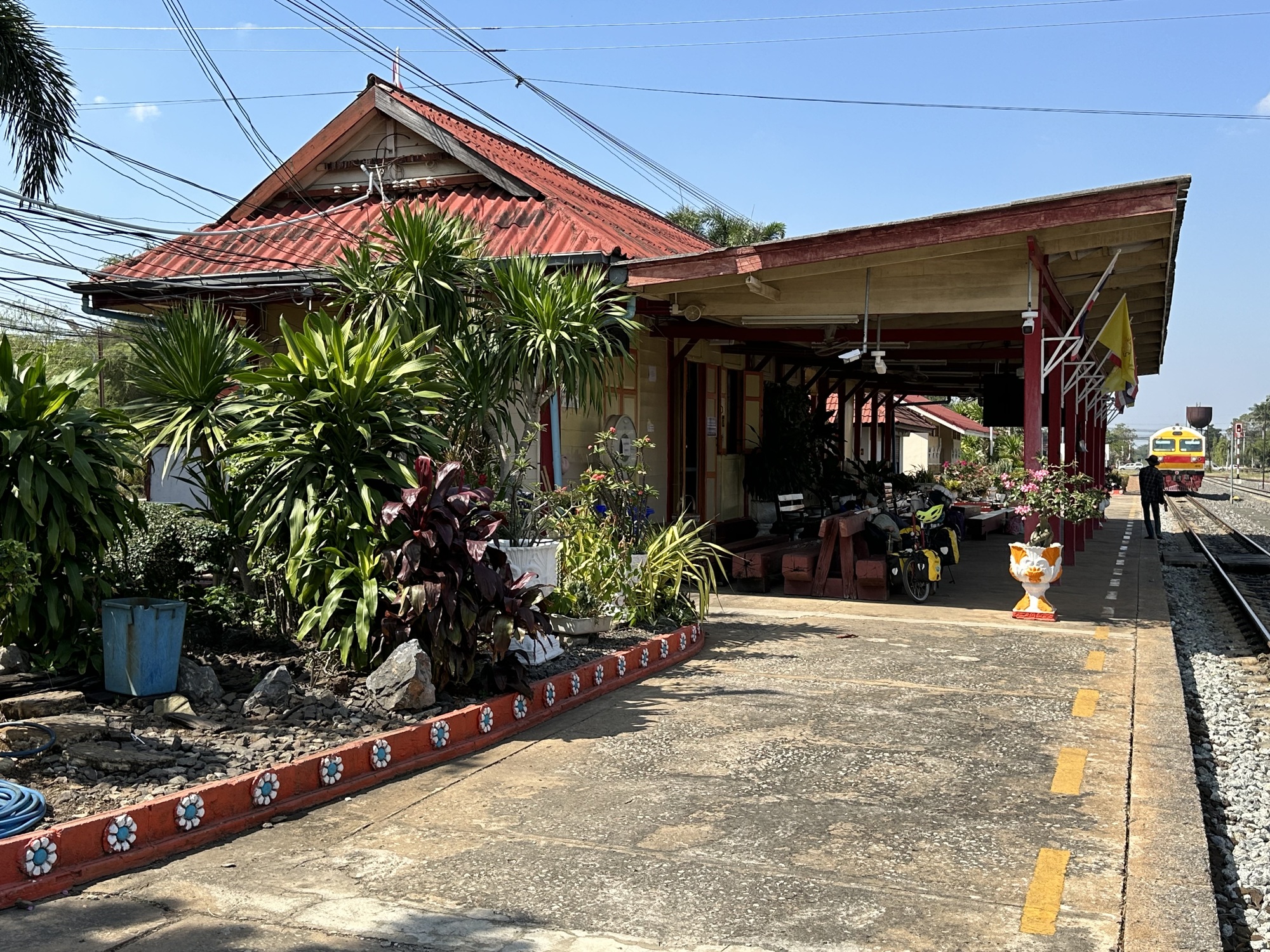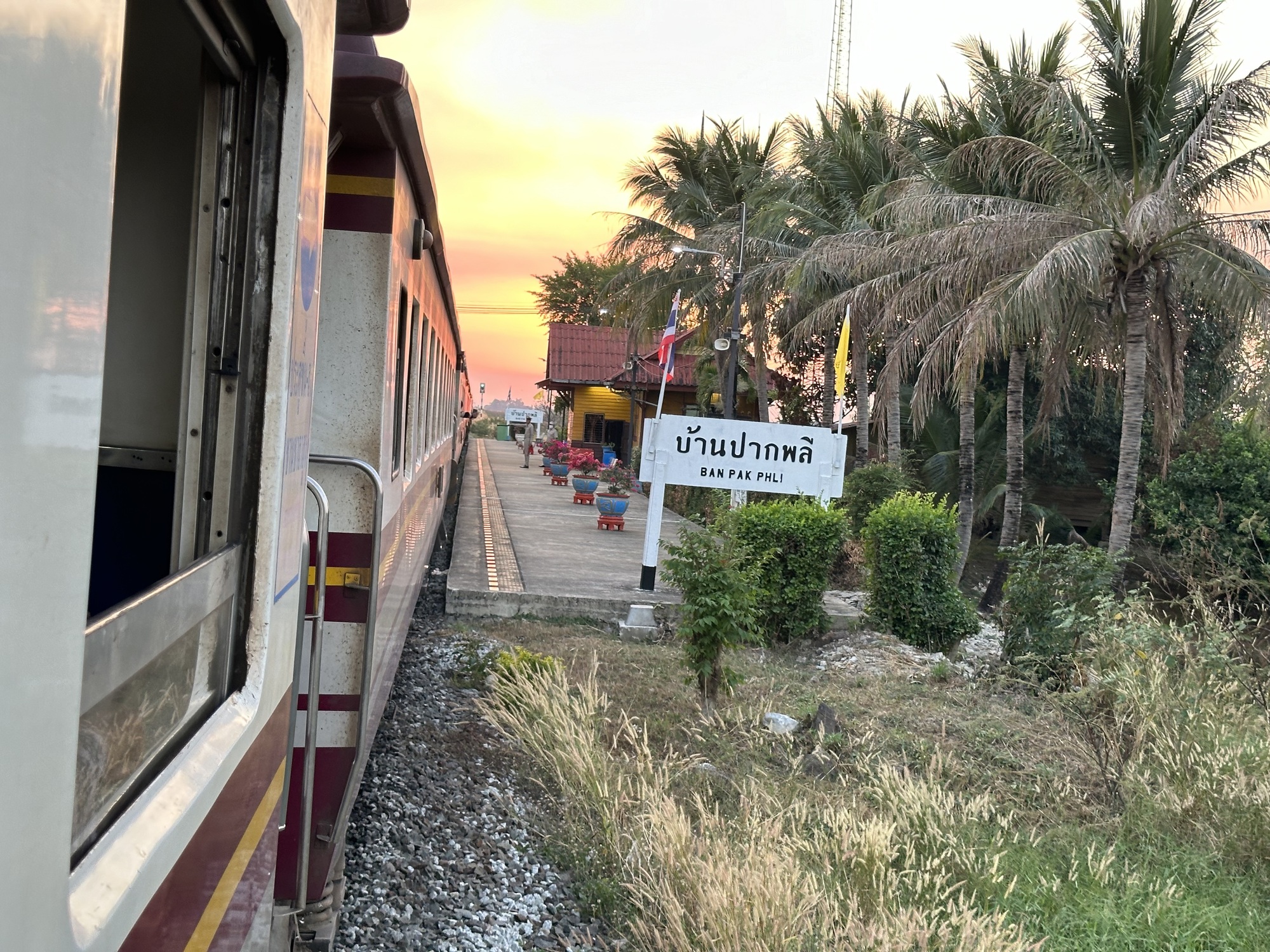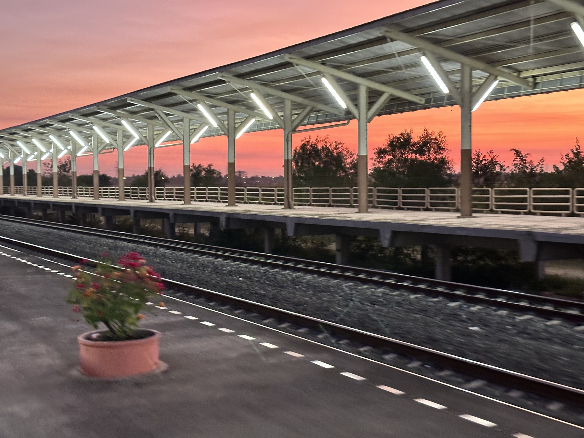 Aranyaprathet’s train station is adorable and adorably kept with a lot of potted flowering plants, nice clean bathrooms, benches that get dusted. We looked at the posting by the ticket window, yep, a train was leaving at 2:56pm, arriving in BKK after 8pm or whenever it got there. It was 10:30 am and getting hot. We decided to go for it.