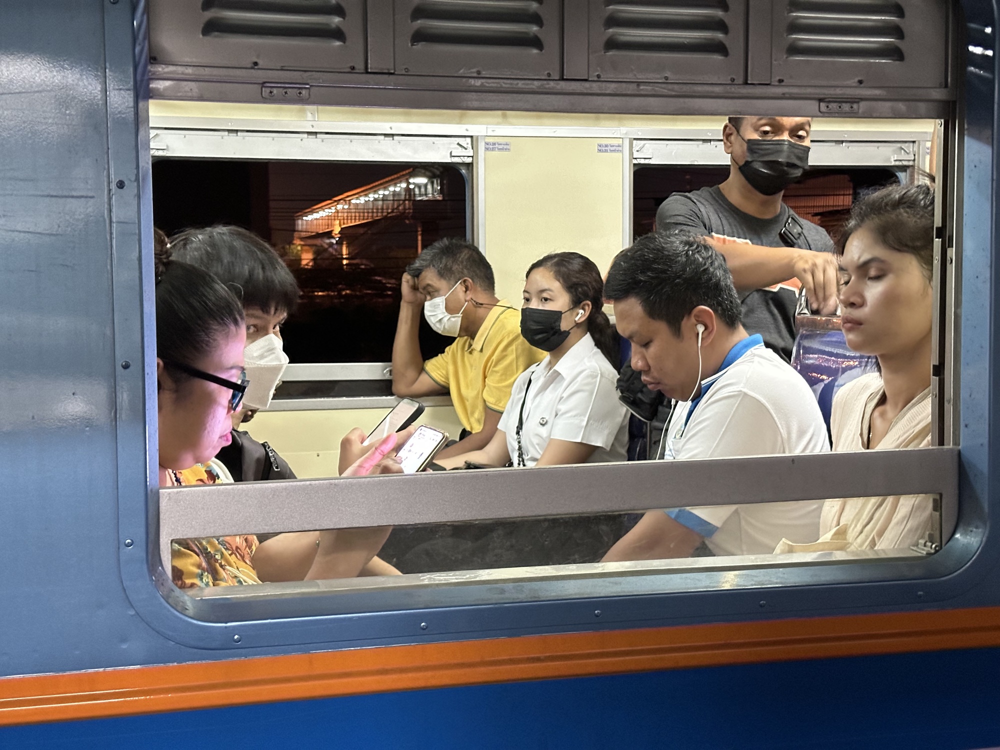 At a stop in Chachoengsao suddenly the train filled with younger passengers, students that went home from university at night. Young louts gathered between the cars and smoked and laughed, and as we drew close to the city the stops got more crowded.