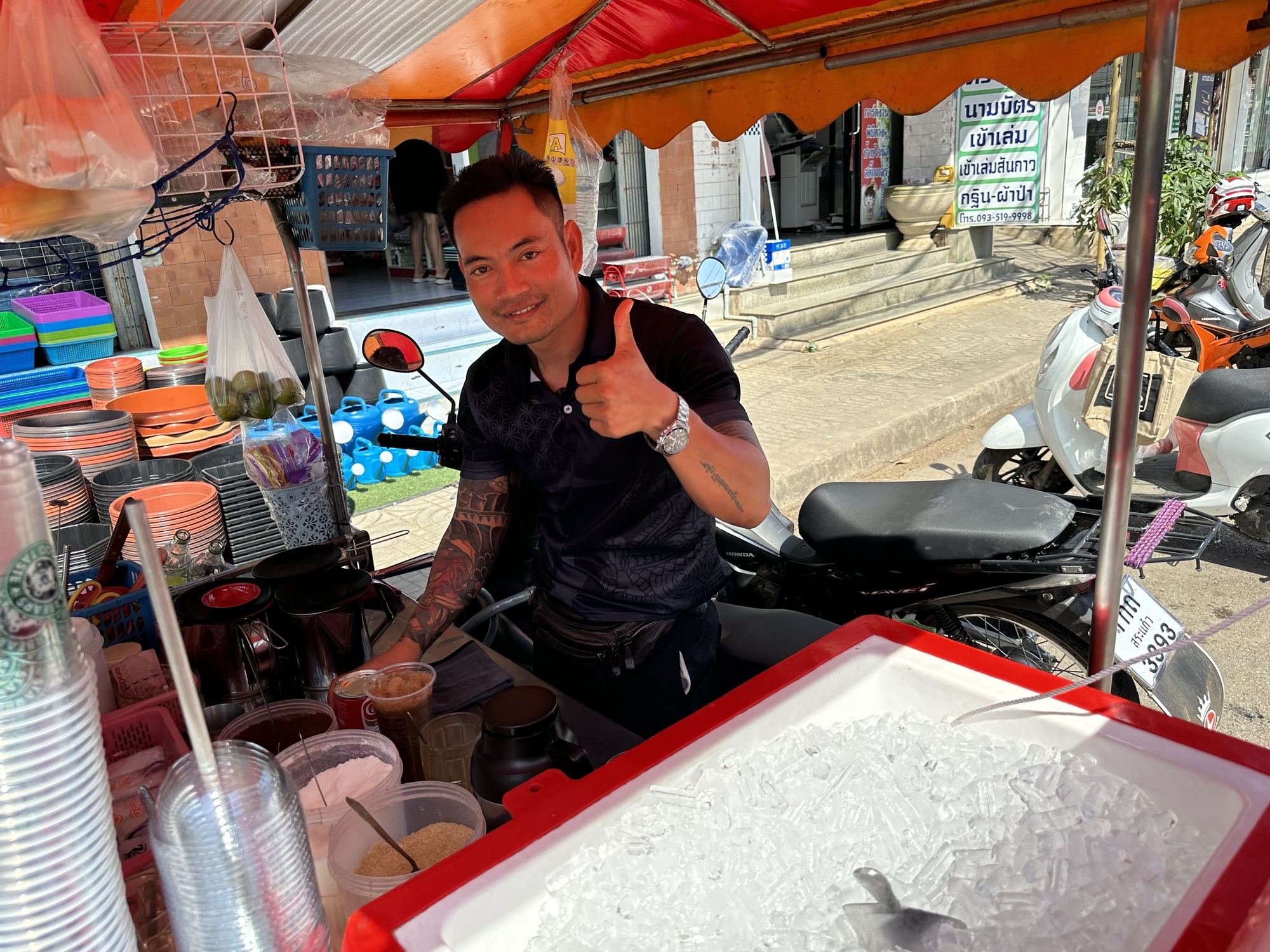 But first we made a foray into town to scout out some food and sat down in what appeared to be a former city market that now only housed three or four eating places that all shared the same tables and condiments and dishes/silverware. Perfect. Inflation hasn’t eased yet in Thailand, 50 baht is now a standard price for standard Thai dishes like fried rice or noodles, even in a market setting. Bruce chose some tray food and I ordered my new fave of this trip, pad si ew.