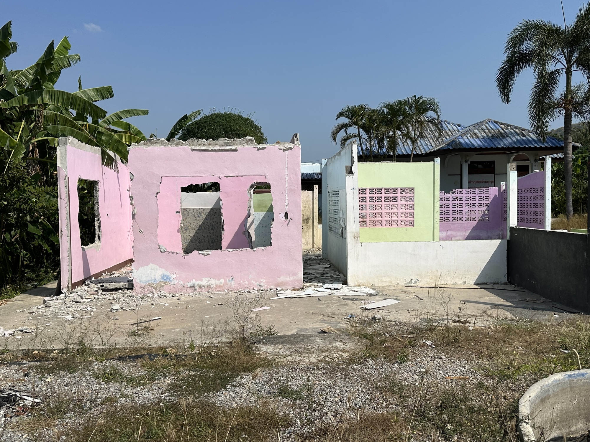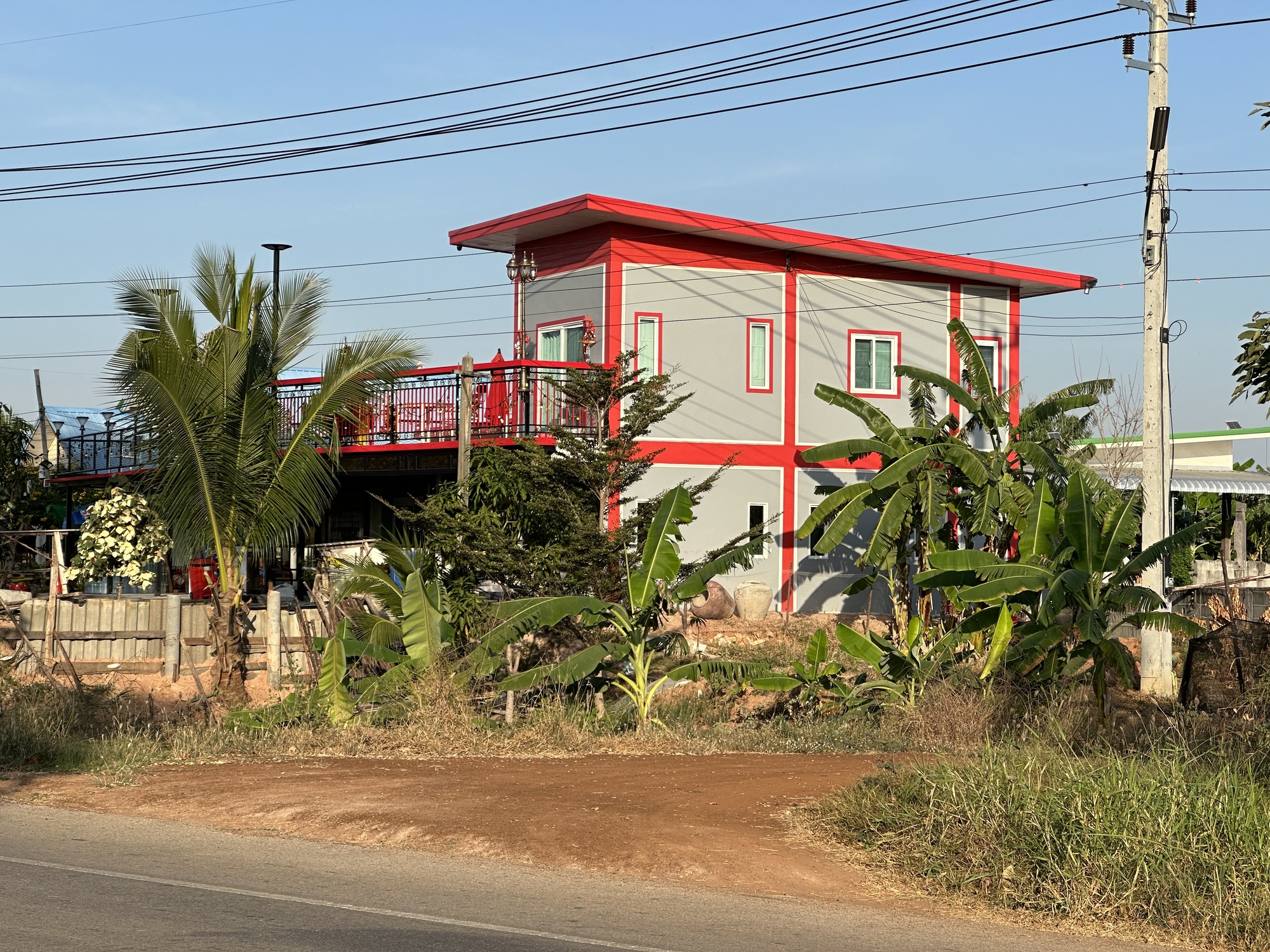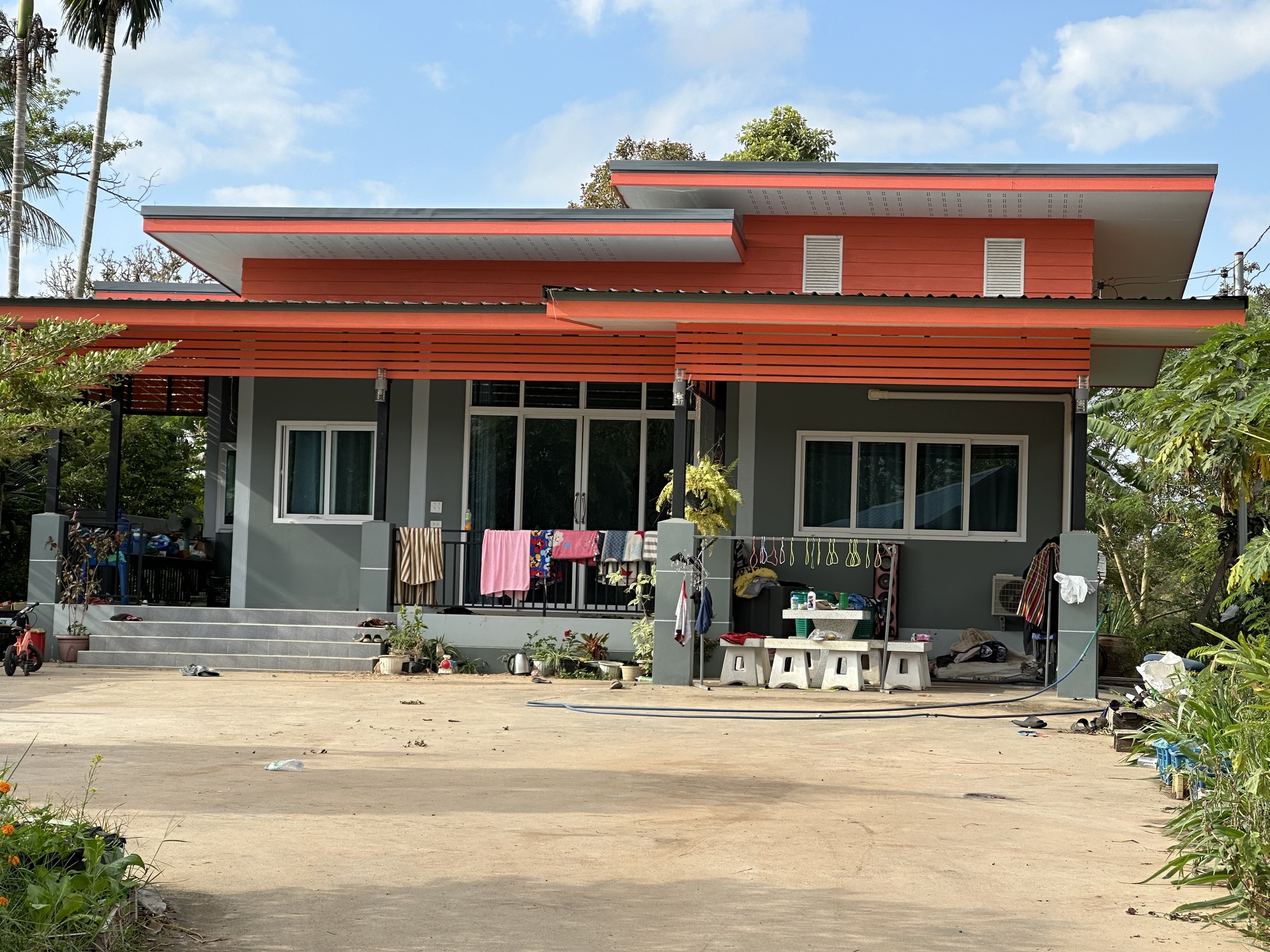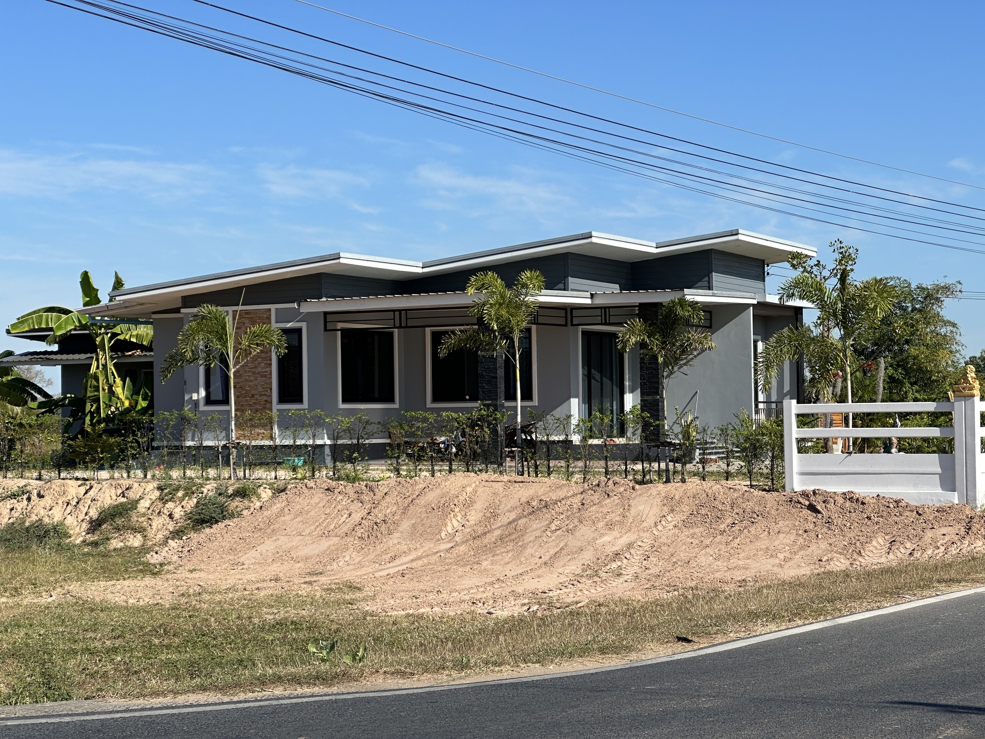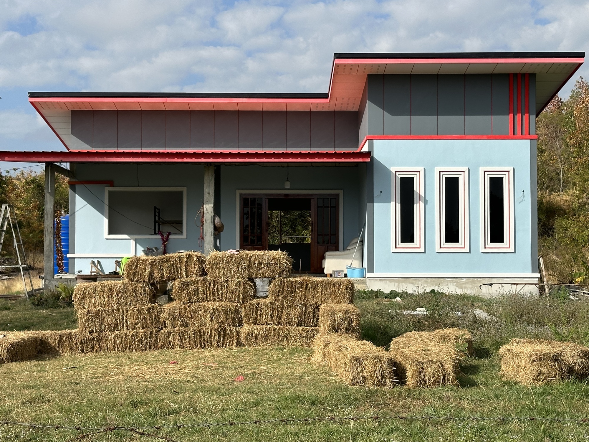 The totally modern Thai house in the country. It is probably relatively cheap especially with the shed style roof. You see these shed roofs everywhere now. (Seriously, it's called a shed roof as opposed to a pitched roof style.) This shed roof is a phenomenon in Thailand in just the past few years. It is almost all they build now.
