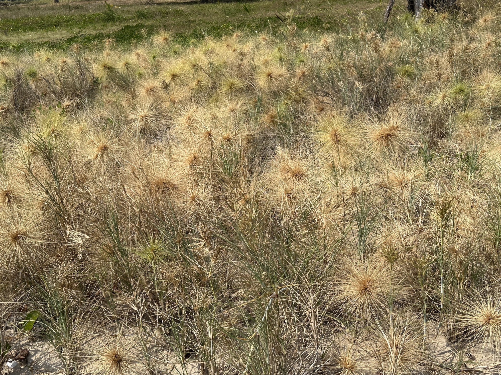 We started out but he soon steered me toward the tall grasses on the dunes that had large balls of torture spines that looked like they would pierce skin very well. Murder ball grasses. I had never seen such grasses. Just in front of the grasses was a group of about fifteen long spiral shells stuck vertically in the sand all in a little square. The man dropped to his knees and suddenly produced a GoPro which he pointed at the shells close up. He held it there for about a minute as I stood wondering what was going on. Finally he said something, "Timelapse." He didn't move his head, just said it really fast as if his speeded up words were mimicking a time lapse visually. It was just weird to me. I was wondering what was moving and finally decided he was the one moving ever so slightly, as we all do, and I wondered if that would produce a cool effect. He did his "Timelapse" for another minute as I took some photos of his little shell art project which he obviously wanted me to see and then he jumped up never looking at me again and disappeared into a nearby house, the only house around. I was left wondering if I had come across another planet - Planet Timelapse. The sound of waves, the odd sound the koel makes, the constant breeze bobbing the murder grasses, the heat, spiral shells, salty humid air and the guy who didn't speak, I was in an alien place.