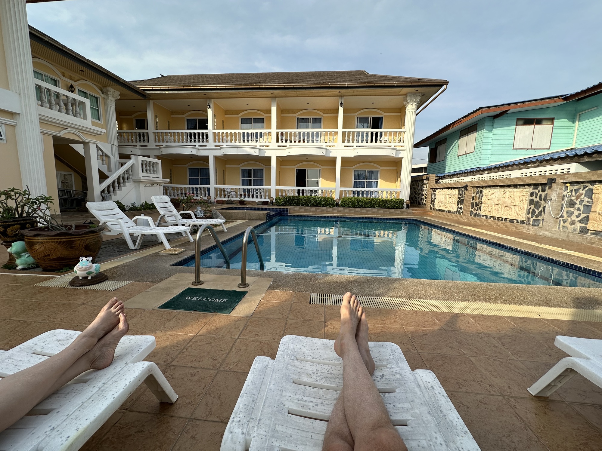 While we first tried to get a room at the homestay we were in the last two times we were here, they were full for the week so we went next door and got the cheapest room in the house which is still a bargain. Spotlessly clean, lovely hardworking staff, a beautiful small blue pool, coffee and such in the morning. The Sun Beach Hotel has been part of the reason we just seem to stay on here in Prachuap. Tonight will be our sixth night here, we are definitely leaving in the morning (we say that every day).