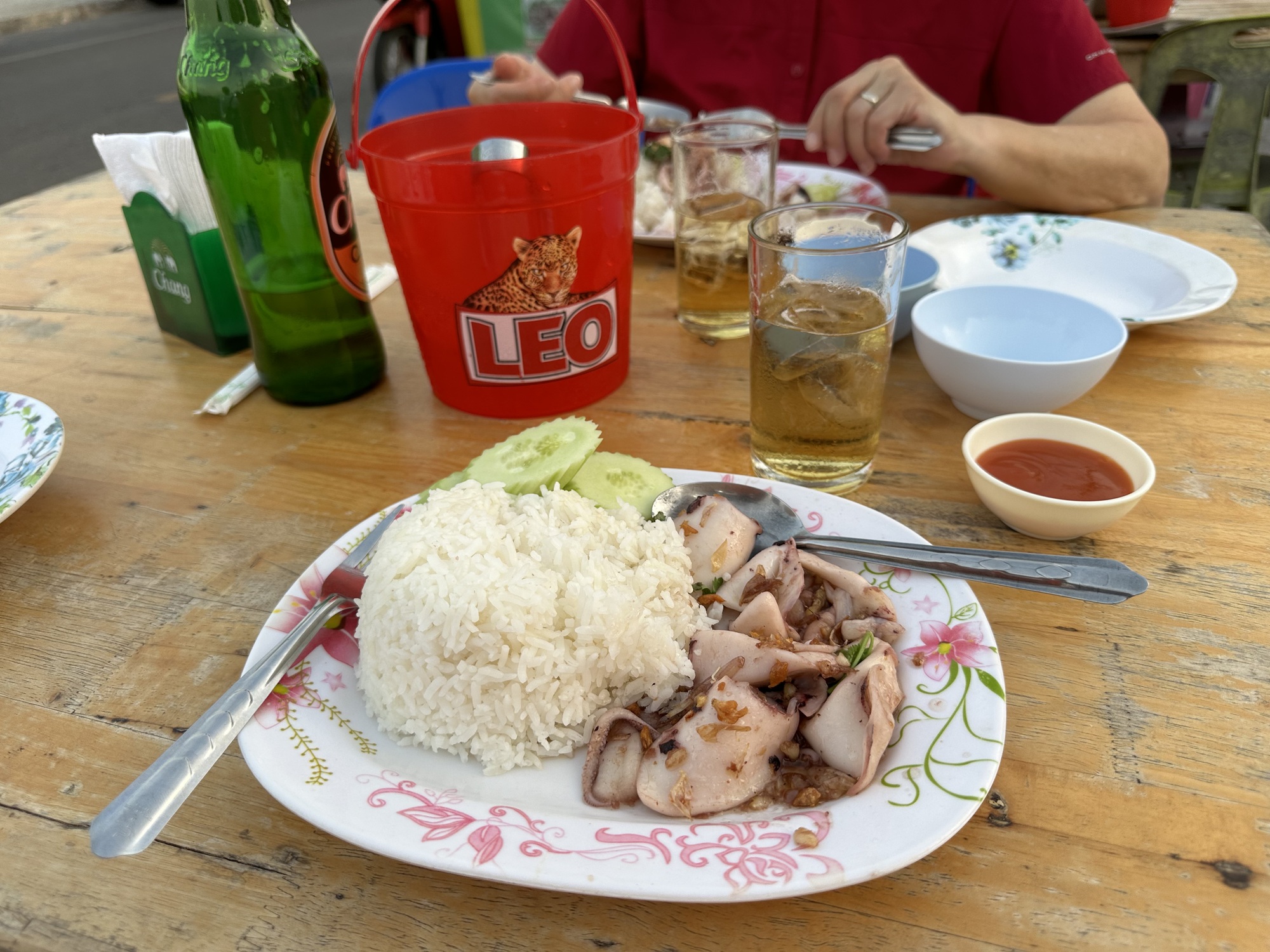 We eat our muesli in the morning, go have coffee and ‘khanom’ (sweet pastries/biscuits) in the front lobby, go out for more/better coffee with ourselves or others, walk back to our hotel, swim and cool off again. In the evenings we go out to look for a restaurant. Some are open, some are not, we haven’t had any bad food at all yet. The places along the beach are mostly seafood joints, inland a street or two there is more traditional Thai fare. Like any Thai town that gets western tourists there are western restaurants that we avoid. We’ll get pizza when we get back home.