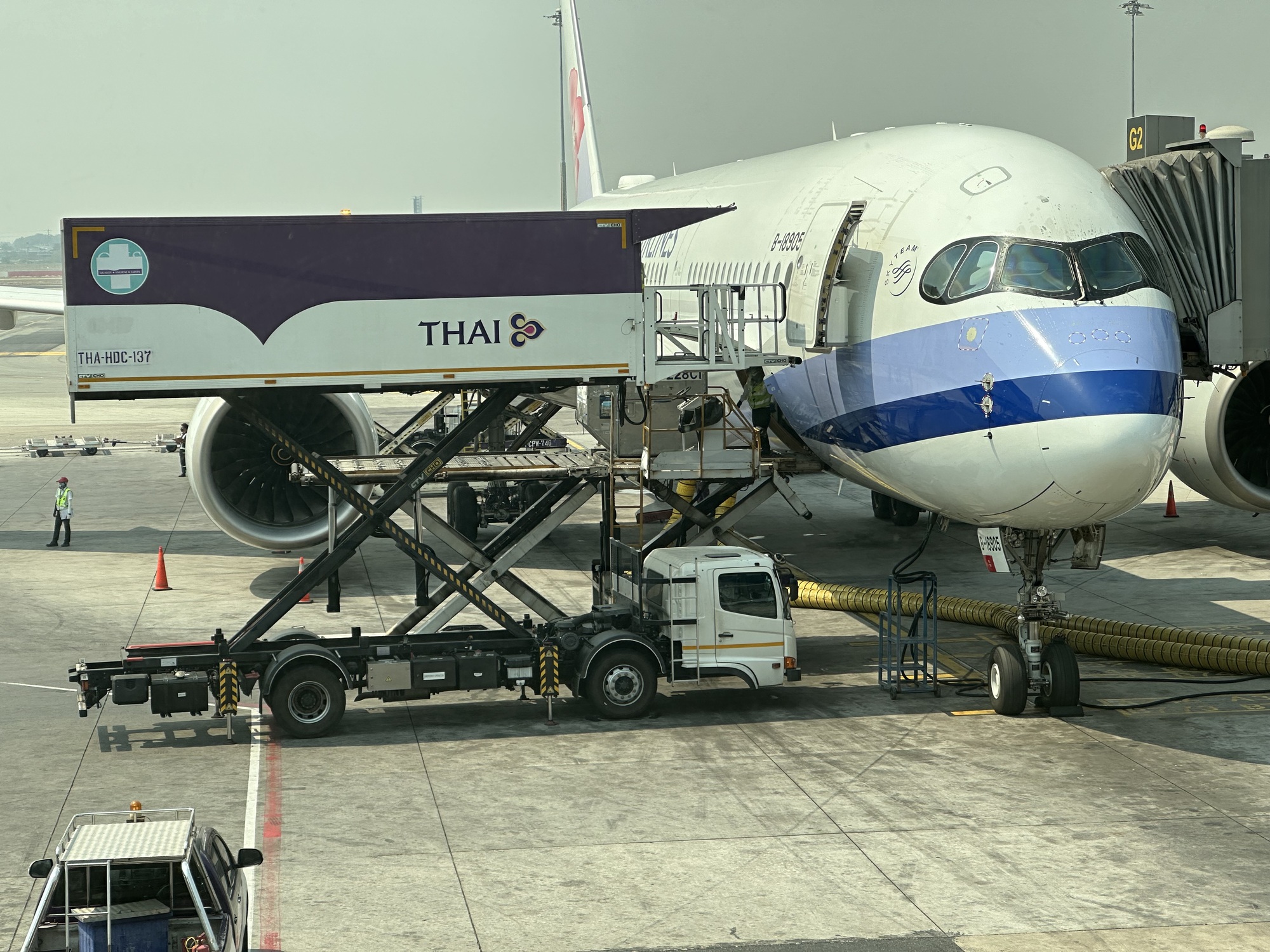 Even with the smaller boxes we’ve used before, we’ve always had to take them to the Oversized Luggage machine, this was the case today, too. It’s not far away, it’s no big deal, but there is more careening involved and more near-misses. Whew. It’s an awesome moment when luggage disappears at check-in and we are free to skip off toward the next tedious travel tiresomeness. Suvarnabhumi has the damnedest flow plan when you leave the country. I mean, we’ve had worse, actually, but still. It’s a fairly new airport and yet you still do meaningless things just to get through immigration. First you go up an escalator and go through security. Then you go DOWN another escalator and line up for immigration departure, in the foreign passport holder line.